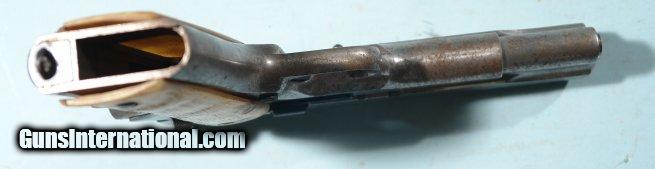 Description: COLT COMMERCIAL MODEL 1911A1 OR 1911-A1 SEMI-AUTO .45 ACP PISTOL CA. 1929. Serial number in the C155,xxx range with slide not matching. Frame and slide in the white with the safety, hammer, housing and slide release original blue. Possible “lunch box” gun as slide and frame look like never finished. Light surface rust but otherwise looks little used. Good working order and excellent bore. Crudely made horn grips. No magazine. Markings are superb and would be great properly finished. SOLD Curio/Relic: Yes |