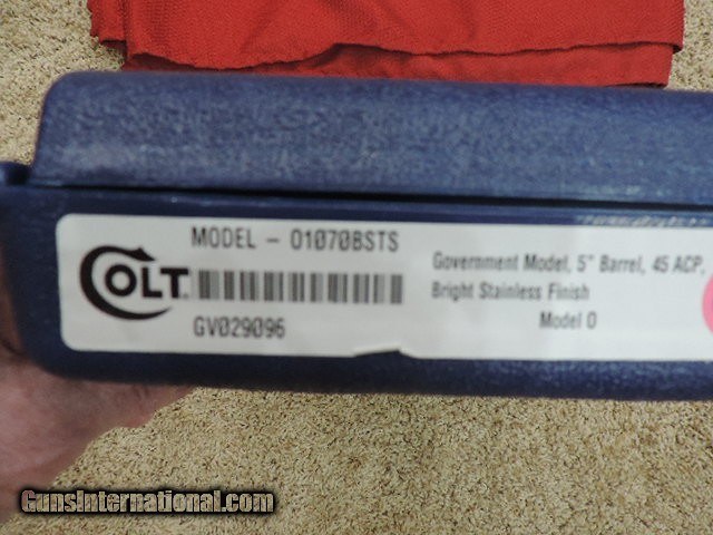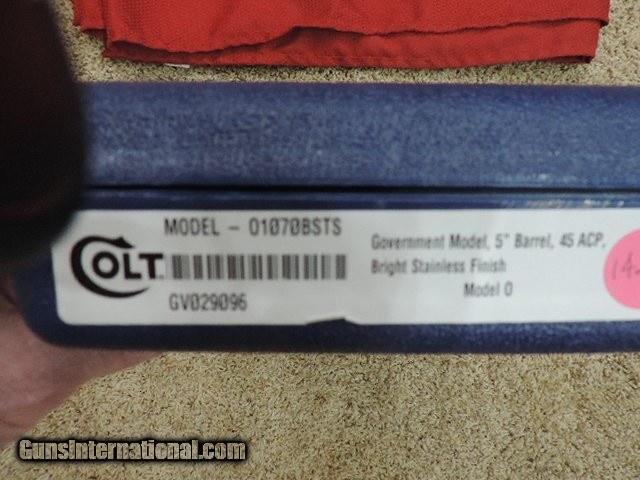 Description: COLT O1070BSTS CUSTOM GOVERNMENT 45ACP - BRIGHT POLISHED STAINLESS STEEL WITH WOOD GRIPS WITH DOUBLE DIAMOND CHECKERING. BEVELED MAG WELL, STAINLESS STEEL TRIGGER, SPUR HAMMER, ONE 7 ROUND MAG, 3 DOT SIGHTS, 5 INCH BARREL. NEW IN COLT BLUE HARDCASE. SUBJECT TO PRIOR STORE SALE. SHIP TO FFL ONLY. BUYER RESPONSIBLE TO DETERMINE IF FIREARM IS LEGAL IN HIS/HER STATE. BUYER PAYS $40.00 SHIPPING TO LOWER 48 STATES. BUYER PAYS 3% FOR CREDIT CARD. ARIZONA RESIDENTS PAY 6.712% SALES TAX. SOLD Handgun Caliber: .45 ACP (.45 Auto) Manufacturer: COLT Model: O1070BSTS Serial Number: GV02XXXX Barrel Length: 5 INCH Condition: New in Box |