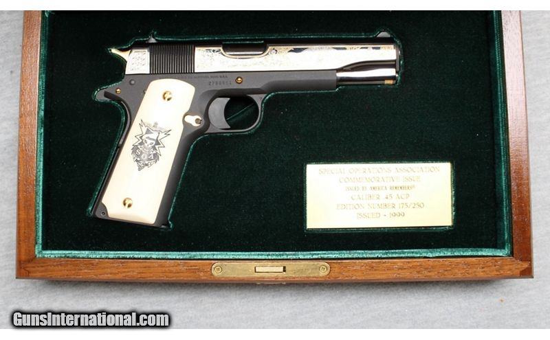 Description: This pistol honors members of the Special Operations Association who served in Southeast Asia. It has the standard commemorative markings with "175 OF 250" engraved on the underside of the slide and standard Model 1991A1 features. It comes with a lined display case topped with glass specifically for the SOA tribute gun. .45 ACP SOLD Metal Condition: As New Bore Condition: Bright Barrels: 5 inches Triggers: Factory Sights: Fixed Item Location: La Vista, NE |