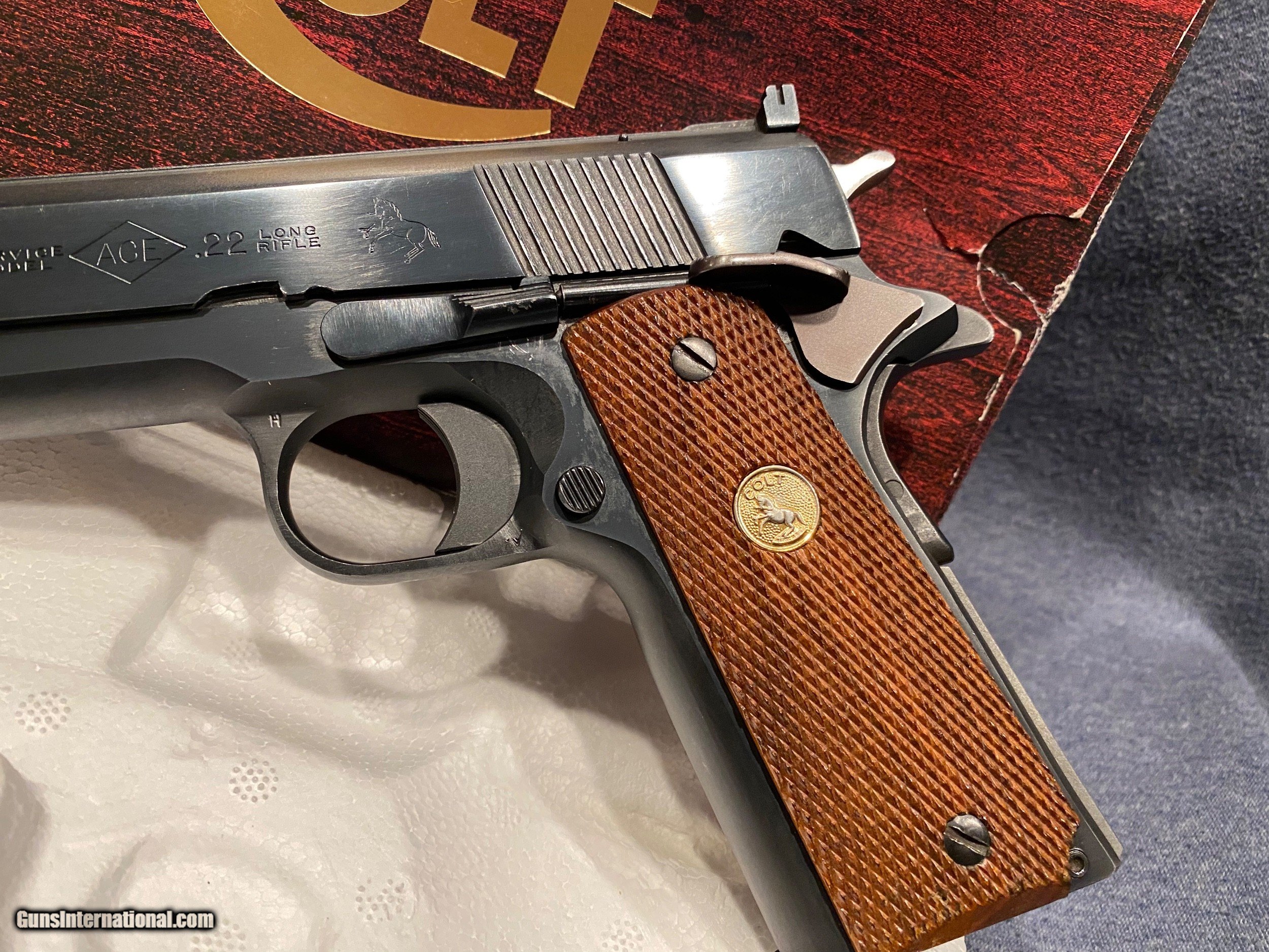 Description: This is a stunning example of a had to find 1974 Colt Ace pistol with adjustable target sights. comes in factory serial number matching box this pistol is a legend and is in near new condition ships 2 day insured from my ffl to yours $85.00. Comes with two magazines the grips are perfect. this is a mint pistol! See photos! These don't come up for sale that often and when they do they are worn. This one is pristine! Not one blemish except for one scratch on the right side of the slide, the rest is flawless Call if interested SOLD |