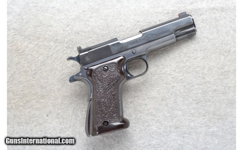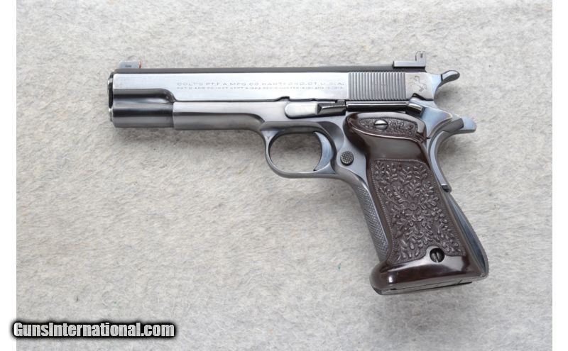 Description: This Colt Model Ace is a right hand semi-auto pistol in .22 Long Rifle Cal. It has a 4.75 inch barrel with a rear serrated slide. A blade front and adjustable notch rear sight. The walnut target grip has a very nice oak leaf design and it has a right hand thumb rest. The trigger is checkered and solid. The front and back straps are checkered. SOLD Manufacturer: S/N 10881 Caliber Info: .22 Long Rifle Chambers: Semi-Auto 10 round magazine. Metal Condition: Good. Has some blue wear. Minor handling marks. Wood Condition: Grips are very good. Bore Condition: Very good. Barrels: 4.75 inch barrel with a rear serrated blued slide. Triggers: Checkered. Solid. Stock: Walnut target grip with an oak leaf design and right hand thumb rest. Weight: 38 oz. Sights: Blade front. Adjustable white outline notch rear. Extras: Comes with two magazines. Item Location: Richfield, WI |