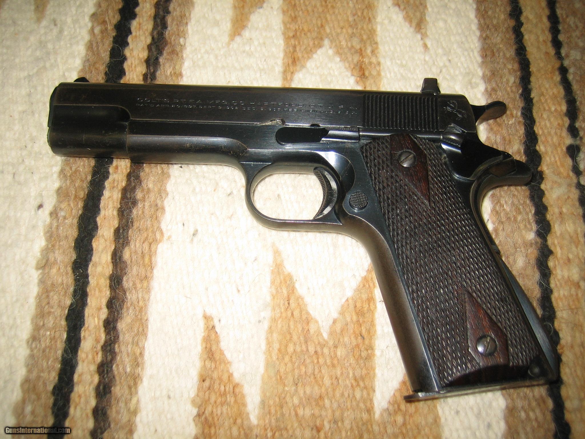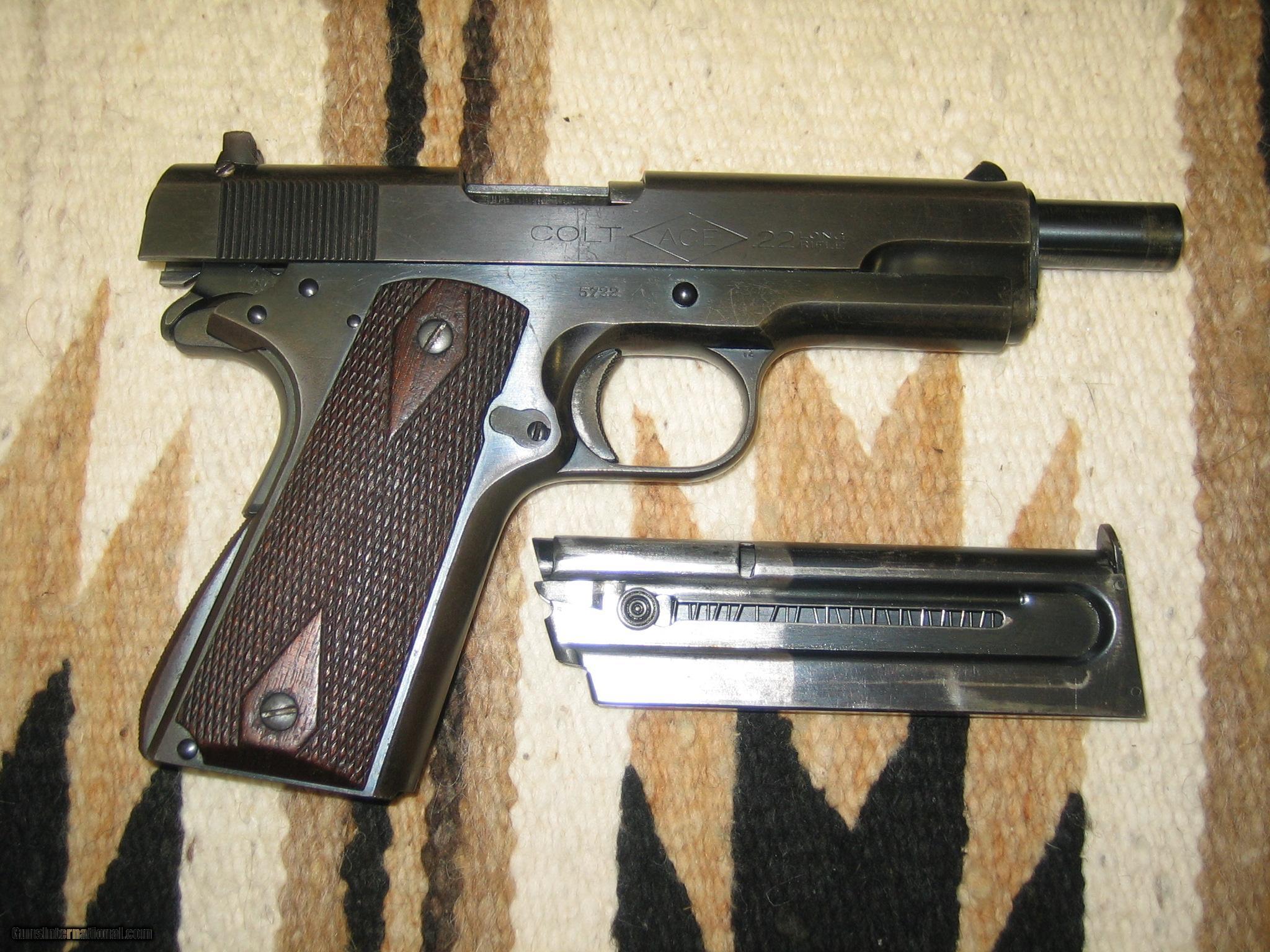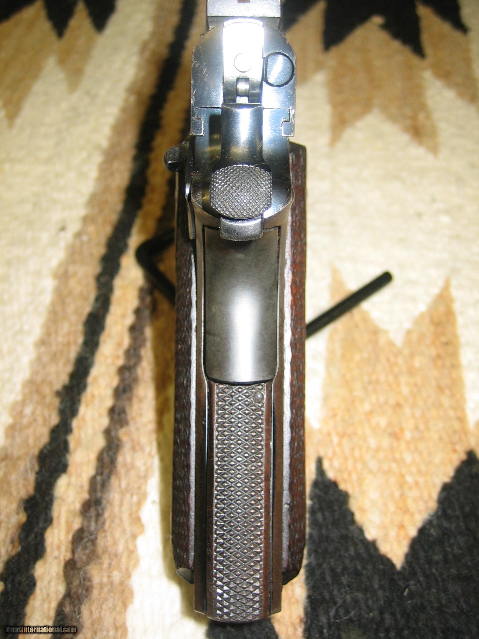 Description: The Colt Ace was introduced by Colt in 1934 as a companion pistol to the Model 1911A1 Government Model with approximately 10,745 Ace pistols manufactured by Colt before production ceased in July 1941. This example was manufactured in 1931. The pistol has the Colt commercial blue finish checkered walnut grips and is complete with the original Colt two tone magazine, it is marked on the floor plate "COLT/ACE/.22 L R". The barrel is blue with a polished chamber. The pistol has an adjustable Partridge target rear sight. The mainspring housing, correctly, lacks the lanyard loop found on Model 1911A1 pistols. The right side of the slide has the distinctive marking "COLT" followed by "ACE" enclosed in a diamond and ".22 LONG/RIFLE". The left side of the slide is roll-stamped with the elongated two line Colt Hartford address and patent dates followed by the Rampant Colt in front of the serrations. The right side of the frame is marked with the serial number "5722" The assemblers mark is on the right trigger guard "12" and the Colt "triangle/VP" proofmark are stamped on the left trigger guard bow. The pistol's condition is shown in the pictures below. SIH will be $45.00 to your FFL. SOLD Manufacturer: Colt Model: Ace Serial Number: 5722 Caliber Info: 22Lr. Bore Condition: Excelent Manufacture Date: 1934 |