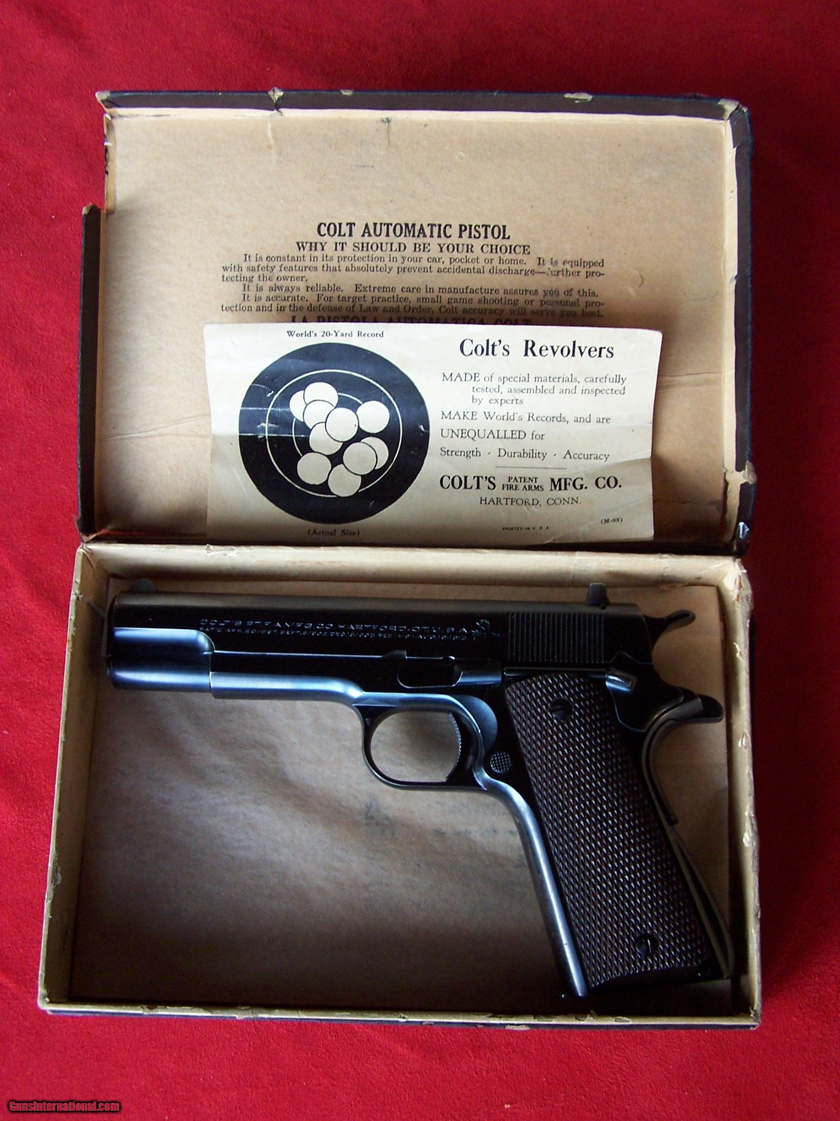 Description: This is an original pre war Colt Ace in it’s original box. These were introduced in 1931 and this one was made in the first six months of production. It comes with the original magazine that has the small hole near the top (See photo). These magazines were only manufactured with this hole for the first six months of the production. The gun remains in very good condition with just some slight edge wear. It is mechanically perfect and the bore is excellent. A highly collectible pre war Colt that is getting more difficult to find. I offer a three day inspection on all of my guns and it will be packaged correctly with the gun being shipped in a zipper pouch. This gun requires a C&R or FFL license for shipment. Price is $5250 plus $45 insured shipping. Please call Cam 931-484-3200 with any questions. Please Note: Gun is sold pending funds. SOLD Curio/Relic: Yes Manufacturer: Colt Model: Ace Serial Number: 1543 Caliber Info: .22 Bore: excellent Condition: Excellent Metal Condition: 98-99% Wood Condition: Excellent Bore Condition: Excellent Manufacture Date: August 13, 1931 |