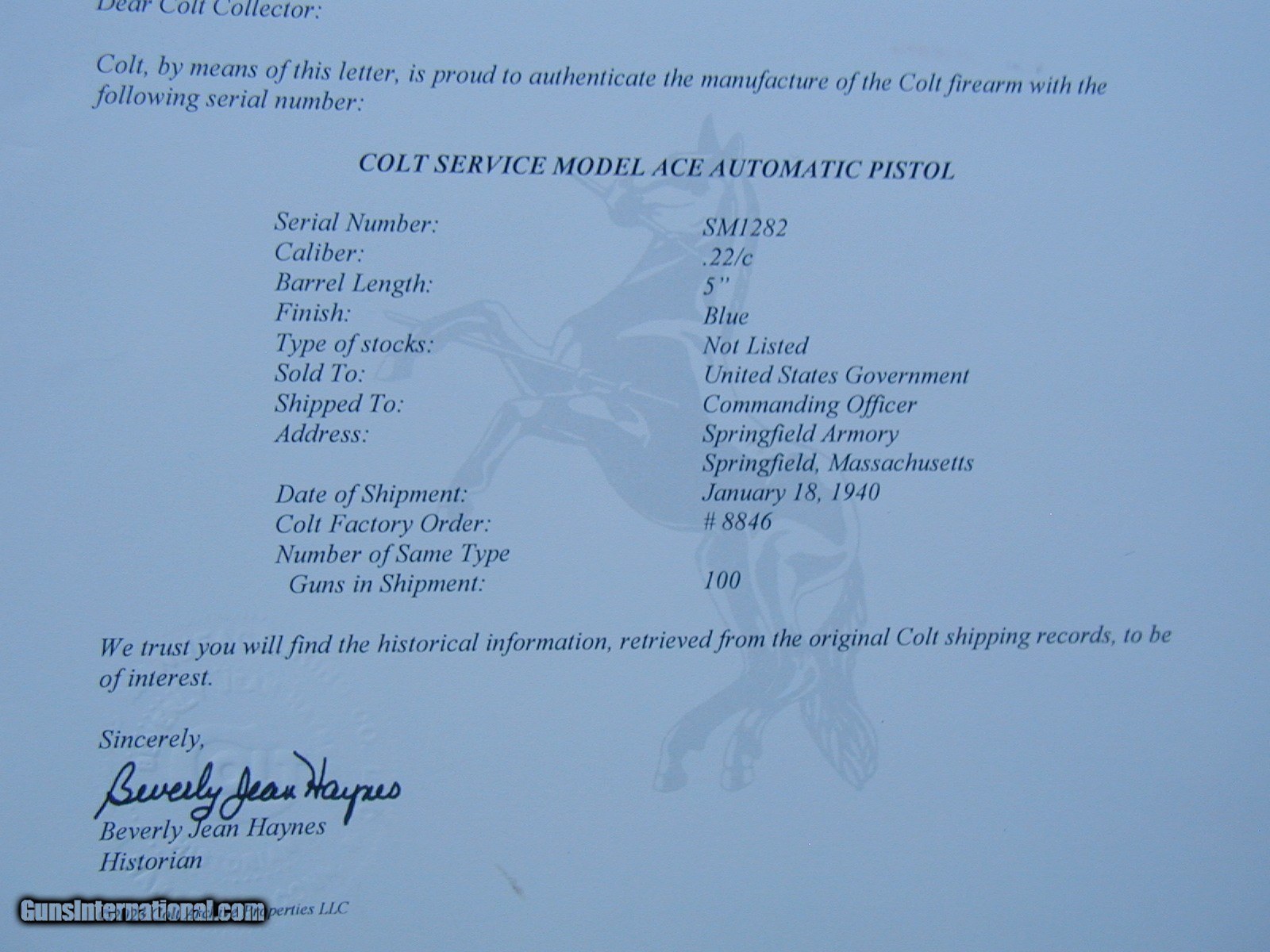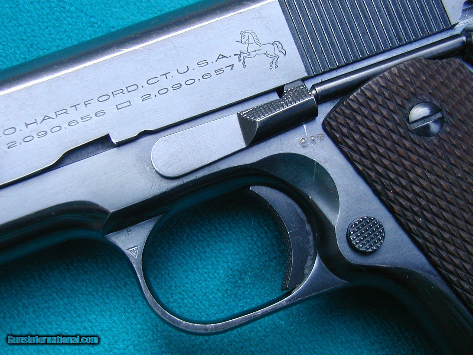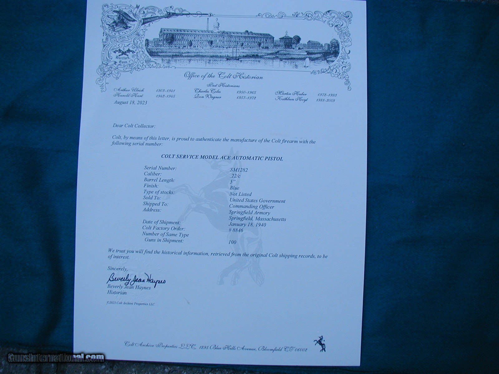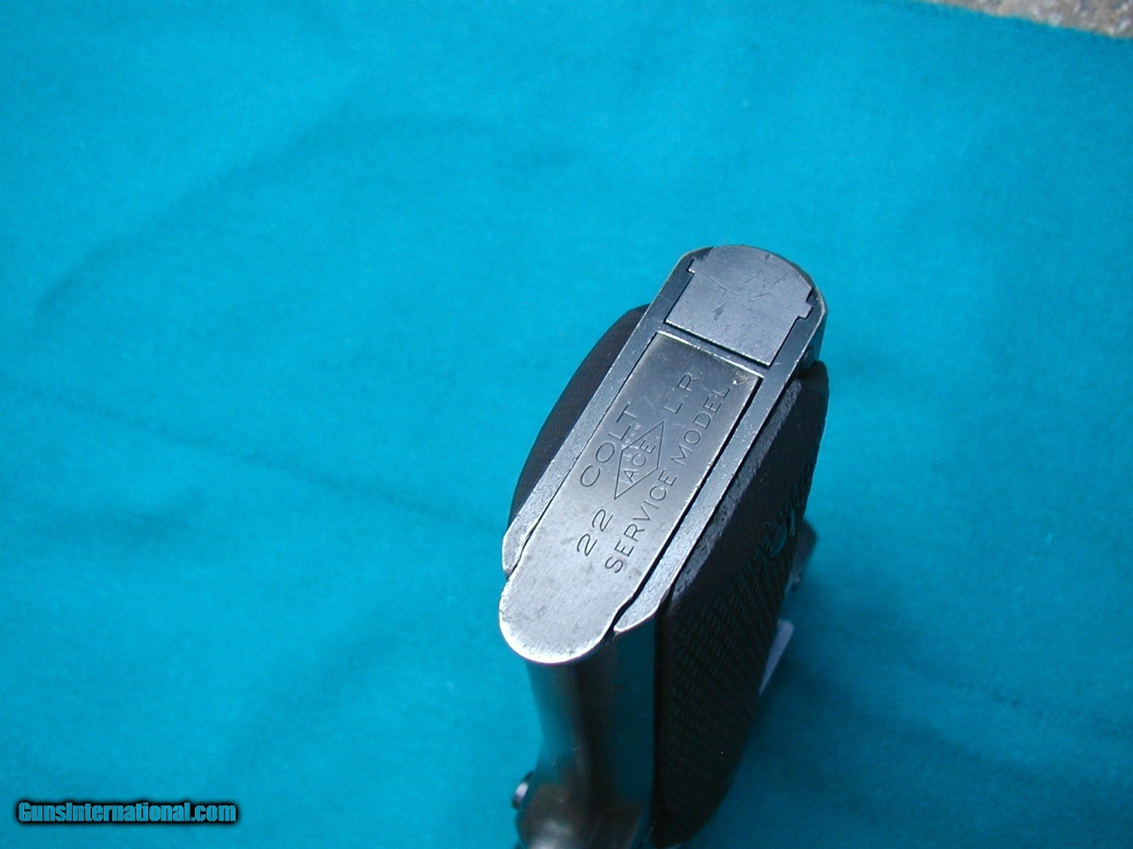Description: THIS IS A RARE , VERY EARLY , JAN. 1940, COLT U.S. PROPERTY SERVICE ACE. THERE WERE LESS THAN 200 OF THESE 1ST ISSUE EARLY GUNS MADE. IT RETAINS 94% OF IT'S ORIGINAL BLUE, MATCHING SLIDE AND A MINT BORE. THE GRIPS ARE EXCELLENT AND IT FUNCTIONS PERFECTLY. HAS THE ORIGINAL 2 TONE MAG. THERE IS VERY LIGHT EDGE WEAR AND HANDLING WITH MOST OF THE USE CONFINED TO THE FRONT GRIP STRAP WHICH IS TONING A BIT. MARKINGS ARE ALL CLEAR. COMES WITH A COLT FACTORY LETTER. C&R OK SOLD Curio/Relic: Yes |