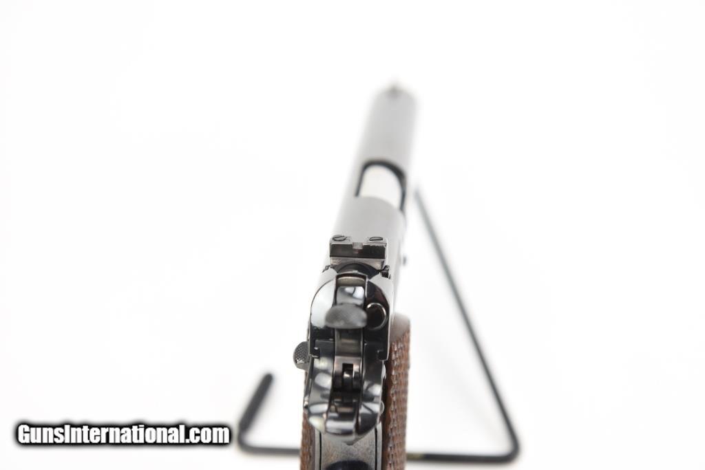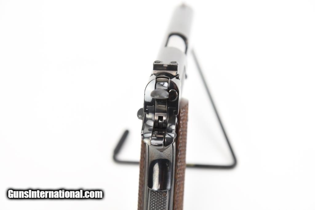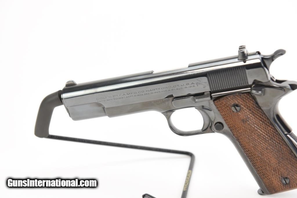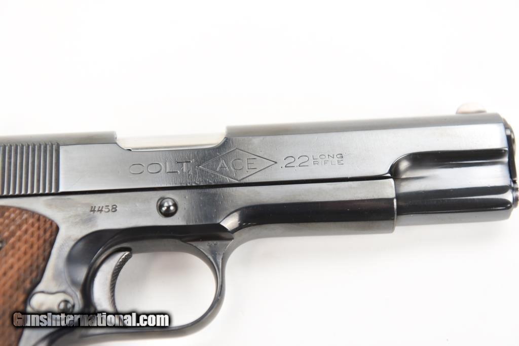 Description: It has been professionally refurbished and shines like it did when it was new. This Firearm comes with a Certificate from the office of the Colt Historians. Manufacturer: Colt Model: Ace Type: Pistol Gauge: 22 LR Barrel: 5 inch round Finish: BLUE Grip: walnut Serial Number: 4458 Class: Curio & Relic Handgun Description: Manufactured in 1933. The right side of the slide has the distinctive marking "COLT" followed by "ACE" in a diamond and ".22 LONG/RIFLE". The left side of the slide is marked with the elongated two line Colt Hartford address/patent dates followed by the Rampant Colt. The right side of the frame is marked with the serial number "4458". A "3" assembler's mark and the Colt "triangle/VP" proofmark are stamped on the upper left trigger guard bow, and "20" on the opposite. Colt commercial blue finish, original Colt Ace marked two tone magazine, blue barrel with bright chamber, half moon blade front and adjustable rear target sights, and fitted with checkered walnut grips. The heel correctly lacks the lanyard loop found on Model 1911A1 pistols. The Colt Ace was introduced by Colt in 1931 as a companion arm to the Model 1911A1 Government Model. Approximately 10,745 Ace pistols were manufactured by Colt before production ceased in July 1941. SOLD Handgun Caliber: .22 Long Rifle Manufacturer: Colt Model: Ace Serial Number: 4458 Barrel Length: 5 |