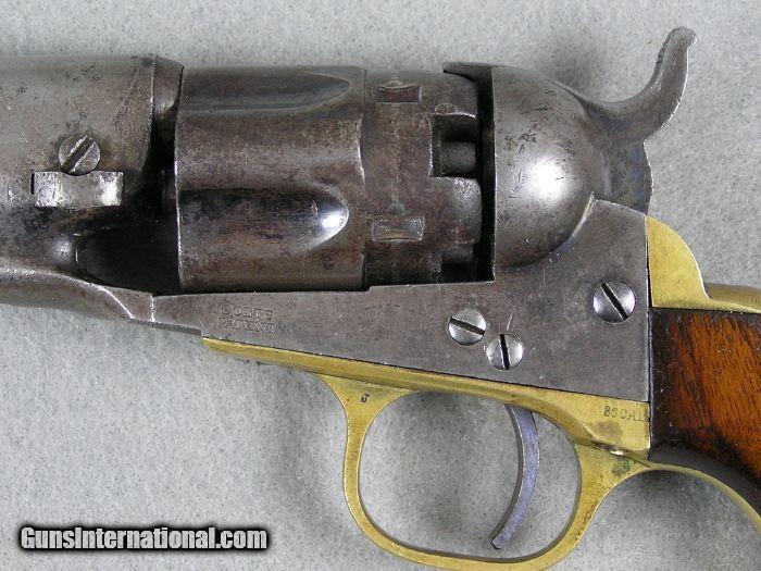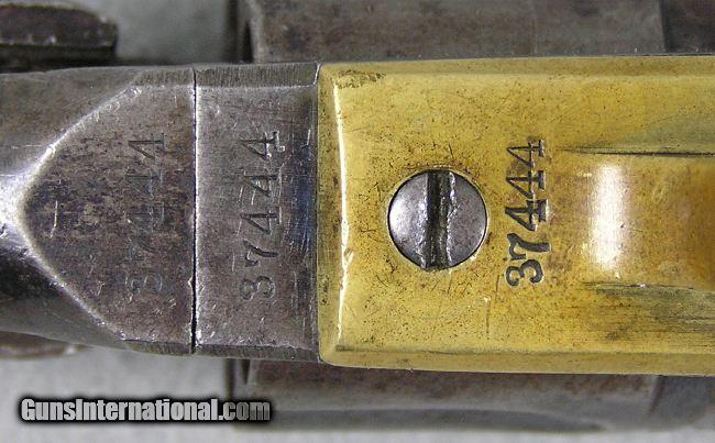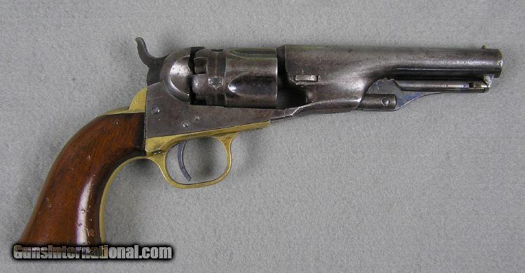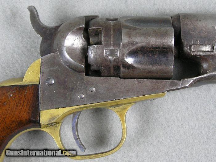 Description: This is 1862 Police 36 caliber percussion revolver with the fluted cylinder. It retains 35% blue and with small safety pins on the rear of the cylinder. The mechanical function is very good the bore is good plus bright and shinny but does show some traces of corrosion. It retains 35-40% case colors and the grips retain about 80% varnish. The serial number 37444 is all matching including the wedge on this 4.5” barrel 5 shot Colt. The manufacture date was 1868. I would consider trades for pre 1899 ANTIQUE PISTOLS and rifles on any of my items.. WHAT DO YOU HAVE TO TRADE? Ask about our 30-90 day lay-away program. We accept Bank Check, Money order, Personal checks or wire transfer. SOLD Antique: Yes Manufacturer: Colt Serial Number: 37444 |