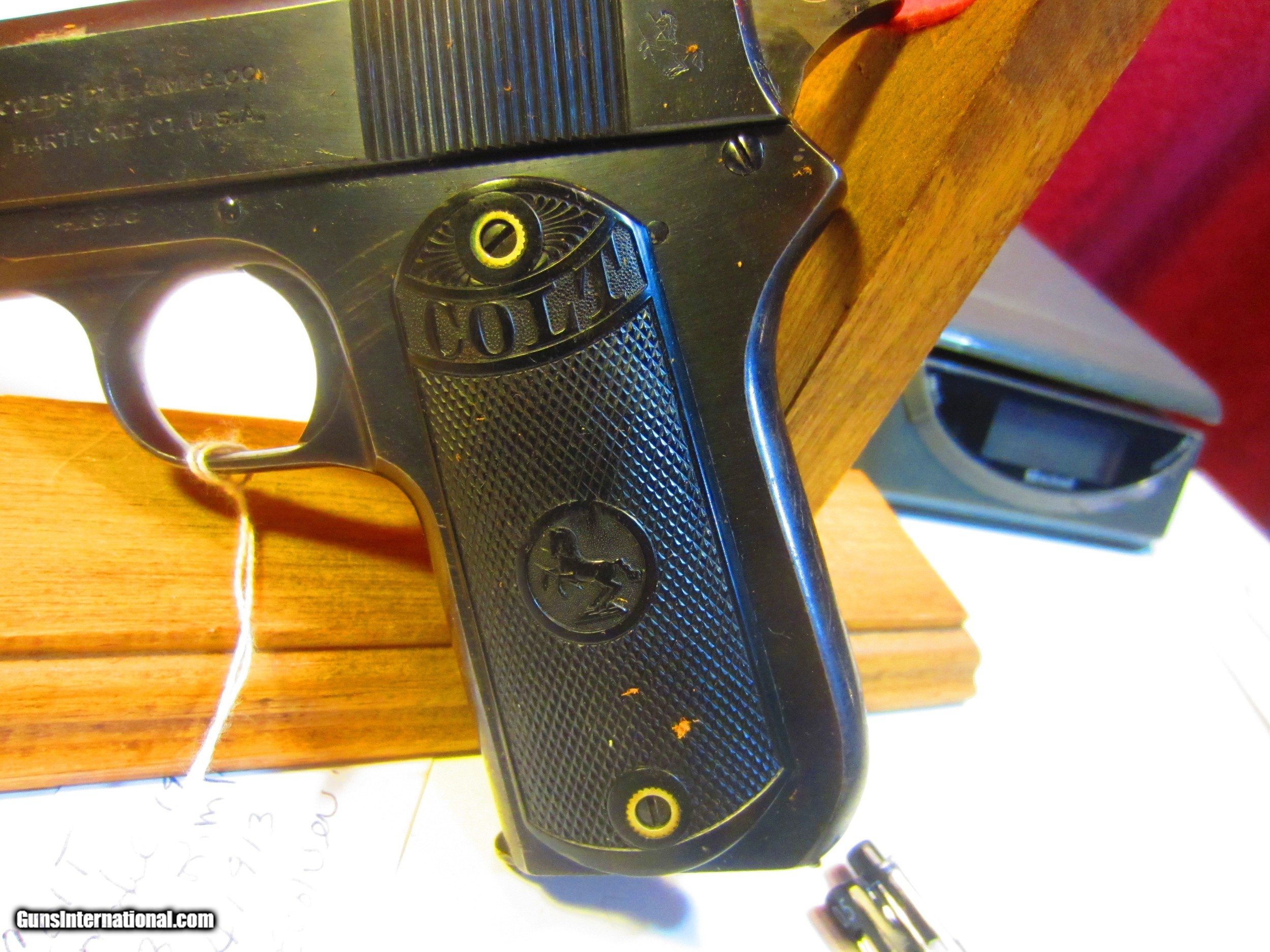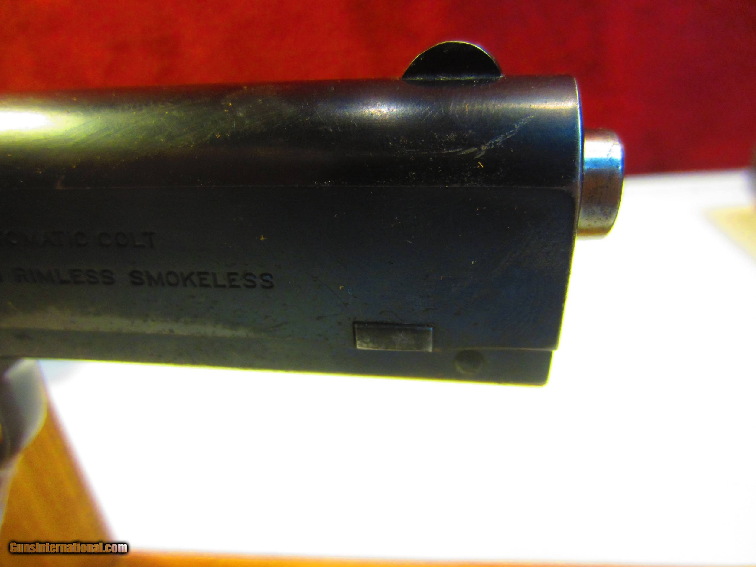 Description: COLT 1902 SPORTING AUTOMATIC CALIBER 38 RIMLESS SMOKLESS AS MARKED ON SLIDE. SERIAL NUMBER 41913 GRIPS EXCELLENT FACTORY BLUE 95% OR BETTER. VERY RARE IN THIS CONDITION . WANT TO PURCHASE CALL SHOP 716-941-3946 SOLD Curio/Relic: Yes |
