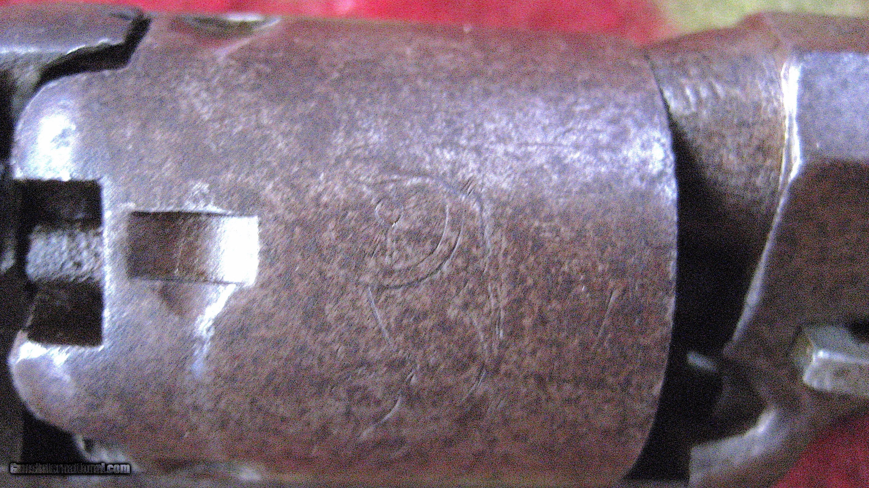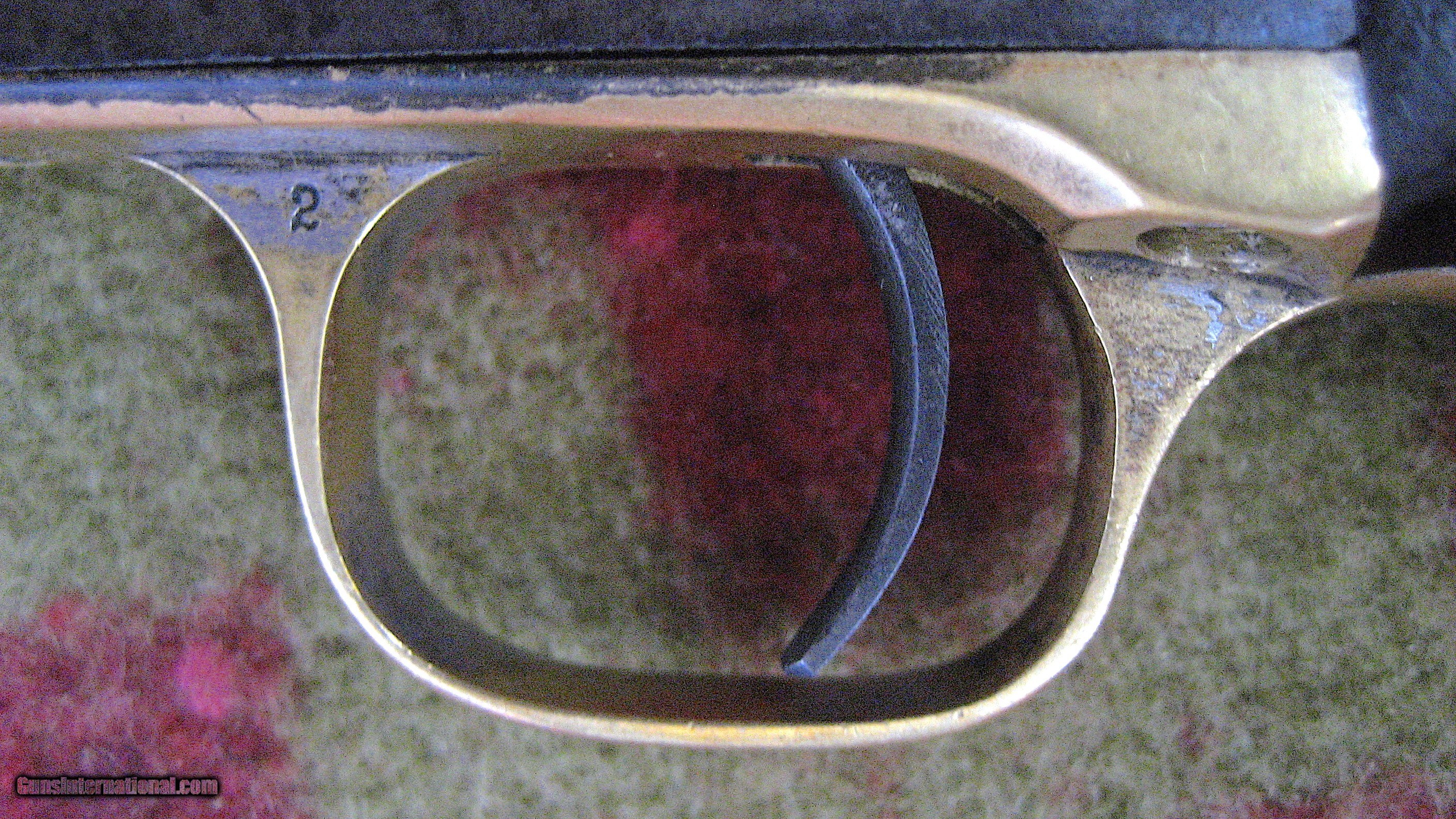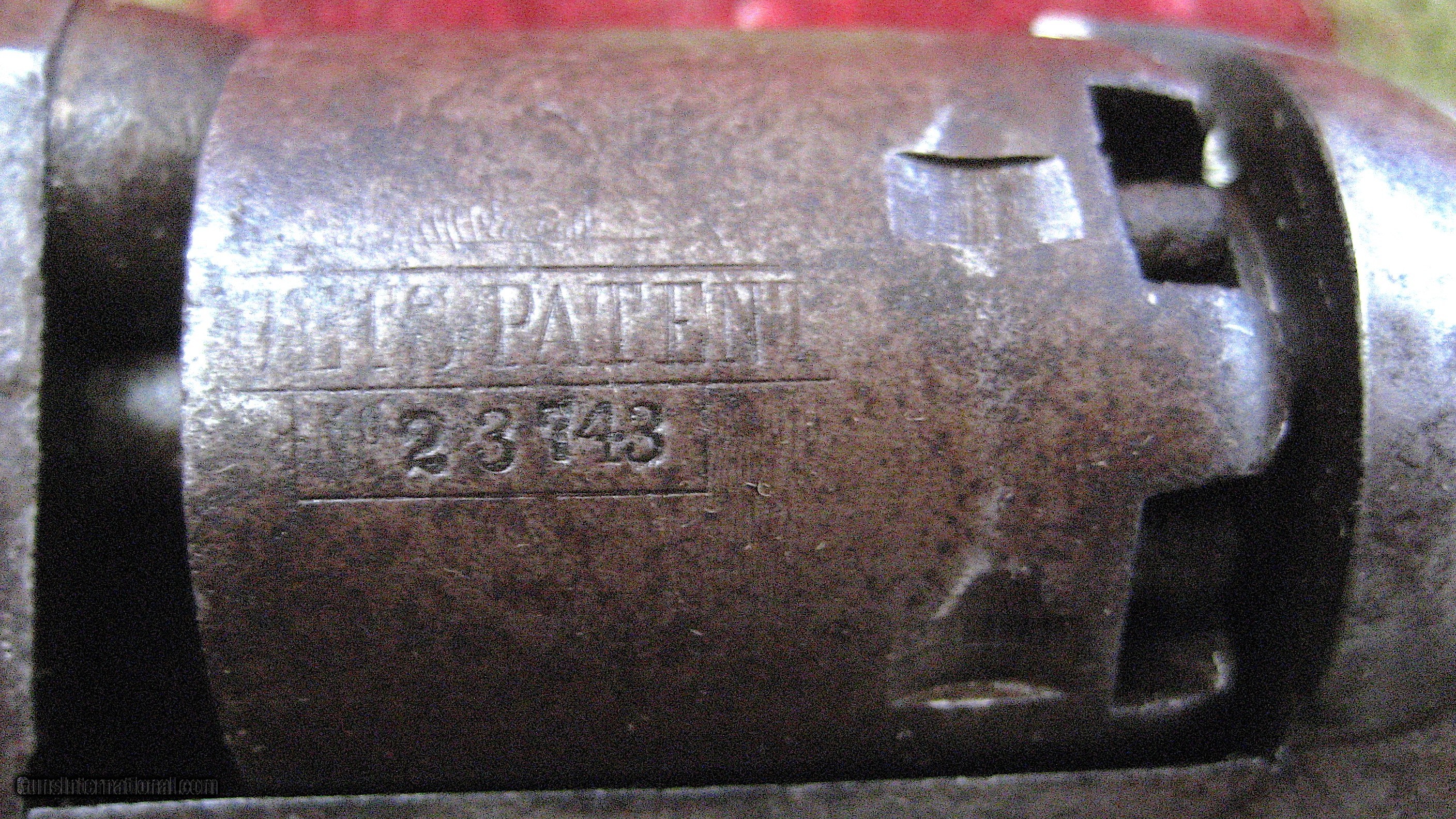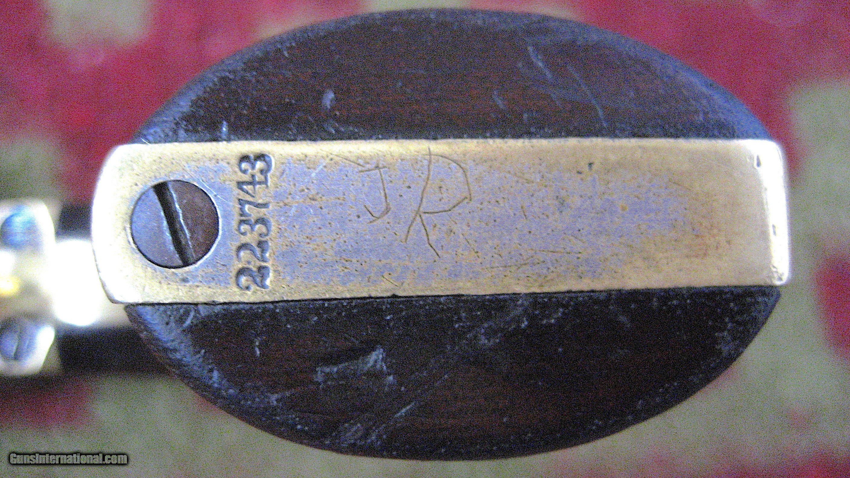 Revolver shows a couple traces of it's original finish with the balance of the metal surfaces turned to an aged brown patina. Action performs well. nipples are good, bore is good+, and the wood grip is very good. Condition is NRA good to very good. ***Antique Firearm*** Zelle, cashiers check, money order or personal check accepted. SOLD Antique: Yes Handgun Caliber: .31 Manufacturer: Colt Model: 1849 Serial Number: 223743 |