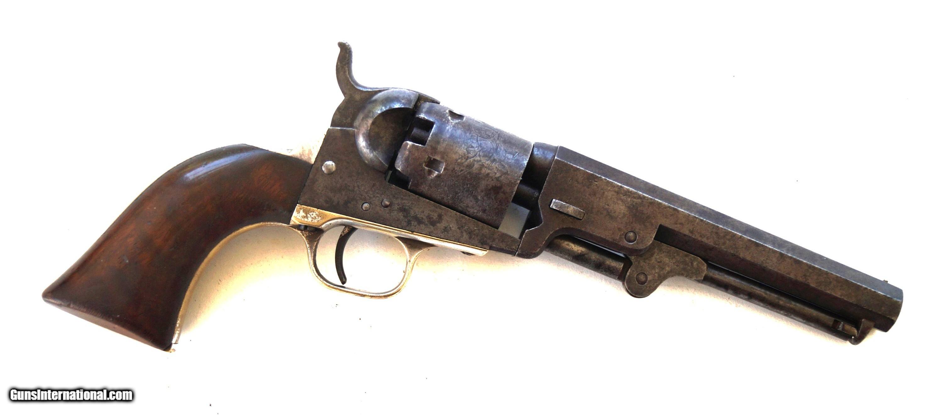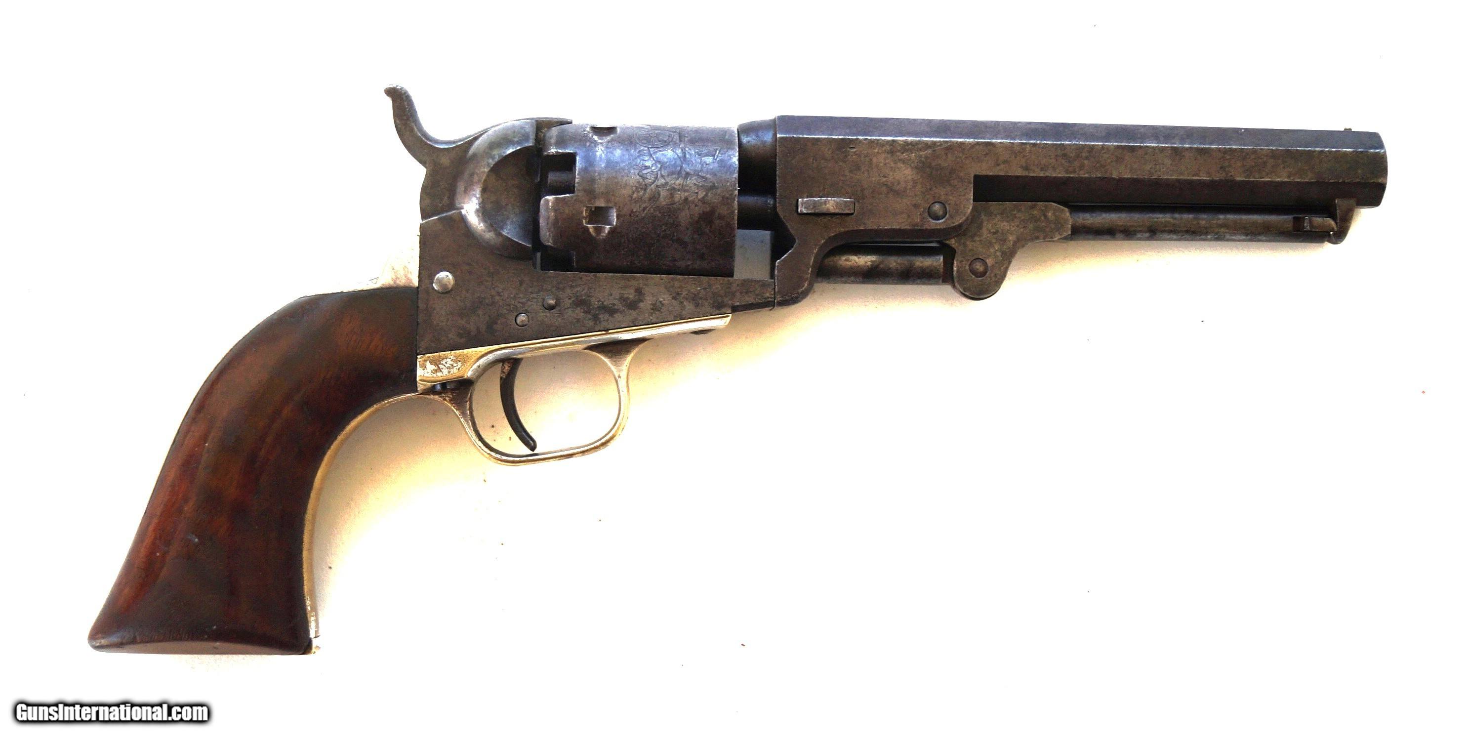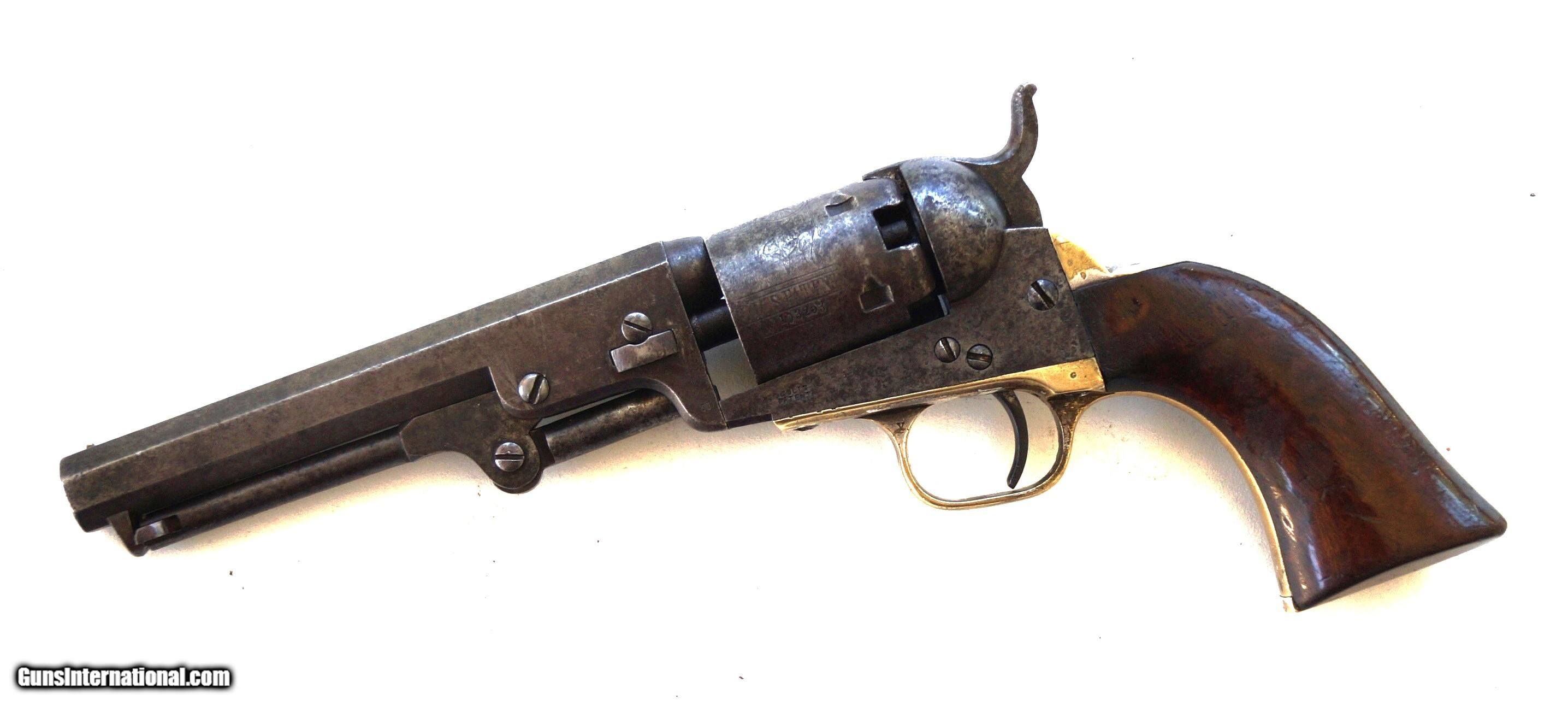 Description: THIS IS A COLT MODEL 1849, .31 CAL. THIS IS 100 % ALL MATCHING NUMBERS. THE REVOLVER WAS BUILT IN 1855. IT IS IN VERY GOOD CONDITION THE METAL HAVING TURNED MOSTLY GREY. THE CYLINDER SCENE IS STILL VIVID, MECHANICS ARE NICE AND THE BORE IS VERY GOOD. A REVOLVER.VERY NICE COLT MODEL 1849 POCKET. NOTE AND ORIGINAL POWDER FLASK COMES WITH THE GUN. SOLD Antique: Yes |