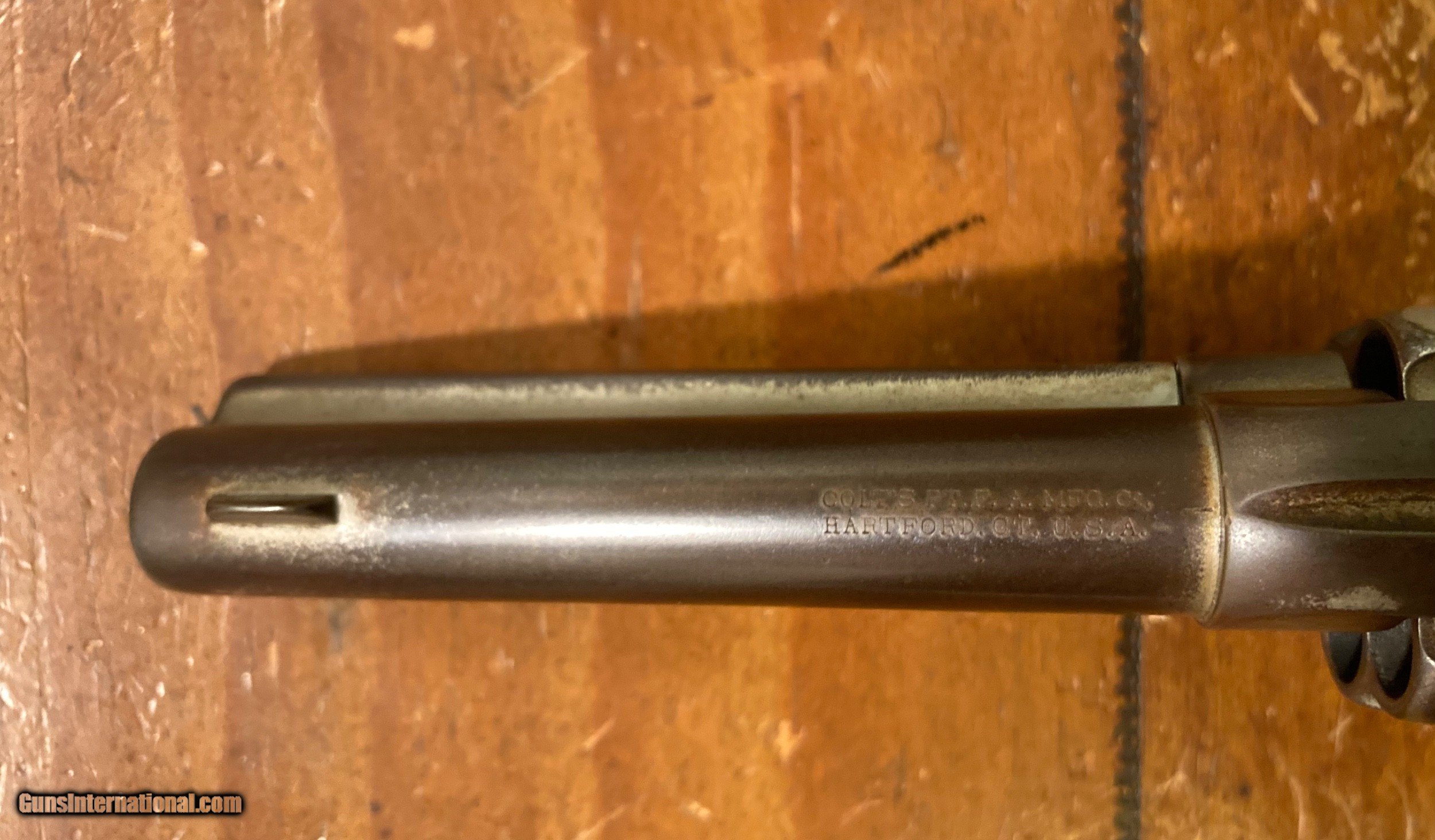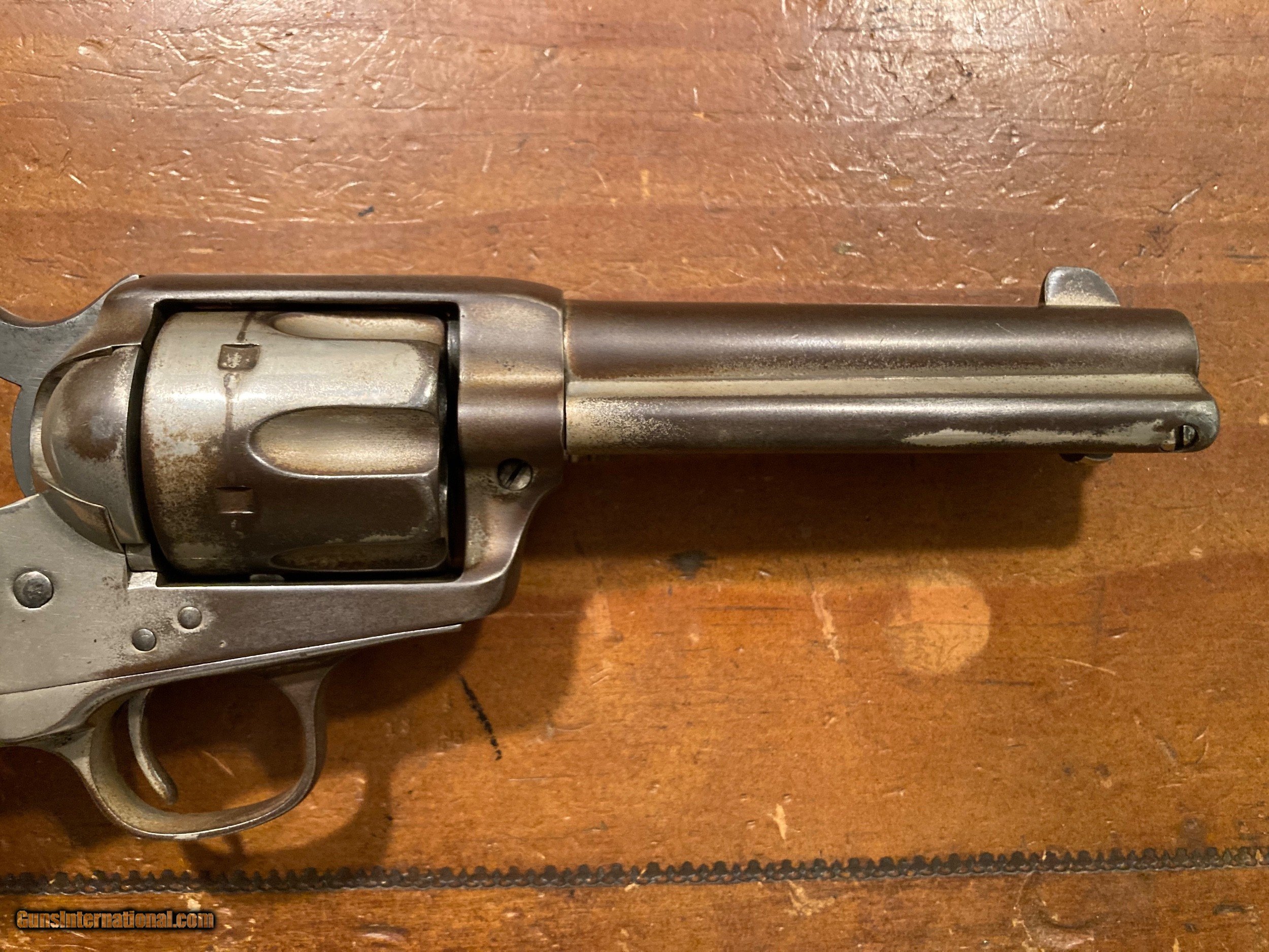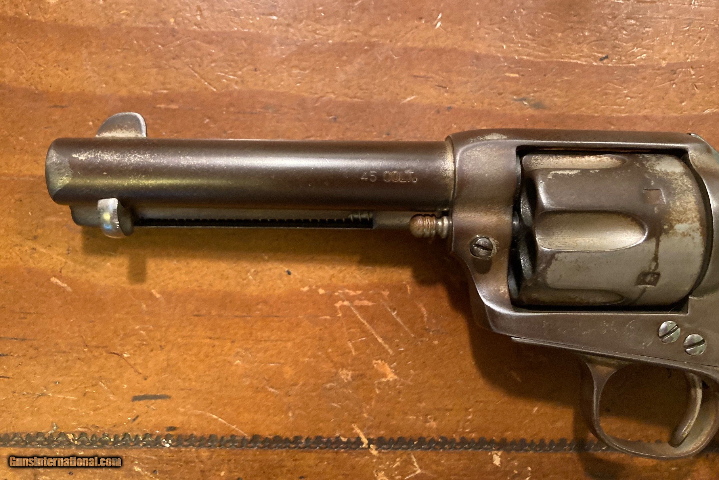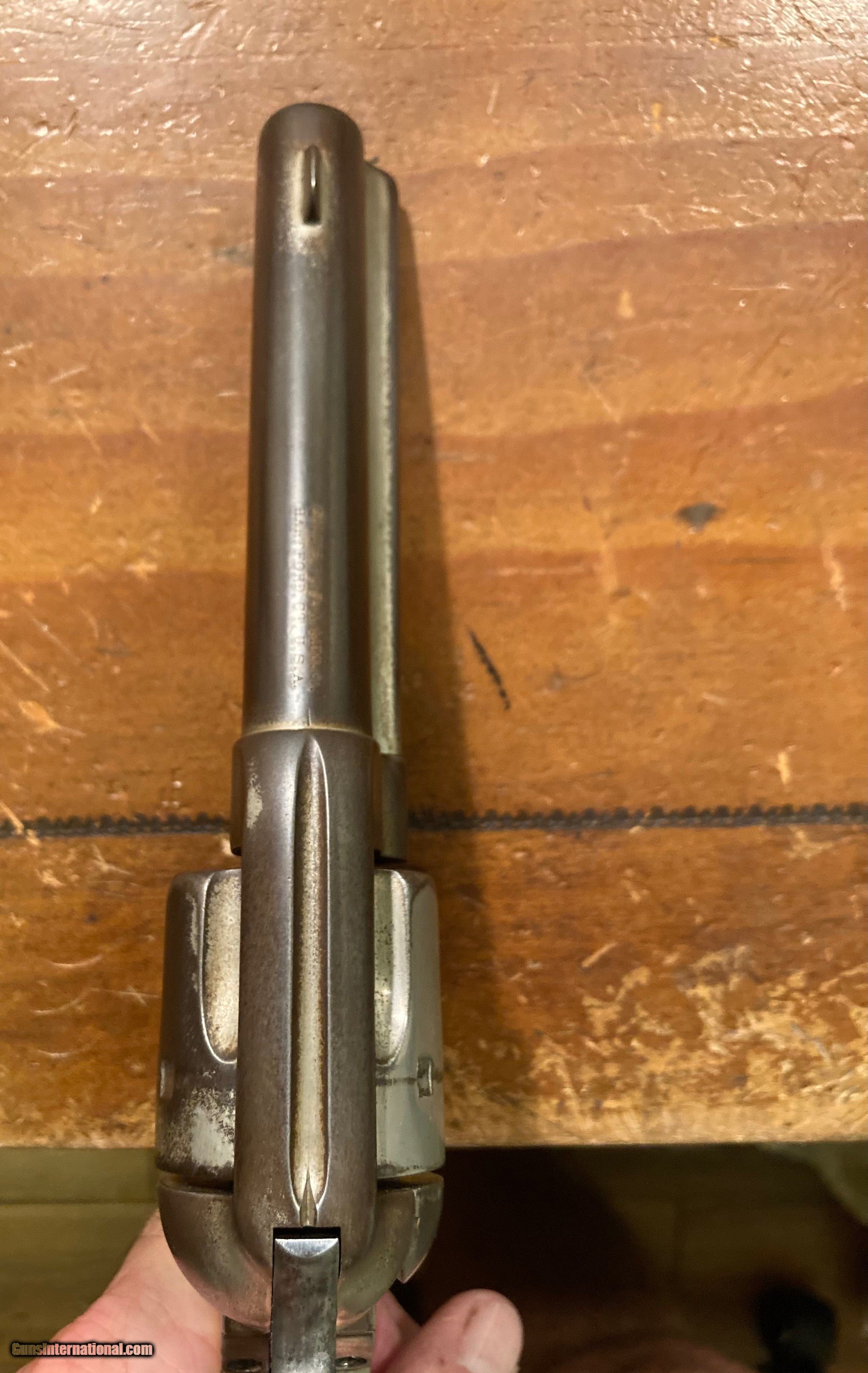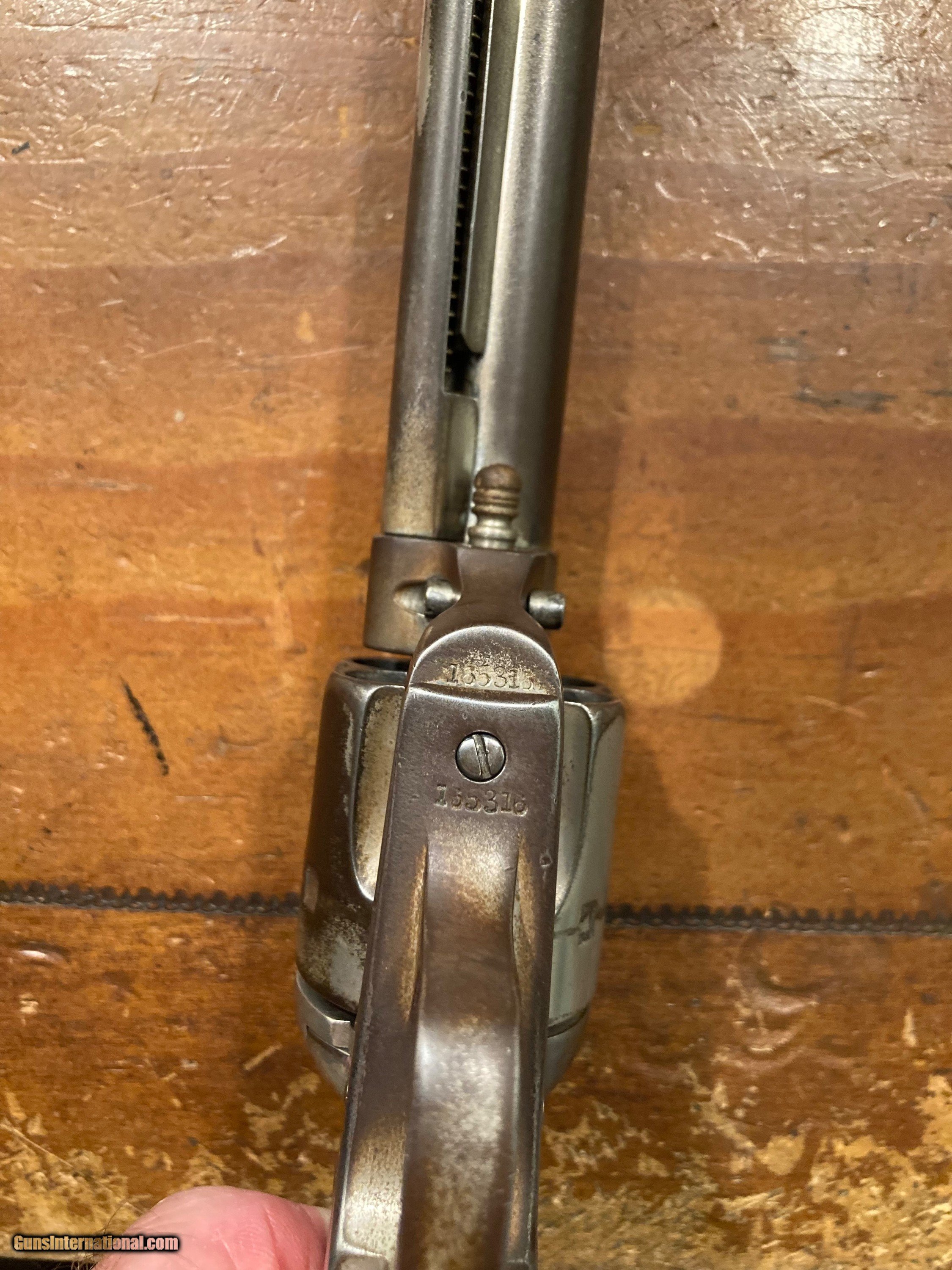 Description: Colt SAA single action .45 caliber dirty nickel cowboy gun with desirable 4 3/4 barrel. 1896 made antique Colt with ivory grips. 126 years worth of aged patina on a nickel gun has left a rich patina where nickel has worn off. Nickel finish remains in various spots and under the ejector housing. Assembly numbers on frame match loading gate so this appears untouched. Action is tight with all 4 clicks. Bore is as expected on a black powder gun - dark with some corrosion but certainly would toss a nice grouping. One of the very early smokeless frame guns but still antique. See photos as description and email or call with questions. Antique ships direct for $38. Matt 214-957-7574 SOLD Antique: Yes Manufacturer: Colt Model: Single action |