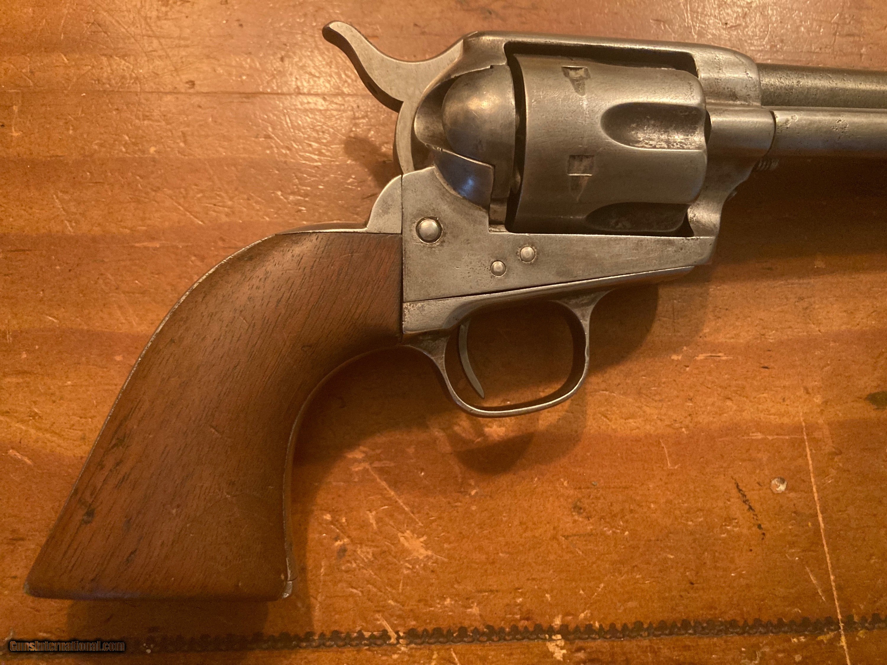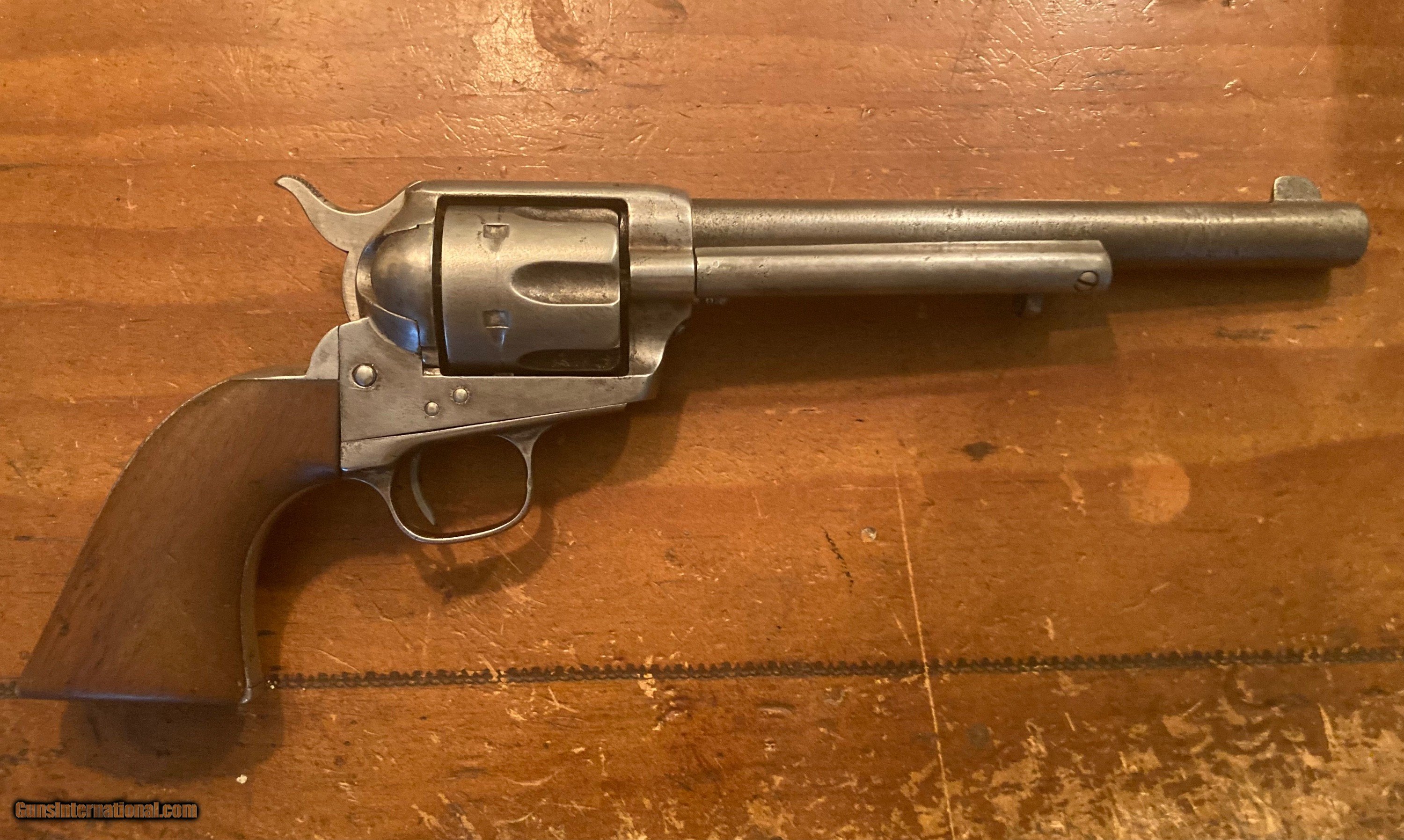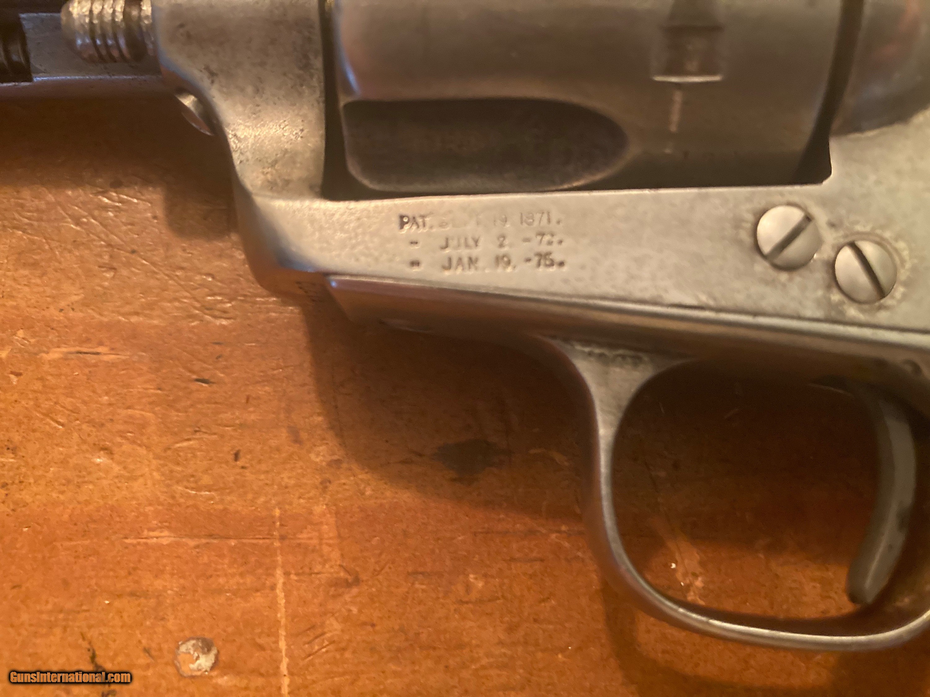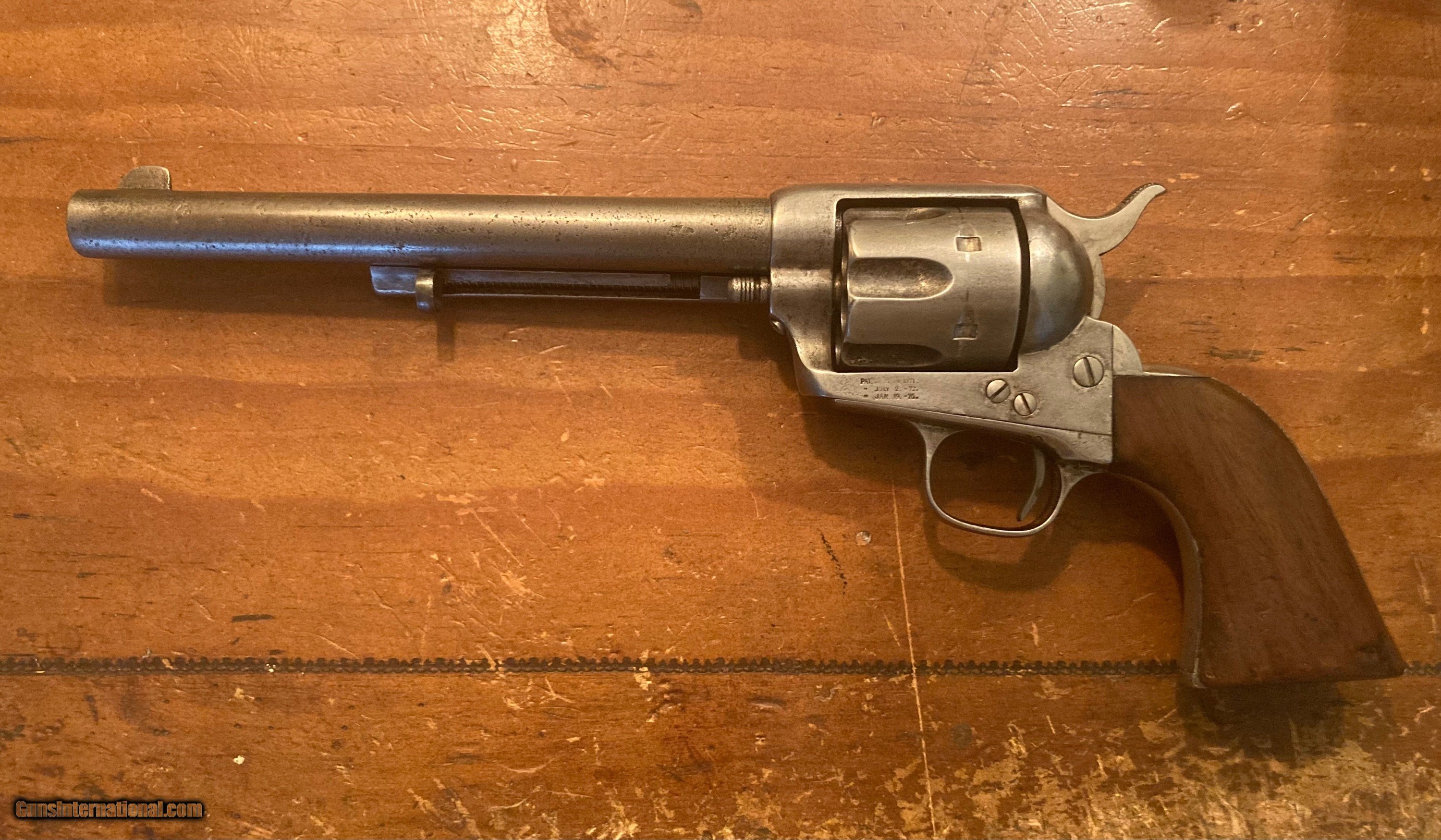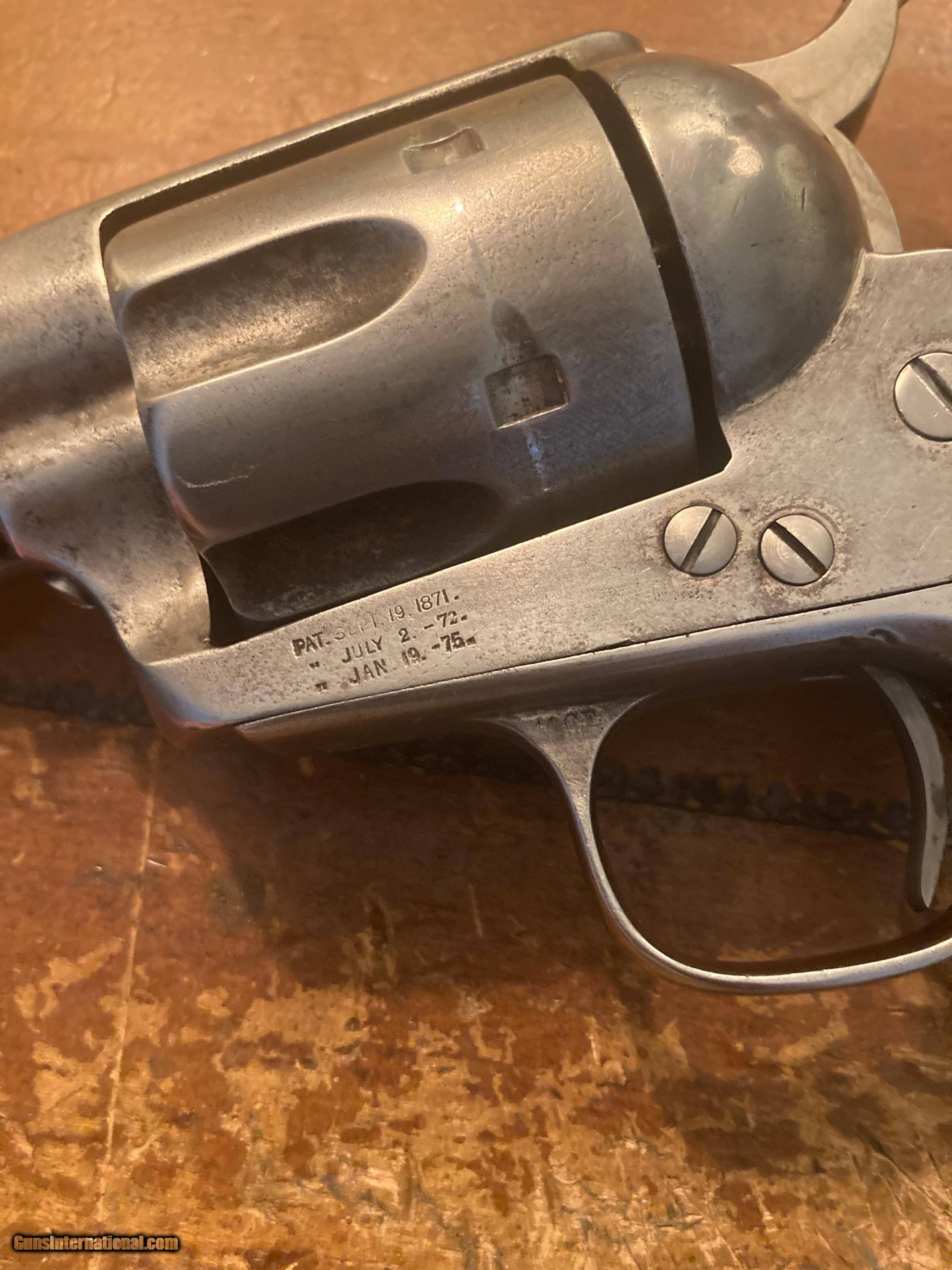 Description: Colt SAA single action Frontier Six Shooter etched panel. Very early 44-40 made in 1879. Second year Colt produced the 44-40 Six Shooter. According to Colt shipped as a 7 1/2 nickel gun. Most all nickel is gone with exception of traces in cylinder grooves. All matching serial numbers on barrel, frame, cylinder, trigger guard and back strap. Very nice early etched panel Frontier Six Shooter. Action is tight with all clicks. see photos as part of the description. Call or email questions. Antique ships direct for $38 Matt 214-957-7574 SOLD Antique: Yes Manufacturer: Colt Model: Frontier Six Shooter |