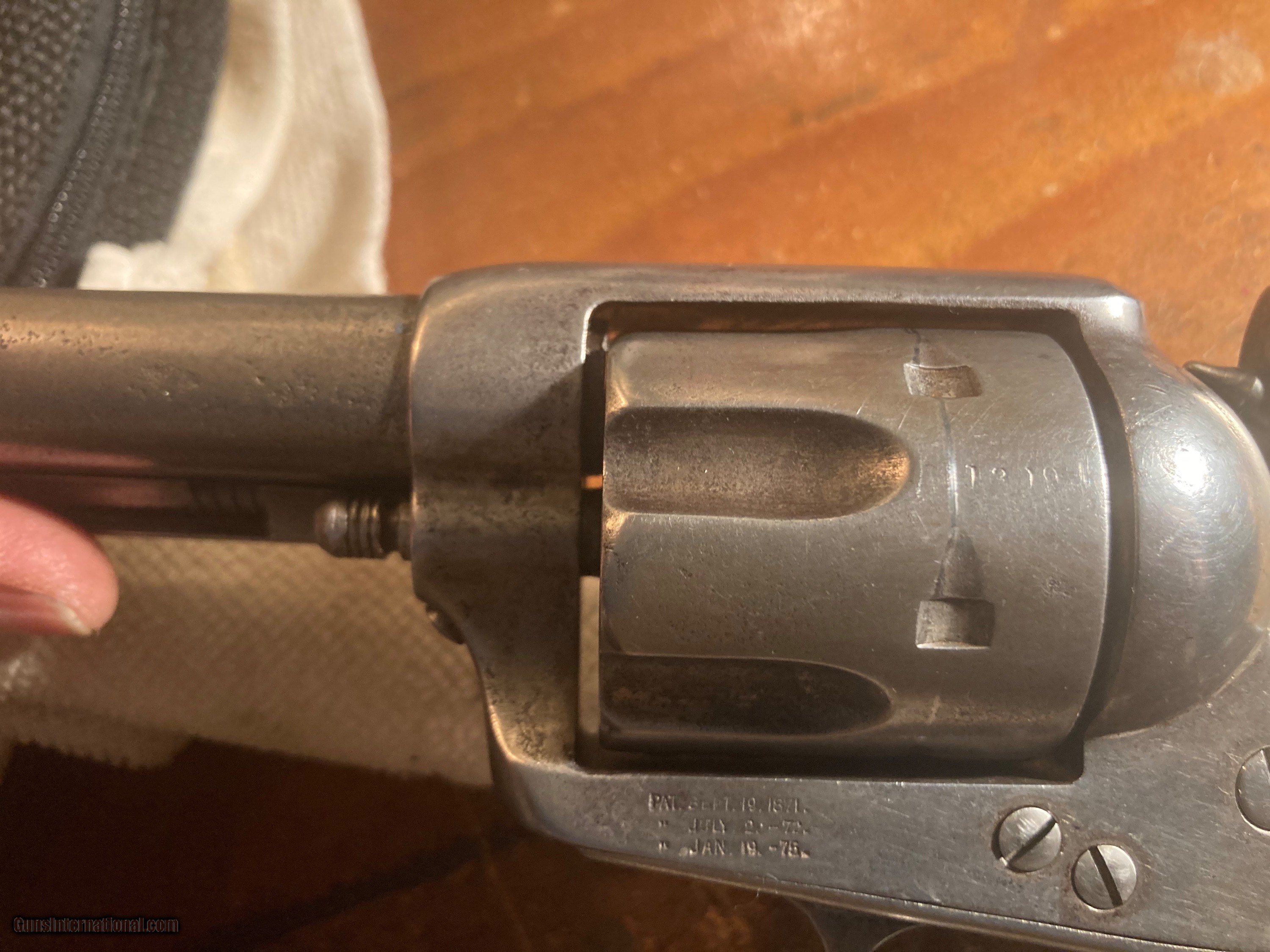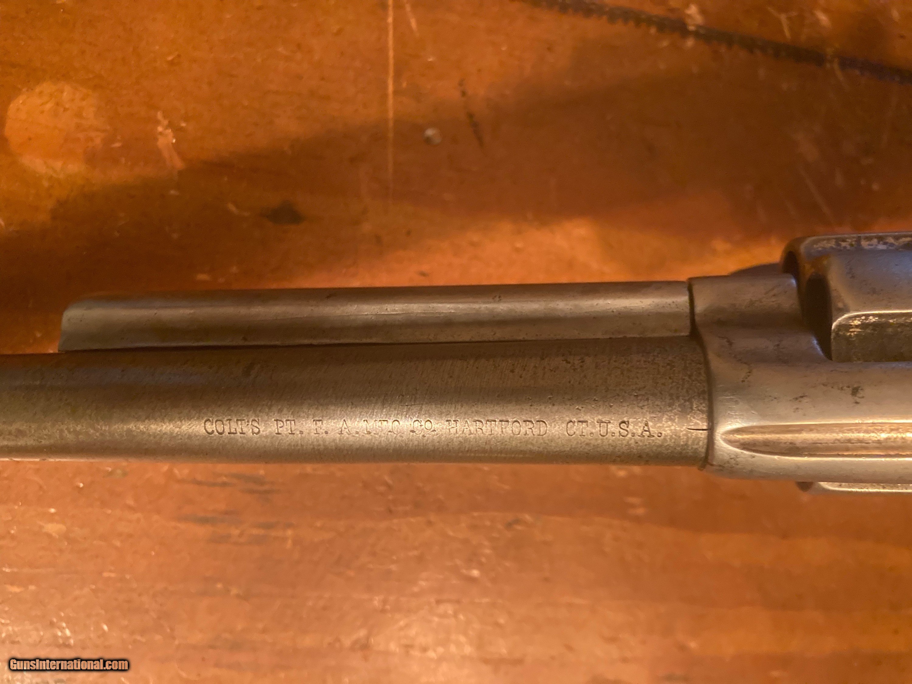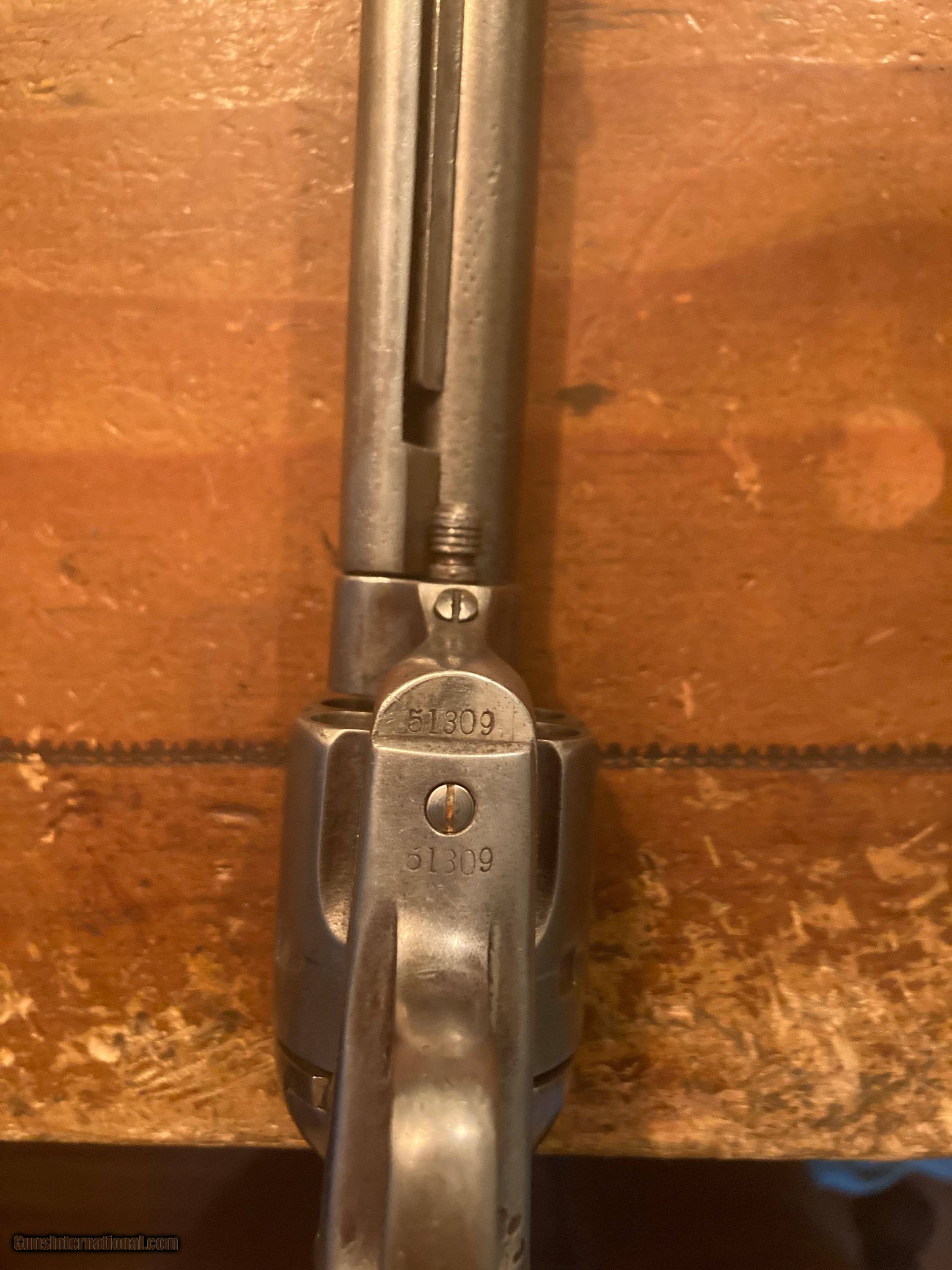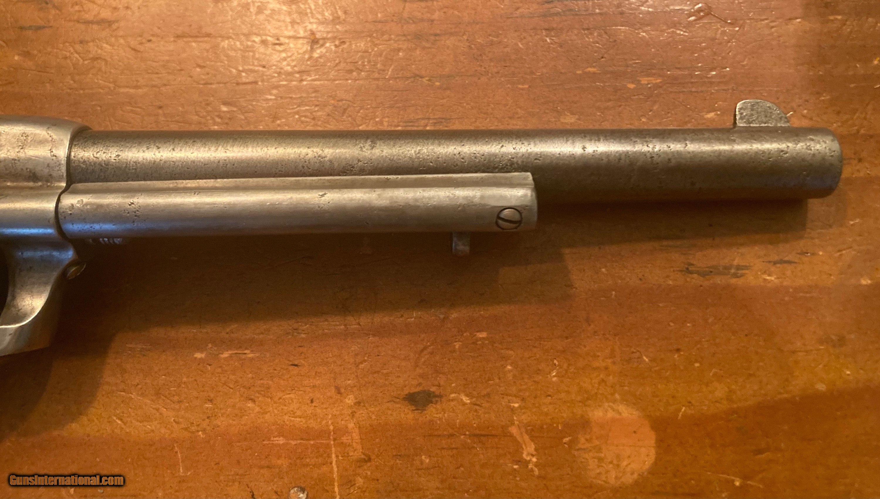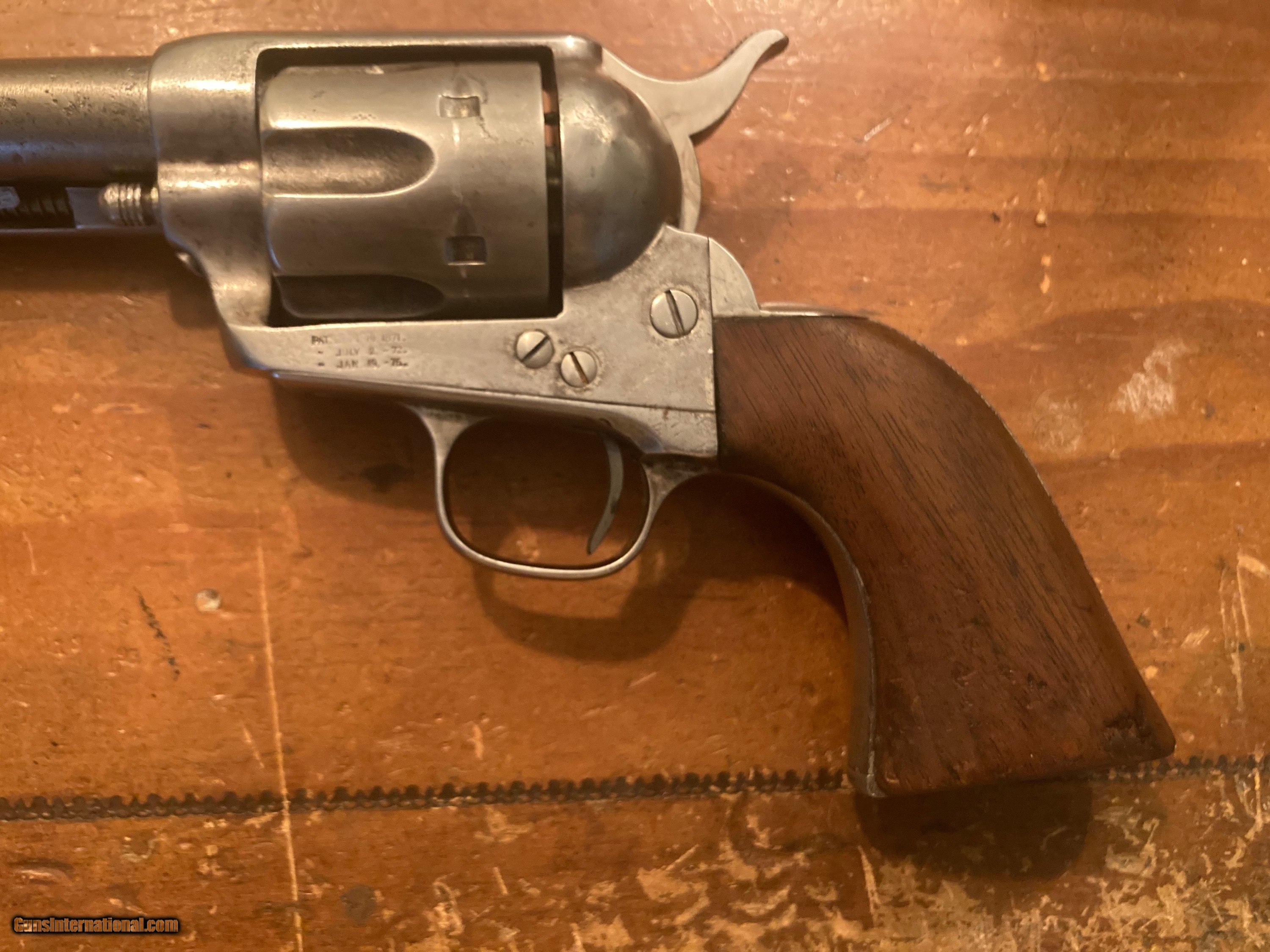 Description: Colt SAA single action Frontier Six Shooter etched panel. Very early 44-40 made in 1879. Second year Colt produced the 44-40 Six Shooter. According to Colt shipped as a 7 1/2 nickel gun. Most all nickel is gone with exception of traces in cylinder grooves. All matching serial numbers on barrel, frame, cylinder, trigger guard and back strap. Very nice early etched panel Frontier Six Shooter. Action is tight with all clicks. see photos as part of the description. Call or email questions. Antique ships direct for $38 Matt 214-957-7574 SOLD Antique: Yes Manufacturer: Colt Model: Frontier Six Shooter |