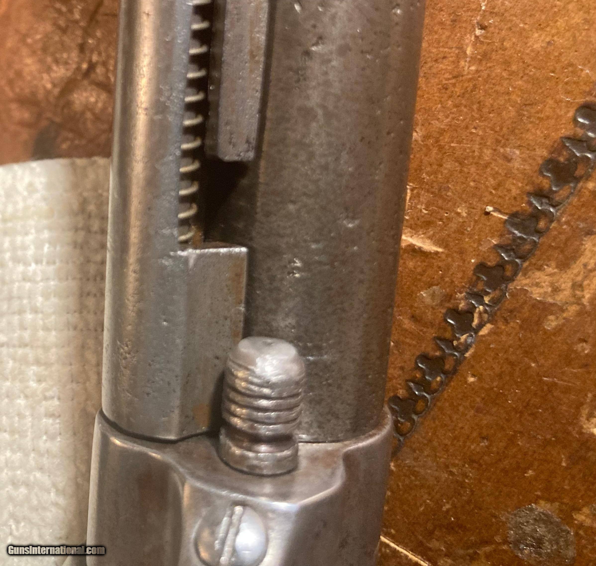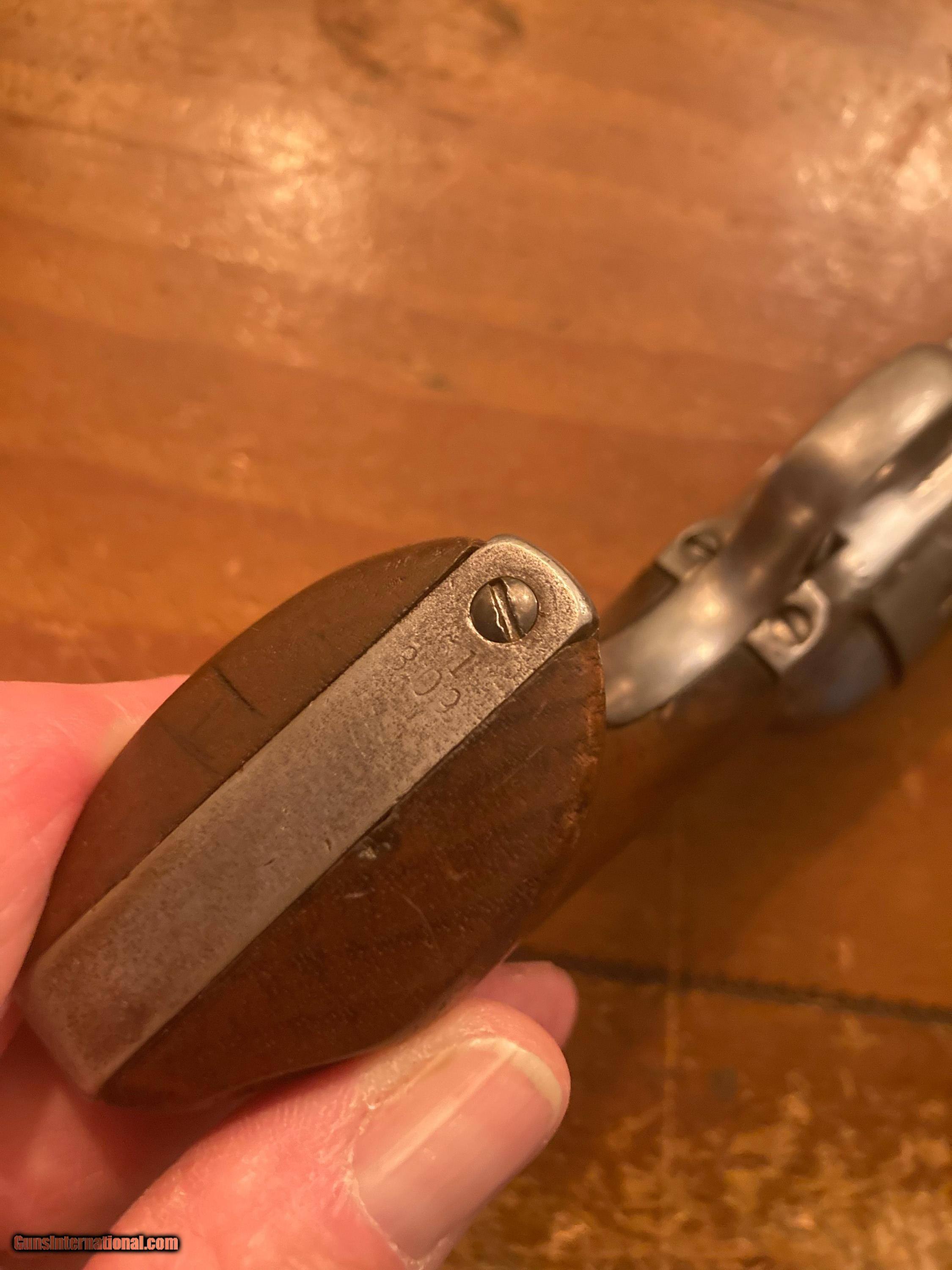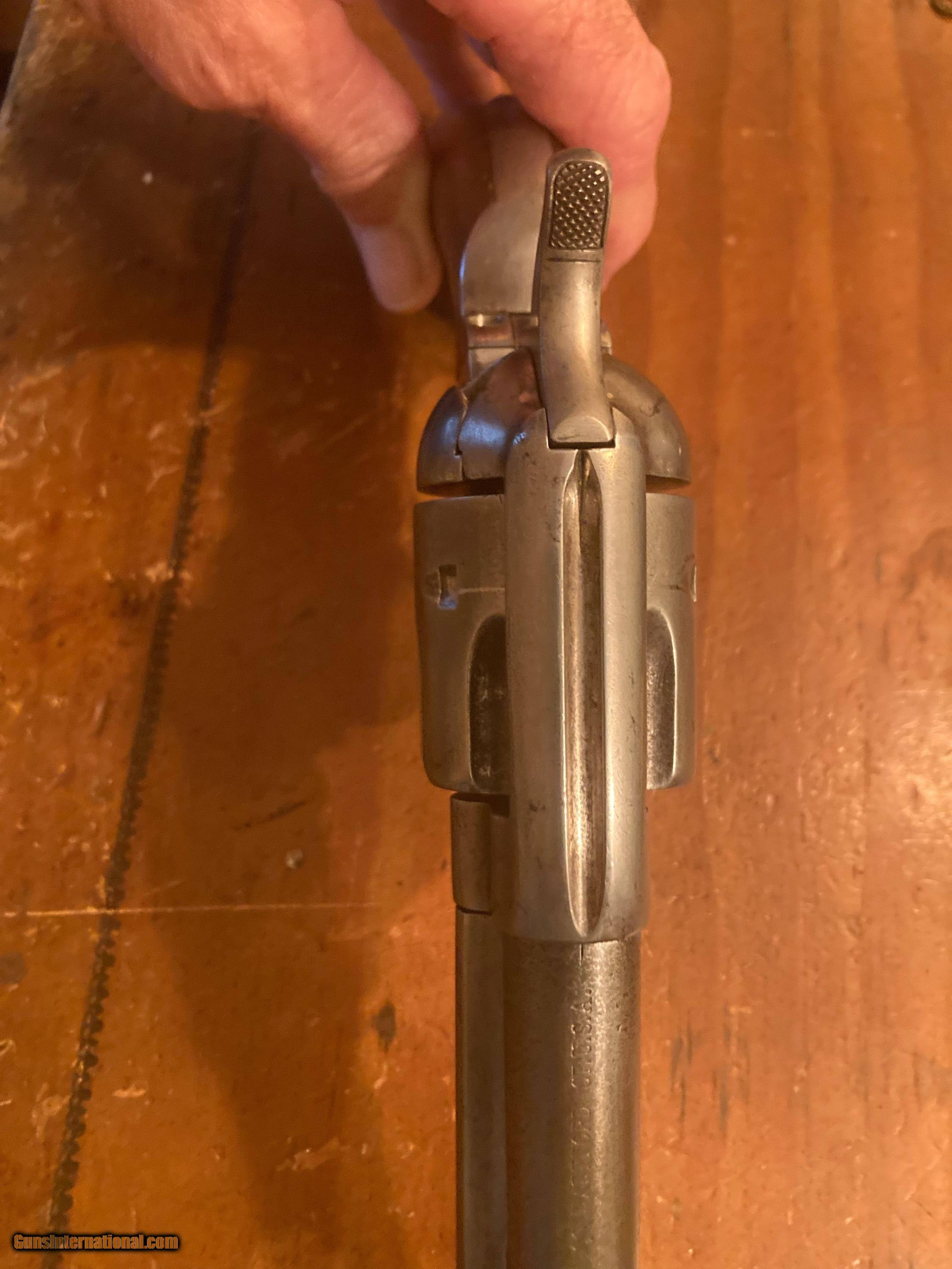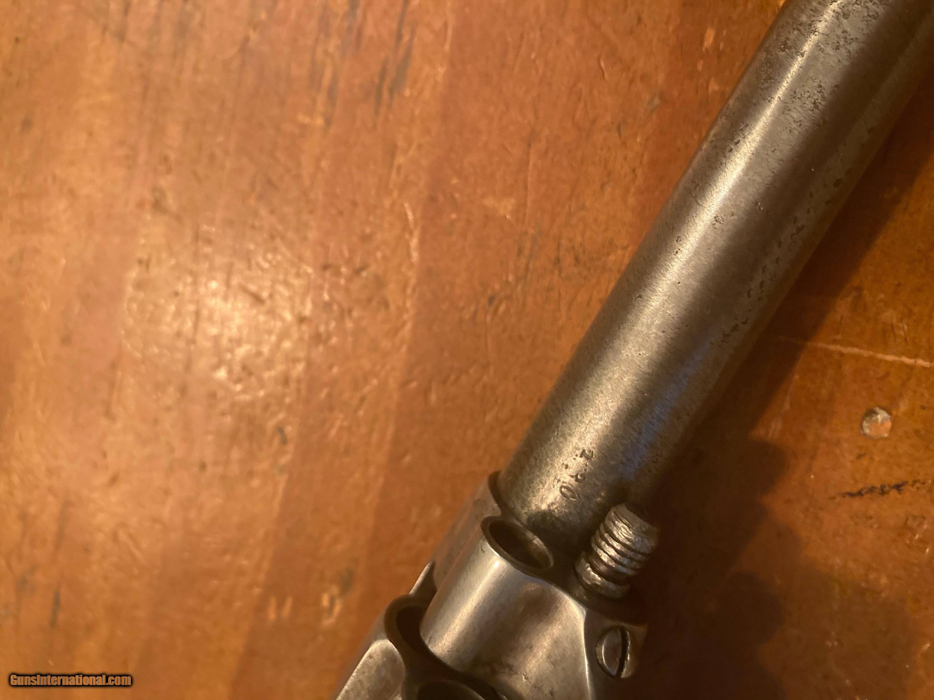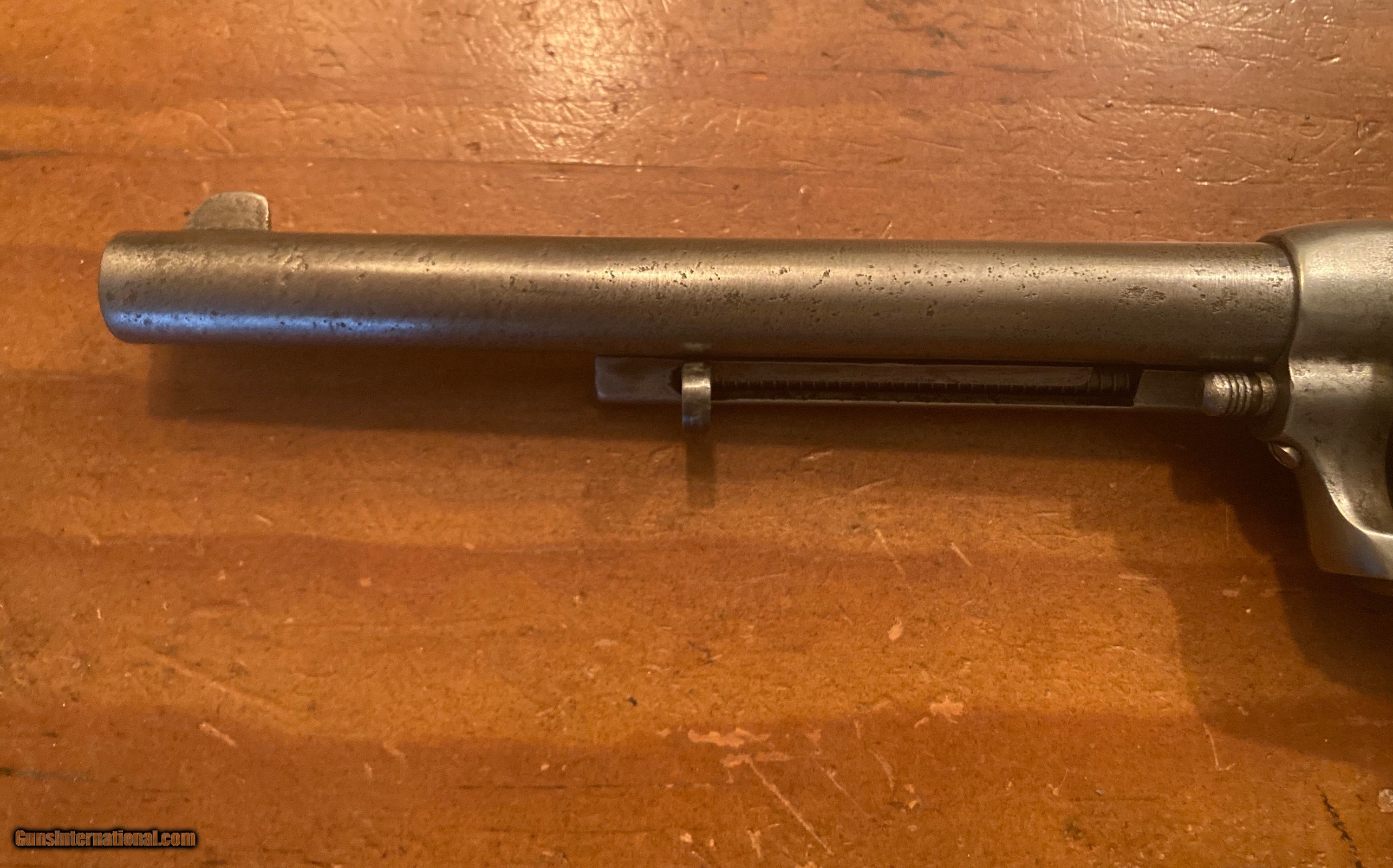 Description: Colt SAA single action Frontier Six Shooter etched panel. Very early 44-40 made in 1879. Second year Colt produced the 44-40 Six Shooter. According to Colt shipped as a 7 1/2 nickel gun. Most all nickel is gone with exception of traces in cylinder grooves. All matching serial numbers on barrel, frame, cylinder, trigger guard and back strap. Very nice early etched panel Frontier Six Shooter. Action is tight with all clicks. see photos as part of the description. Call or email questions. Antique ships direct for $38 Matt 214-957-7574 SOLD Antique: Yes Manufacturer: Colt Model: Frontier Six Shooter |