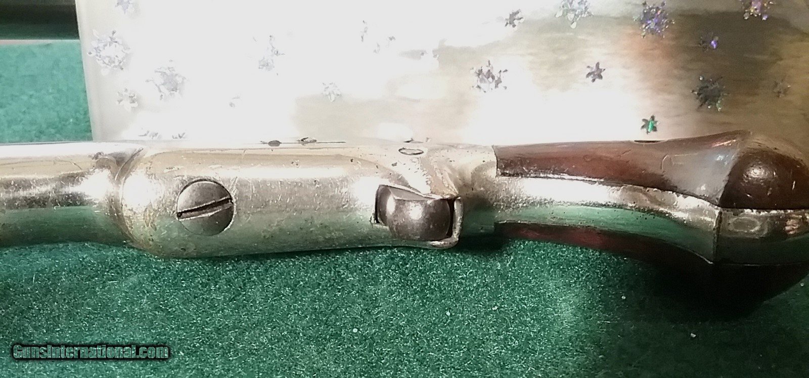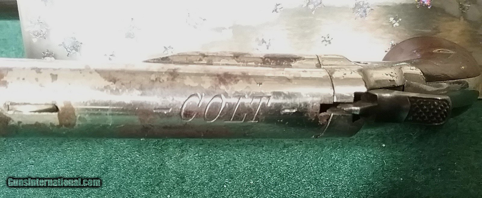 Description: THIRD MODEL DERRINGER (THUER MODEL) .41 RF cal., single shot, side pivoting 2 1/2 in. barrel, varnished walnut grips, nickel barrel, frame, Colt stamp on the barrel, spur trigger, CONDITION 85%. Per the Blue Book in this condition price range is $800 to $1000 serial numbered 17449 approx., date 1880’s 1-45,000. Mfg. approx. 1875-1912. No FFL, pre-1899 Shipping $25.00 if shipped to FFL to FFL $50.00 Thank you, John, enjoy the Colt Derringer. R. Downing SOLD Curio/Relic: Yes Antique: Yes Handgun Caliber: .41 Rimfire Manufacturer: Colt Model: THIRD MODEL Serial Number: 17449 Barrel Length: 2.5 Condition: Antique very good Metal Condition: 85% Wood Condition: 90% Bore Condition: Fair Barrel Type: Single Action: Swing Triggers: Tang Finish: Nickle Manufacture Date: 1880's |