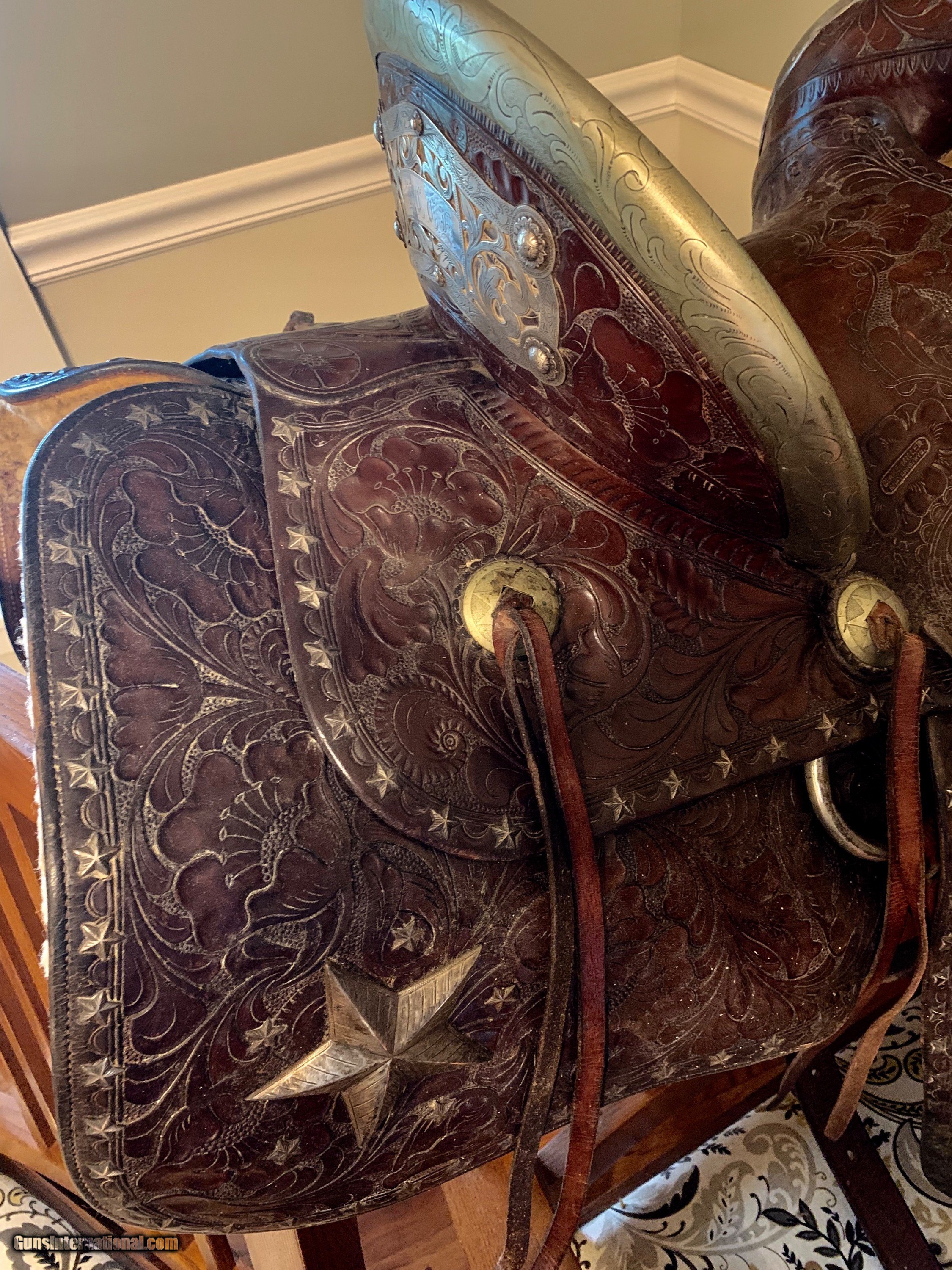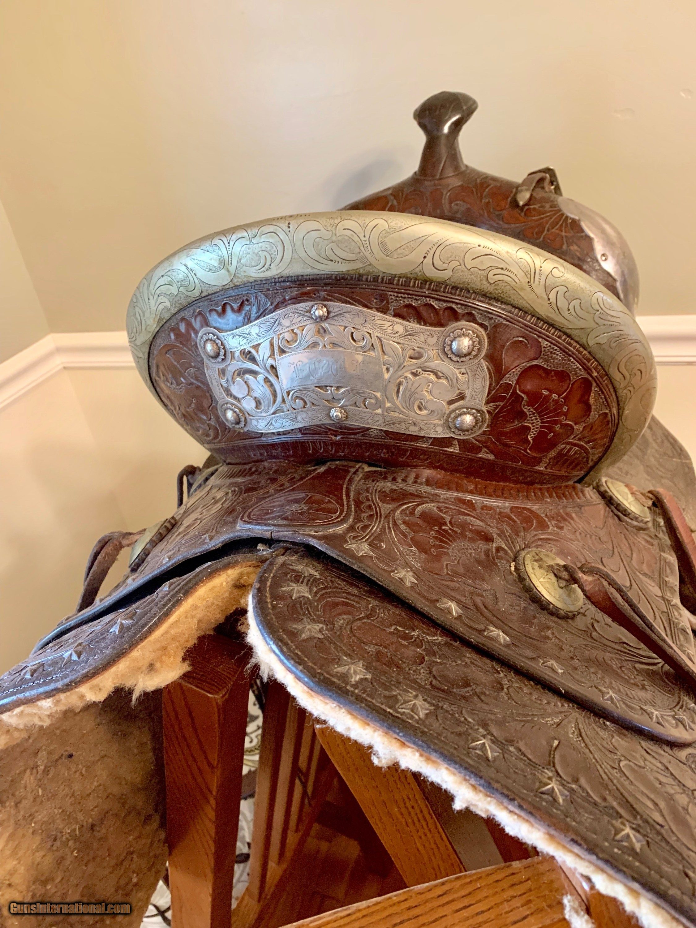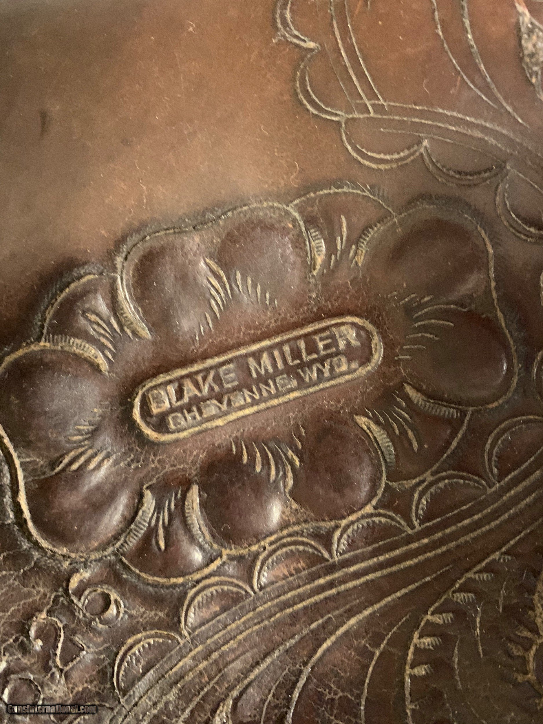 Description: This old high back saddle was probably made for a Texas Ranger. It is outlined in silver stars and the stirrups have silver stars. Made by Blake Miller Cheyenne Wyoming. It has a Bohlin buckle on strap. Silver on seat and other places was probably engraved by Bohlin. This is a fantastic saddle to use or display. SOLD Antique: Yes |