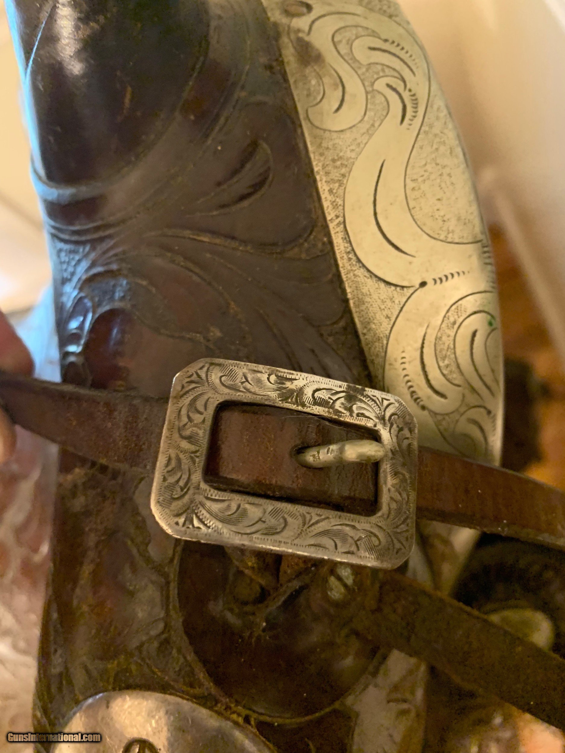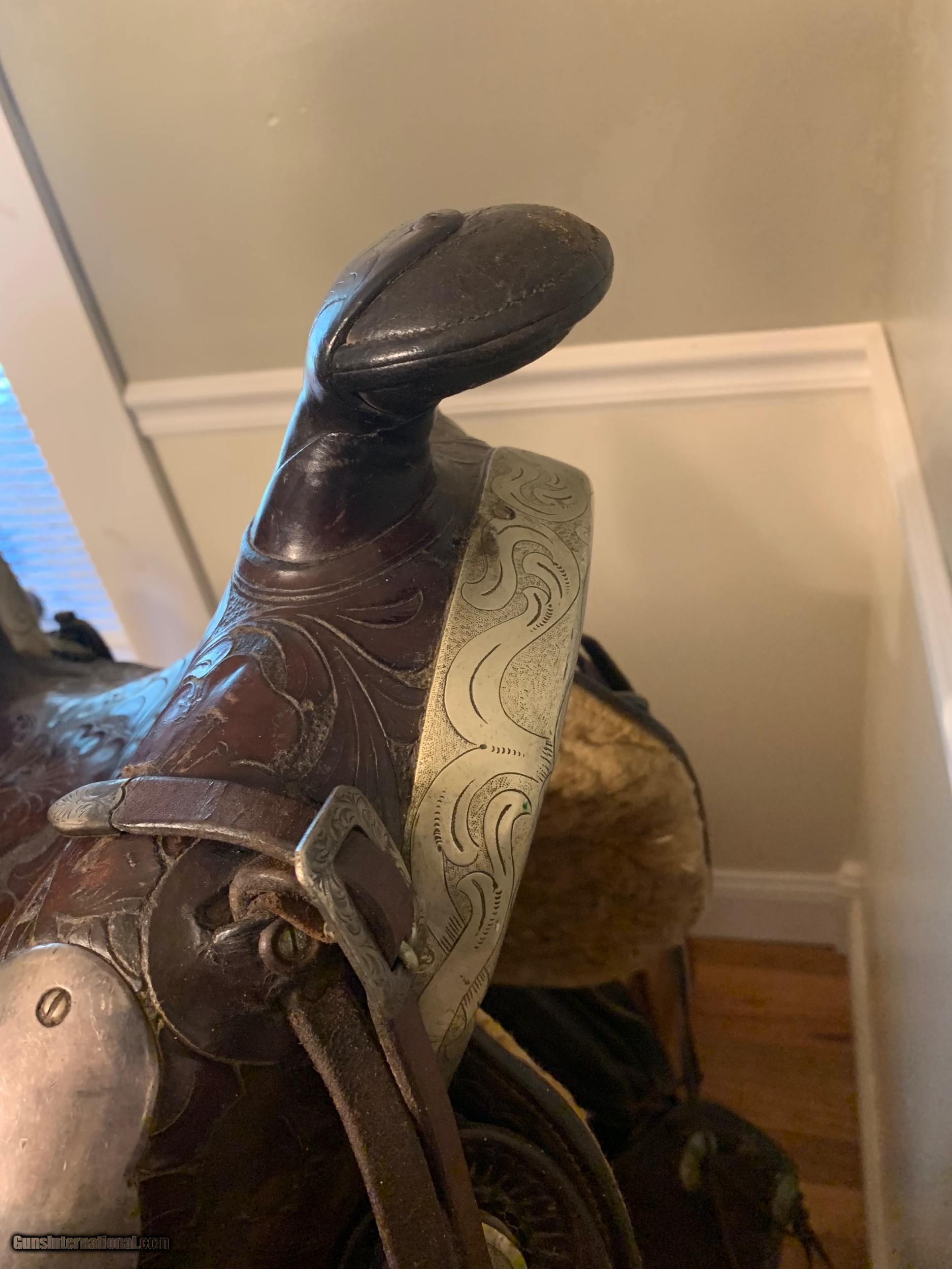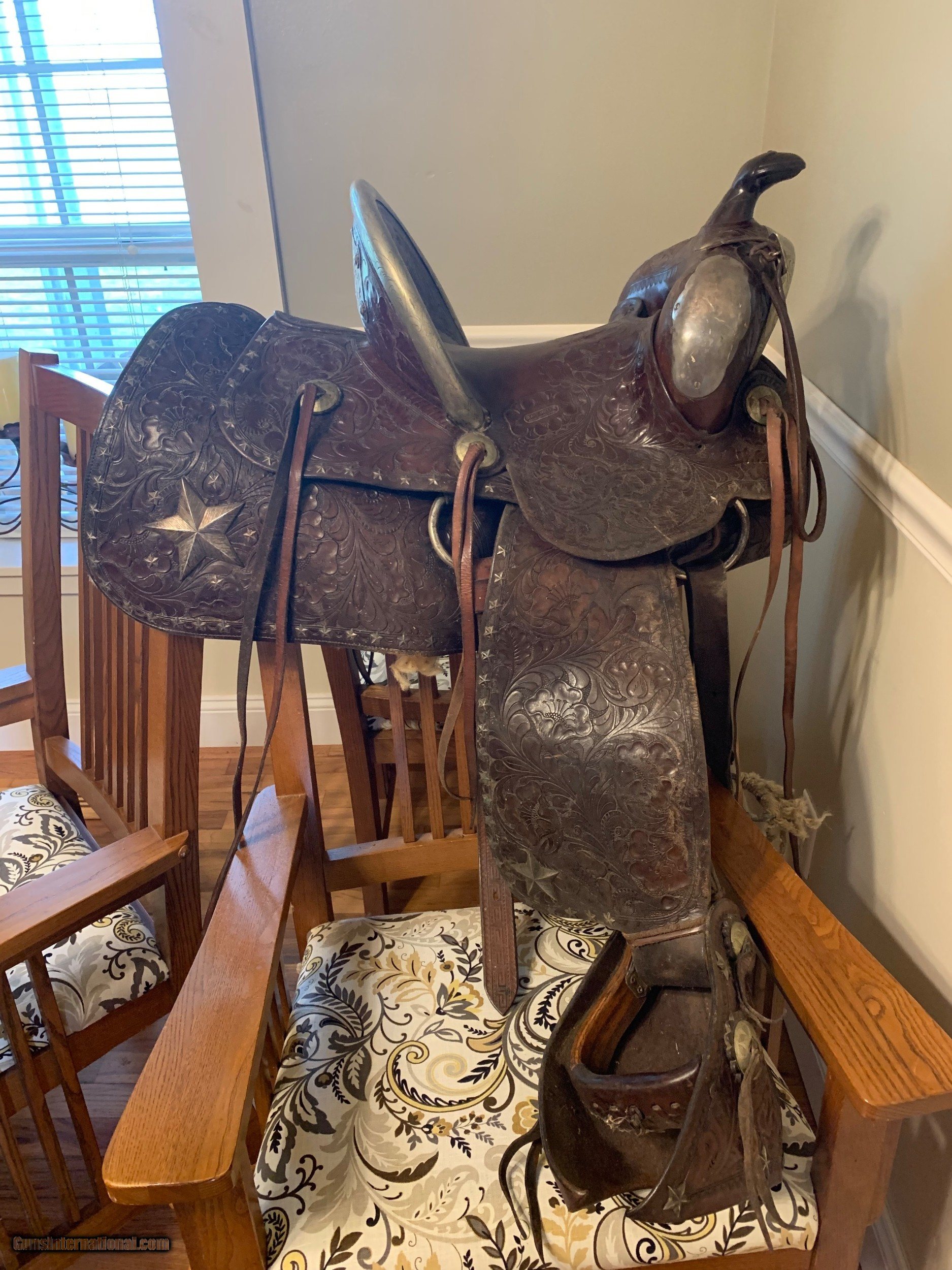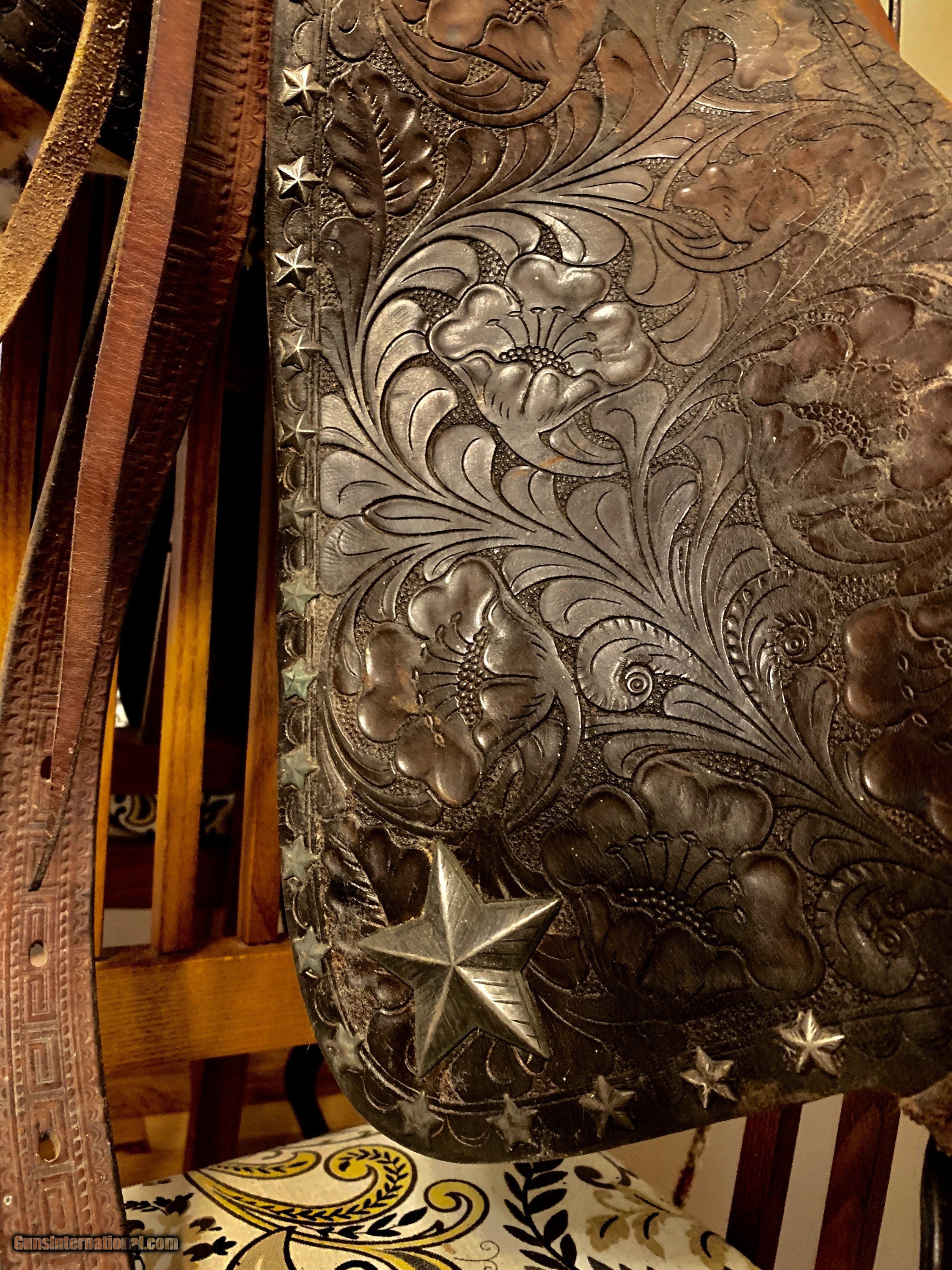 Description: This old high back saddle was probably made for a Texas Ranger. It is outlined in silver stars and the stirrups have silver stars. Made by Blake Miller Cheyenne Wyoming. It has a Bohlin buckle on strap. Silver on seat and other places was probably engraved by Bohlin. This is a fantastic saddle to use or display. SOLD Antique: Yes |