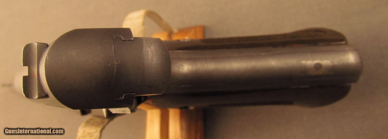 Description: Serial #6363-C, .22 LR, 4 1/2" barrel with an excellent, bright bore. This is a 1950 made pistol that has retained 95-97% of the original blue finish with some traces of silvering at the muzzle and other high edges as well as a handful of minor surface scratches along the sides of the barrel. The checkered dark brown resin grips are in fine-excellent condition with a few minor handling marks and blemishes on either side and little flattening of the points. The pistol comes with a single original magazine and is in excellent condition overall; a great little rimfire Colt auto. FFL or C&R SOLD Curio/Relic: Yes Manufacturer: Colt Model: Challenger Serial Number: 6363-C Caliber Info: .22LR Gauge Info: .22LR |