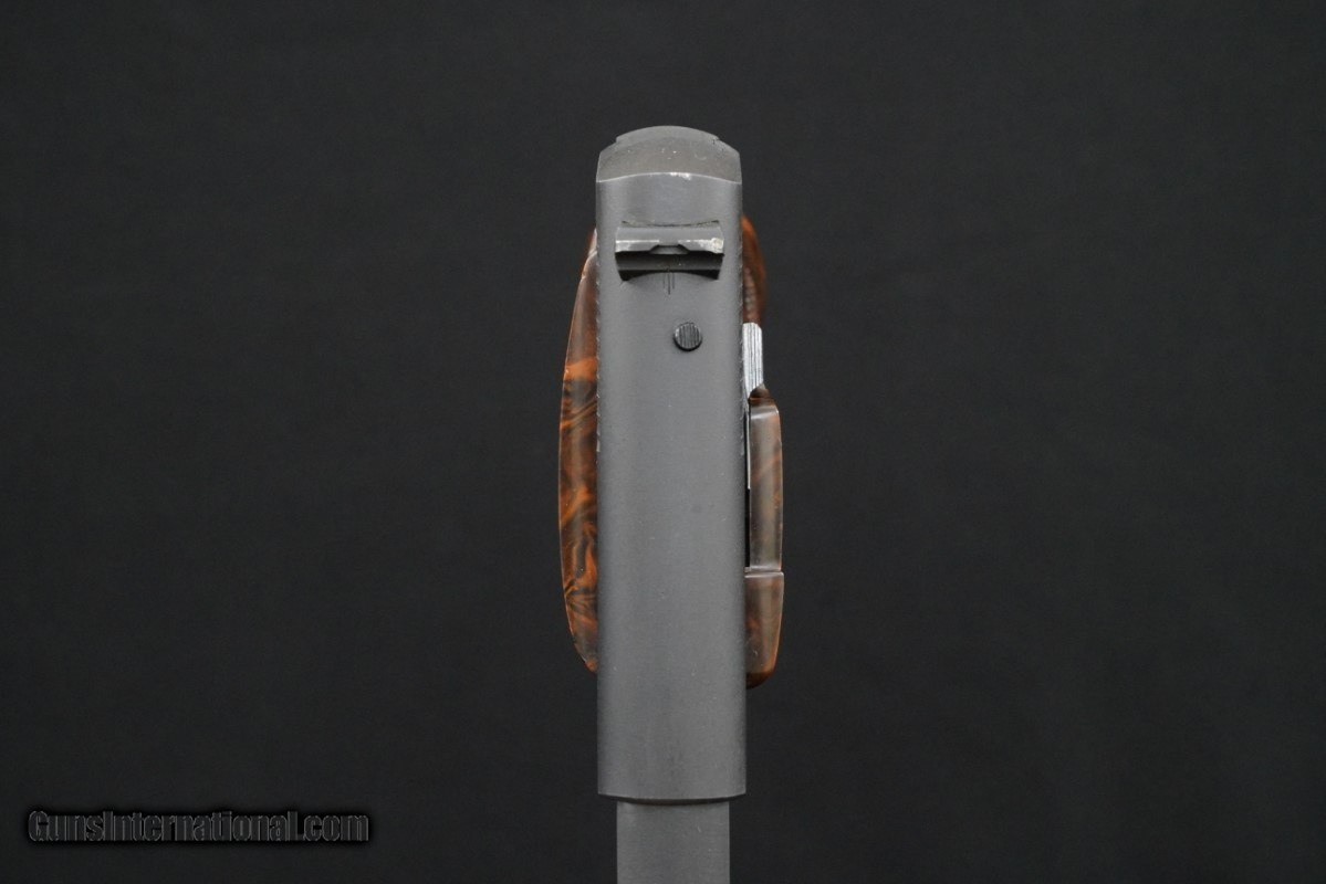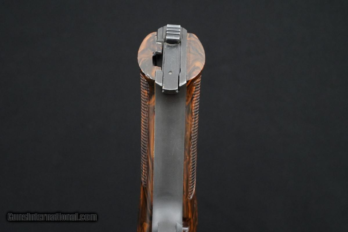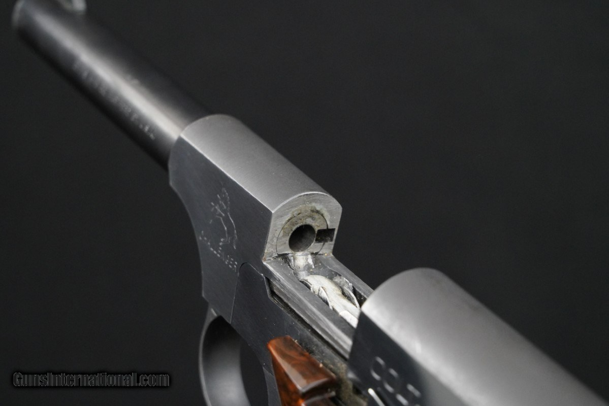 Description: Maker: Colt Model: Challenger Serial Number: 15-C Year of Manufacture: 1950 Caliber: .22LR Action Type: Single Action Semi-Auto with removable magazine Markings: The left side of the slide is marked "COLT" and "AUTOMATIC / CAL .22 LONG RIFLE". The left side of the frame is marked with a rampart Colt over "CHALLENGER" between the slide and barrel. The left side of the barrel vis marked "COLT's MFG. CO. HARTFORD, CT. USA". The right of the frame is marked "15-C" over the trigger. The right of the trigger guard is marked "8" and "4". the left is marked "VP" in triangle Barrel Length: 4 1/2" Sights / Optics: The front sight is a serrated blade fixed to the front of the barrel. The rear sight is a square notch dovetailed to the rear slide. Stock Configuration & Condition: The grips are two-piece "Coltwood" brown plastic with a rampart colt in the circle at the top of the right panel. There are a couple of scuffs on the smooth portions, most noticeable on the left panel above the checkering. There are a couple of little dings, most noticeable on the bottom edge of the left panel. The checkering is strong. There are no chips or cracks. Overall, the grips are in FINE condition. Type of Finish: Blued Finish Originality: Original Bore Condition: The bore is bright and the rifling is sharp. There is zero erosion. Overall Condition: This pistol retains about 93% of it's metal original finish. There are a few little nicks on the barrel, an a little finish loss on the sides at the muzzle. There are a few scattered scuffs on the matted portions. There is some thinning on the edges. There are a couple of little nicks on the back edge of the top of the slide. There is a slight ding on the left corner of the rear sight. There are one or two tine freckles of frost. The screw head is lightly worn with a strong slot. The markings are clear. Overall this pistol is in fine contition. You may not see some of the mark described they are so faint. Mechanics: The action functions correctly. The slide is not designed to lock back on an empty magazine. The manual safety can be used to lock the slide forward or to the rear. I have fired this pistol and it operates smooth and flawlessly. Box, Paperwork, & Accessories: A single ten (10) round magazine is included Assessment: This is a Colt Challenger pistol made in 1950, the first year of production and possibly the first day of production. It has a 4 1/2" round barrel, fixed sights and heel magazine release. John M. Browning designed "Colt's Automatic Pistol, Caliber .22, later to become the Woodsman, with the design refined slightly by Colt employees George Tansley and F.C. Chadwick before it was released in 1915 and the Woodsman stayed in production until 1977. This pistol in in about Fine overall condition with about 93% of it's original finish remaining, showing signs of normal use over the last 70 years. The bore is bright with sharp rifling and no erosion. This would make a GREAT addition to a Colt collection, it looks good, is from the first year of production, and better yet has a two digit serial number. Please examine the photos of this beauty. Shipping / Handling / Insurance: $35 USPS 2-day Priority Mail. This C&R FFL03 will ship to FFL01 Dealers and FFL03 C&R License holders. Add 3% - Credit Card Fees. Visa, MC, Amex. SOLD Curio/Relic: Yes Handgun Caliber: .22 Long Rifle Manufacturer: Colt Model: Challenger Serial Number: 15-C Barrel Length: 4.5 Bore: Bright Condition: Excellent Bore Condition: Strong Rifling Action: SEmi Auto |
