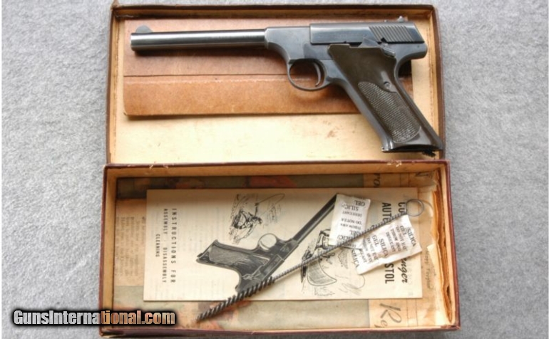 Description: This is a very nice Colt Challenger. The pistol is in very good condition. You also get a nice and we think correct box, manual and bore brush. There is a news paper folded in the bottom of the box from Dec 15 1957. SOLD Caliber Info: .22 Long rifle. Chambers: Semi-auto. Metal Condition: Very good with minor holster wear. Wood Condition: The grips are very nice. Bore Condition: Bright and shiny. Barrels: 6 inch bue with sights. Triggers: Single. Stock: Brown Colt grips. Weight: 2 Lbs even. Sights: Fixed. Extras: Comes with the Colt box, (brown with gold and green end lable) bore brush and paperwork.The box is in fair to good condition. Item Location: Owatonna, MN |