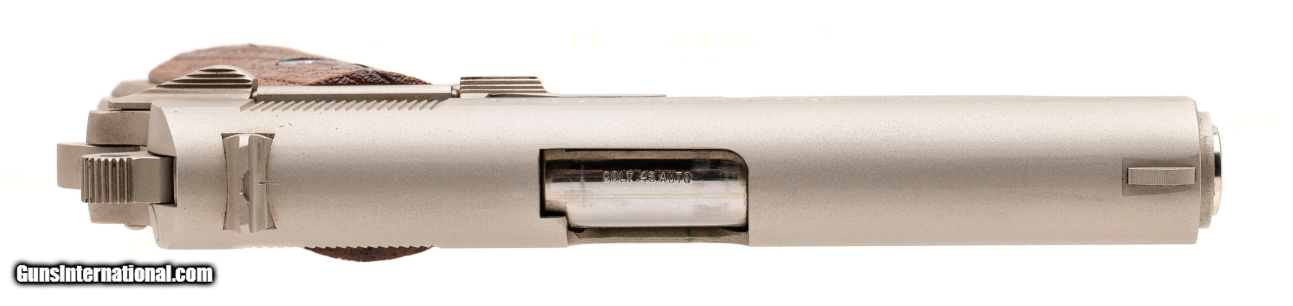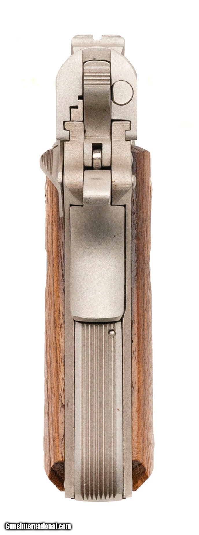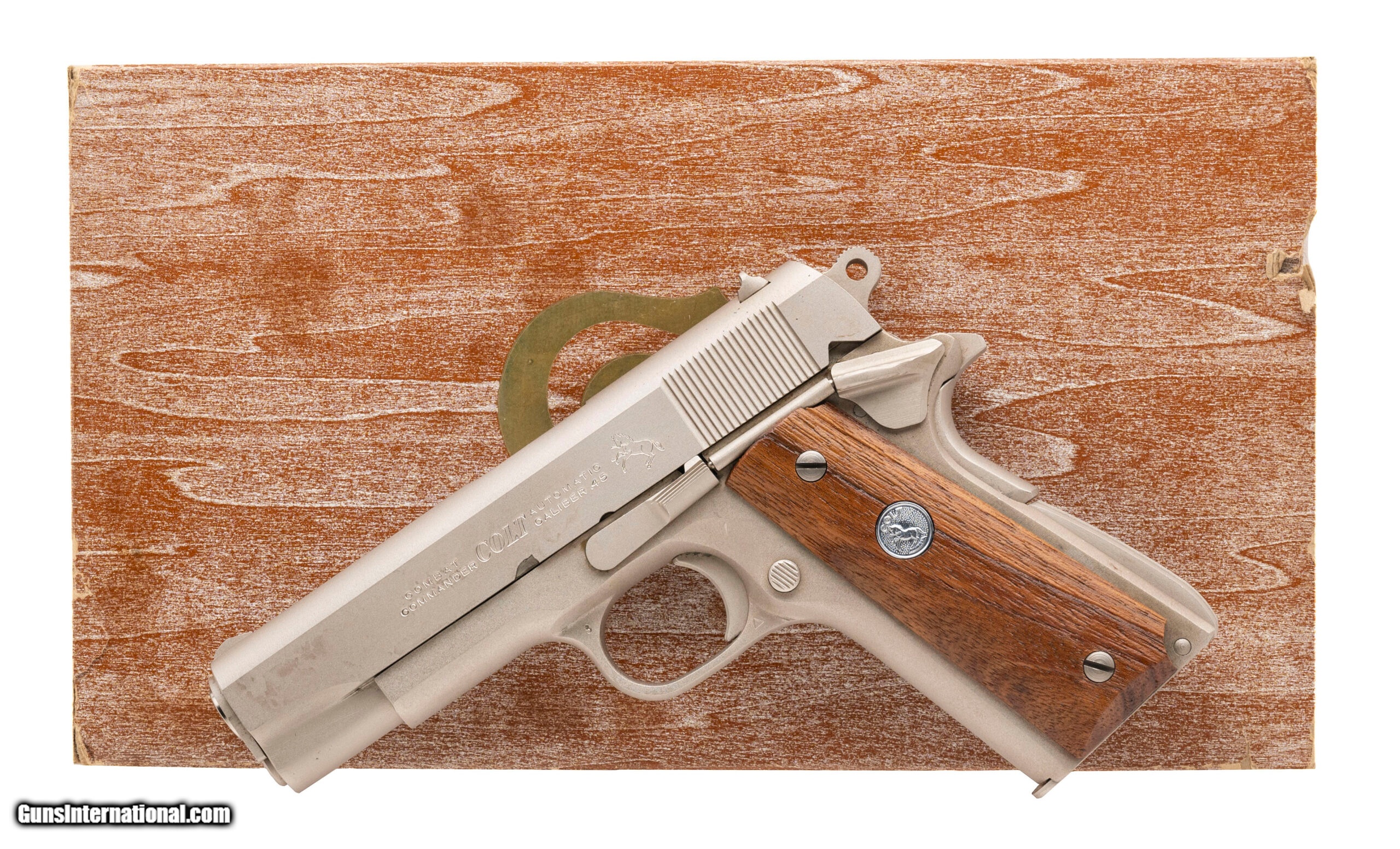 Description: "SN: 70SC26268. Made in 1973, .45 ACP with a 4.25-inch barrel. This Combat Commander is “new in box" and remains in unfired condition with excellent original factory satin finish across the metal parts and a bright bore that reveals strong visible rifling. Comes with one factory 7-round magazine. In original box with Styrofoam inserts and original warranty registration card. SOLD |