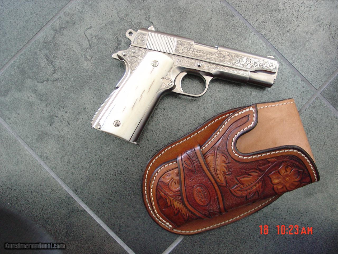Description: Here is a total showpiece work of art Colt Combat Commander,semi automatic in 45 ACP,with a 4 1/2" barrel,& deep hand engraved by master engraver Willy B Ellis of Tarpon Springs Florida,& was fully refinished in bright & mat nickel,& never fired since being refinished, comes with a set of genuine Giraffe grips with great grain & colors !! gun reflects all the background-so its way nicer in person. its around 38 years old,made circa 1978. comes with a beautiful carved leather holster from Black Creek Leather in Florida serial #70SC76375 and also comes with a brand new soft zippered case.a one of a kind work of art,& a real steal at only $3695.firm + $35. shipping to your FFL dealer only. I am an FFL dealer,located in the Clearwater,Florida area.I accept bank wire transfers, direct deposits to Wells Fargo Bank,cashiers checks,postal & bank money orders,or personal & business checks but those take time to clear. no credit cards or PayPal-sorry.I now offer 60 day layaway with 1/3rd down & 1/3rd per month.be sure to check out all my other unique listings. SOLD |