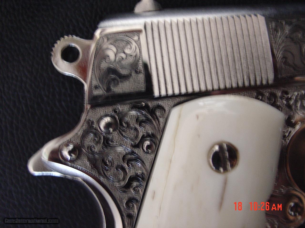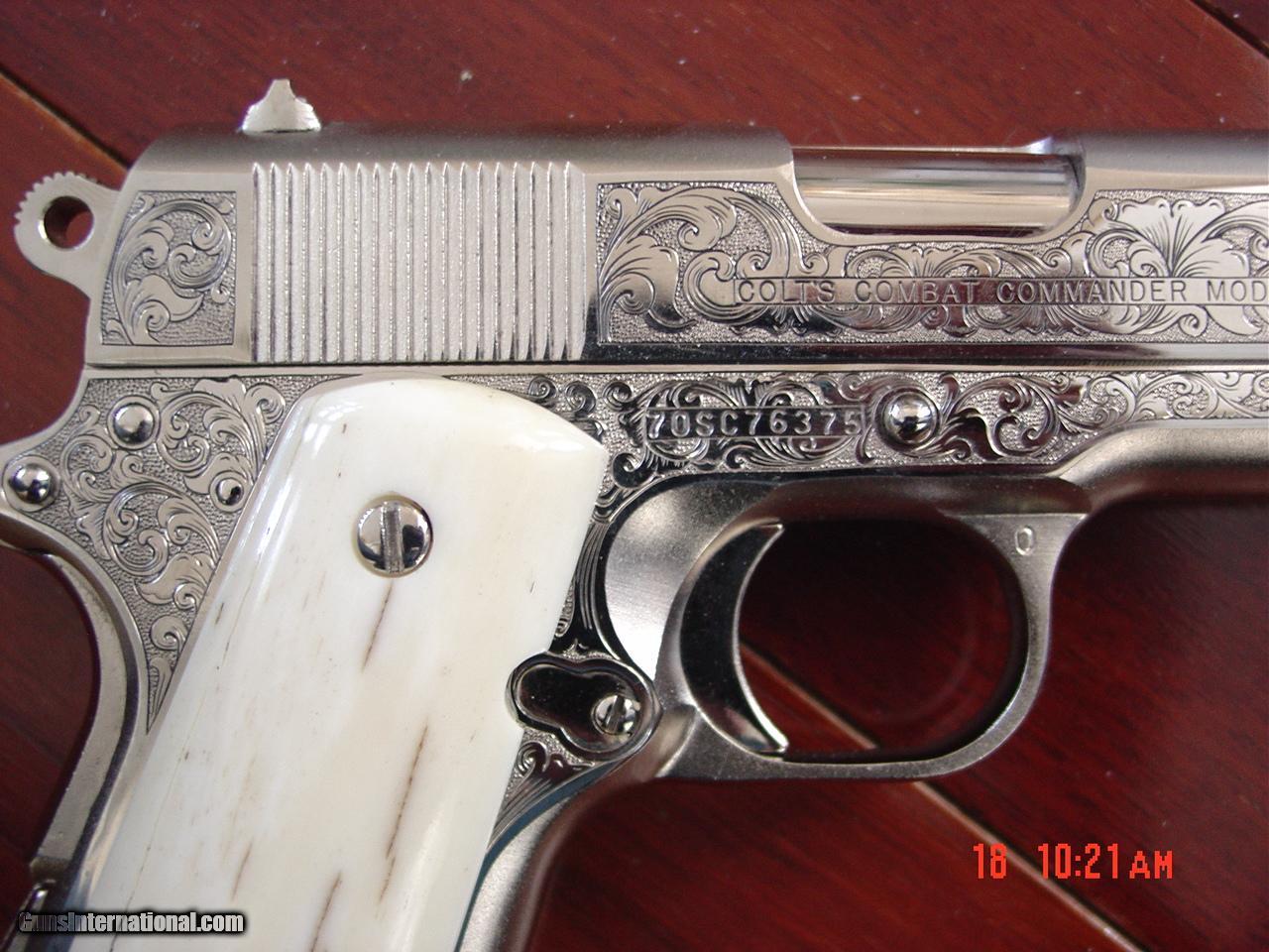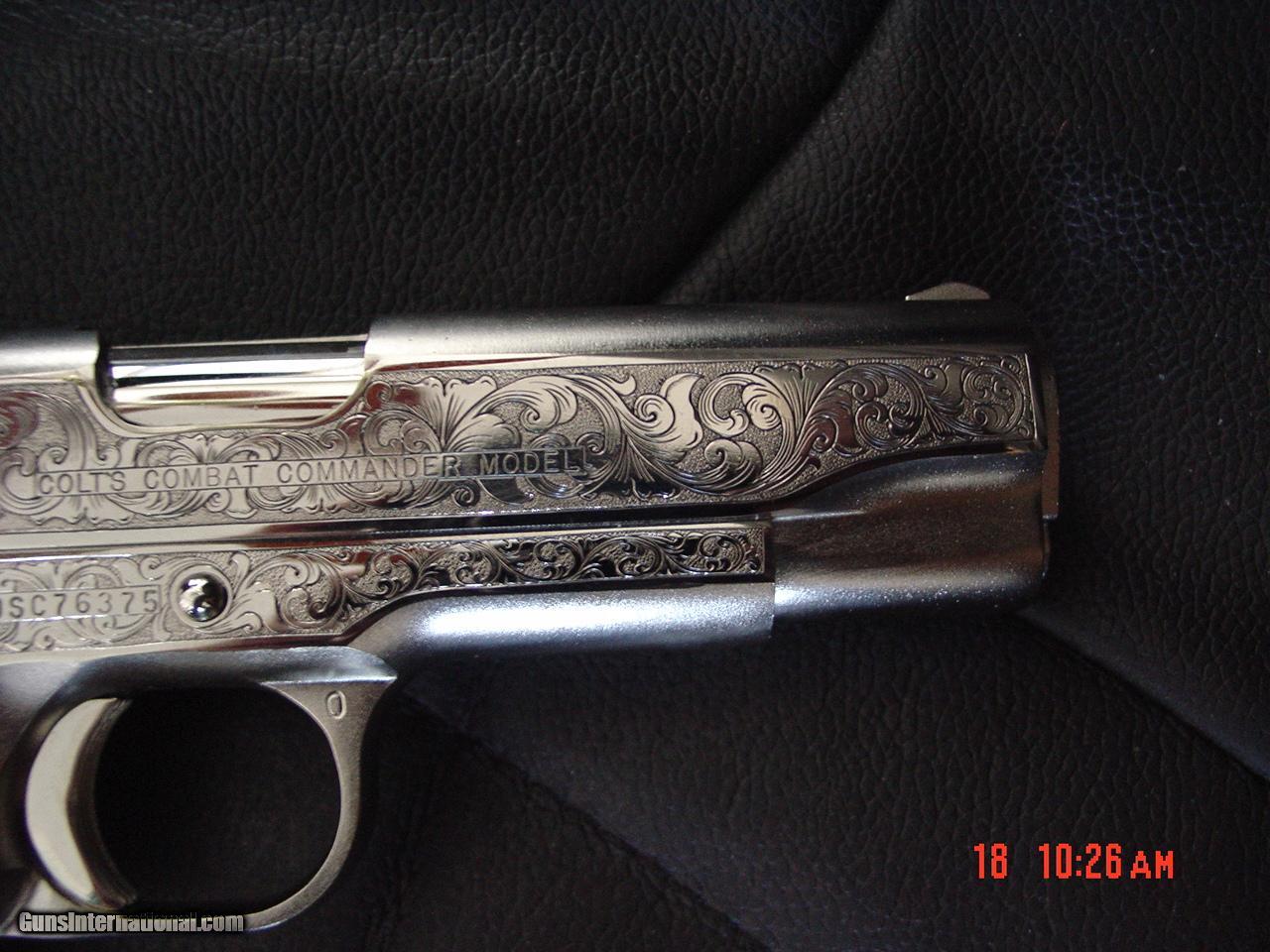 Colt Combat Commander 45,4 1/2",deep hand engraved by Willy B,& fully refinished bright & mat nickel,real Giraffe grips,holster,circa 1978,awesom