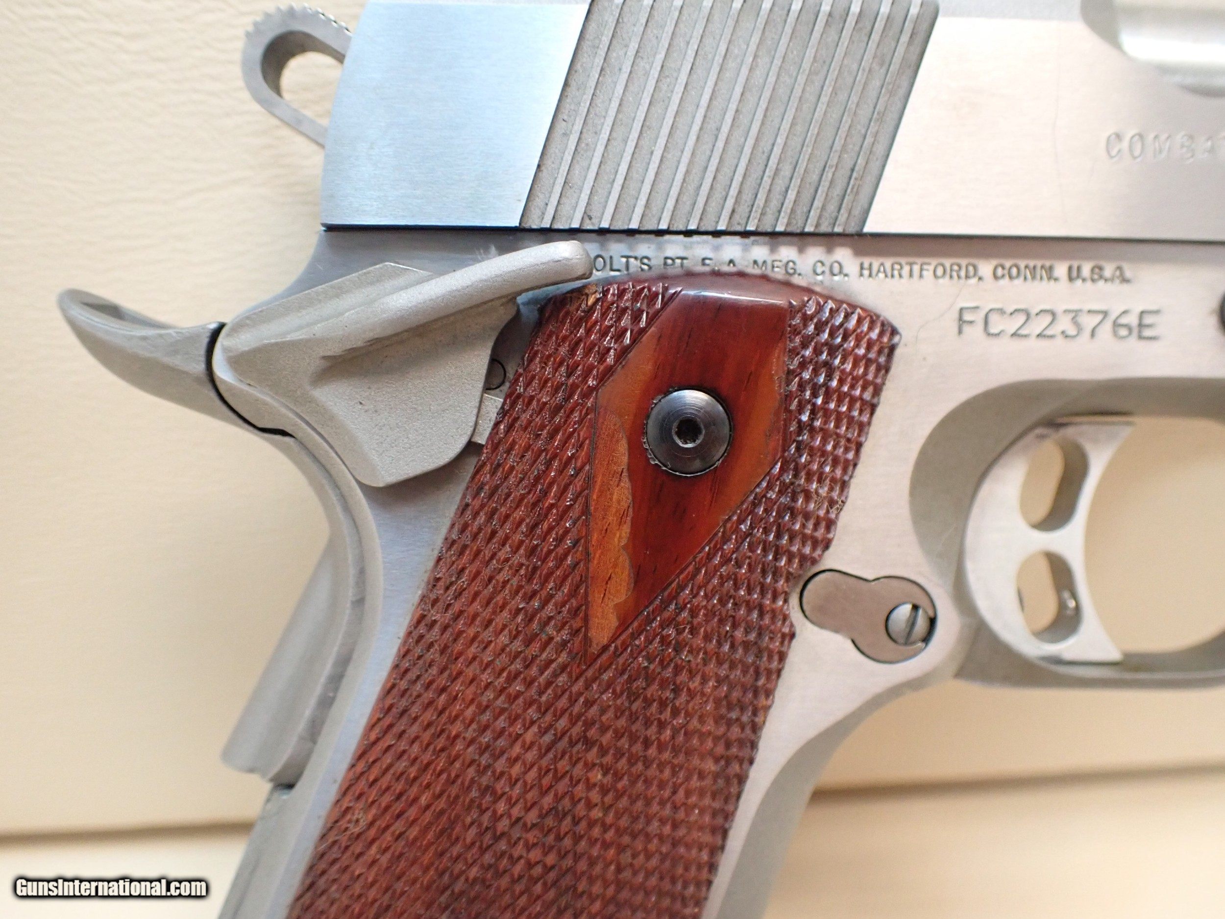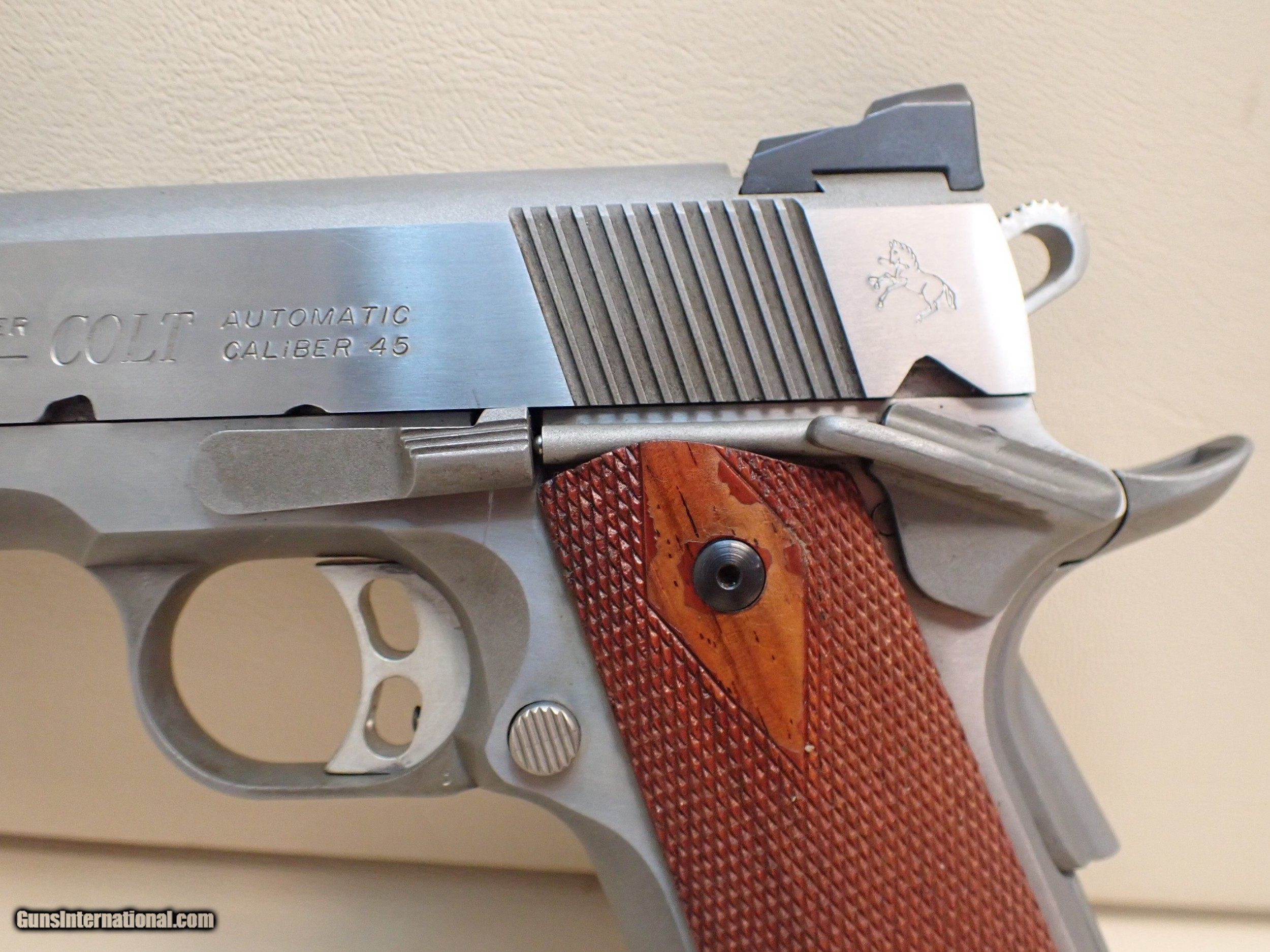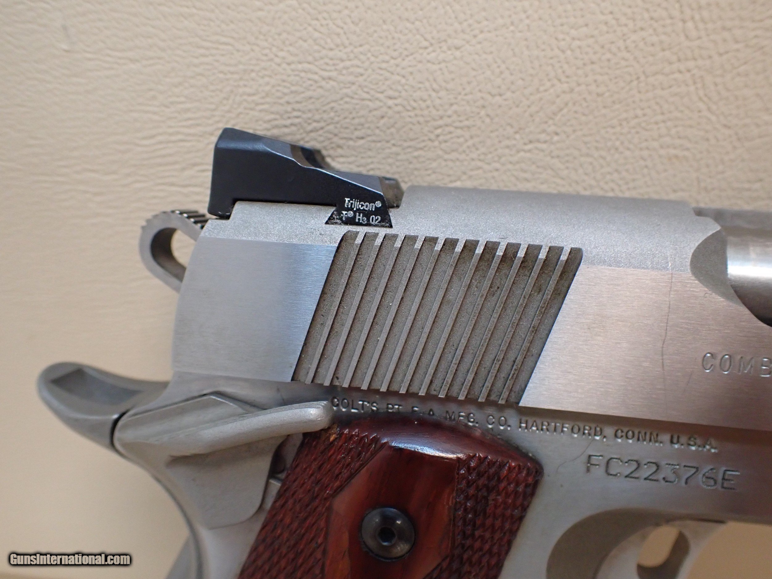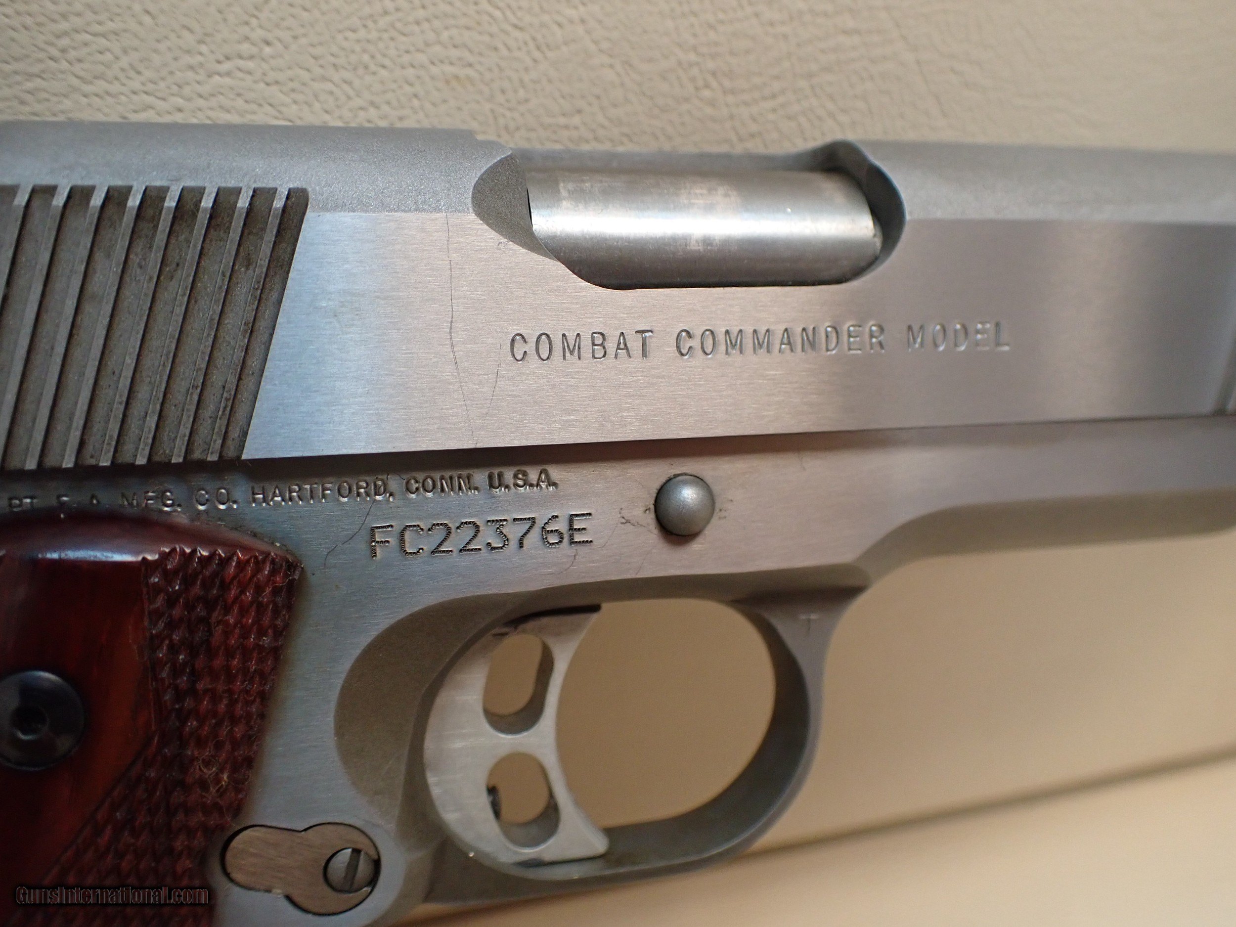 Description: Colt Combat Commander .45ACP semi automatic pistol, dated to 1999. This pistol features the classic 1911 design, with a stainless steel construction, a handy commander size, an ambidextrous safety lever, and checkered hardwood grip panels. The pistol is fitted with Trijicon night sights, which unfortunately have lost their luminescence, however still function nicely as target sights with the broad rear sight. The pistol has polished flats on the frame and slide, and a matted finish on the inside rounds. The pistol is in great working order with a glass-smooth action, very nice trigger pull and a superb bore. Some signs of age and light/normal use are present, as well as some marks handling, assembly and disassembly, etc. It would appear that some of the stain/finish is peeling in areas of the grips, as shown. The forward serrations on the slide are a very nice touch, allowing for easy manipulation while shooting. Don't miss out on owning this unique 1911 configuration! No handgun sales in MA. Includes one Colt magazine. SOLD Manufacturer: Colt Model: Combat Commander Serial Number: FC22376E Caliber Info: .45ACP |