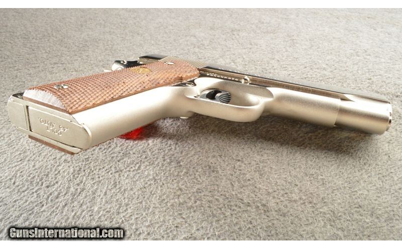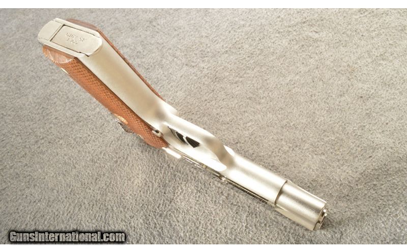 Description: Colt Combat Commander in 9 mm. Features the satin nickel finish. Comes with one (nickel) magazine. No box or papers. OVERALL CONDITION: Very good. METAL CONDITION: Many scattered small scratches and rubs on the slide. Scattered spots (black) of corrosion like those seen on the mainspring housing. Light takedown scratch on the frame. GRIPS CONDITION: Sandblasted grips look very good to excellent. BORE CONDITION: Bore looks excellent. 9mm Luger SOLD Chambers: 1 Metal Condition: Minor use and handling wear. Wood Condition: Very good. Bore Condition: Excellent. Barrels: 1 Triggers: 1 Weight: 2 1/4 lbs Sights: Fixed blade front/Notch rear dovetail. Item Location: Owatonna, MN |