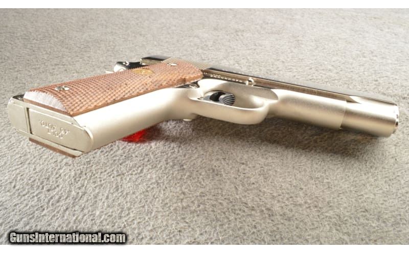 Description: Colt Combat Commander in 9 mm. Features the satin nickel finish. Comes with one (nickel) magazine. No box or papers. OVERALL CONDITION: Very good. METAL CONDITION: Many scattered small scratches and rubs on the slide. Scattered spots (black) of corrosion like those seen on the mainspring housing. Light takedown scratch on the frame. GRIPS CONDITION: Sandblasted grips look very good to excellent. BORE CONDITION: Bore looks excellent. 9mm Luger SOLD Chambers: 1 Metal Condition: Minor use and handling wear. Wood Condition: Very good. Bore Condition: Excellent. Barrels: 1 Triggers: 1 Weight: 2 1/4 lbs Sights: Fixed blade front/Notch rear dovetail. Item Location: Owatonna, MN |