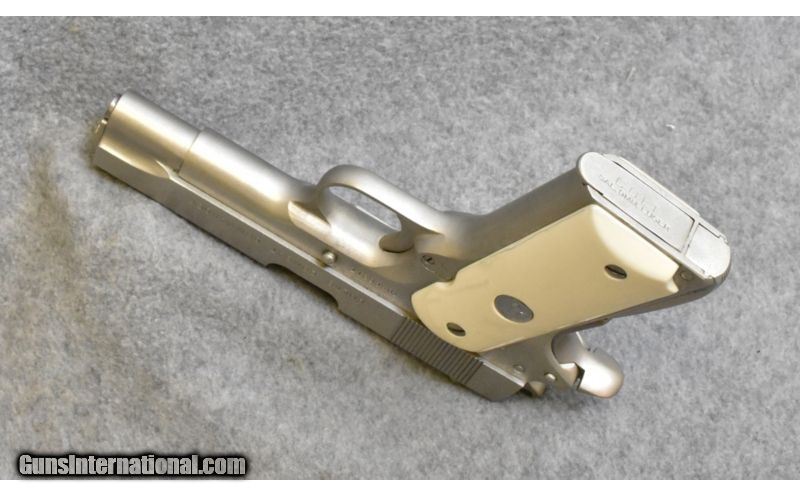Description: Satin nickel finish. Series 70. SOLD Manufacturer: 1972 Caliber Info: 9mm Metal Condition: very good condition, some slight tarnish on the frame and slide, a few light handling marks on the slide, some light wear on the trigger Wood Condition: grips are in good condition, right grip panel is showing some cracking finish, right grip also has a few shallow cracks Bore Condition: bright and sharp Barrels: 4 inch Triggers: single, grooved trigger Stock: smooth, faux-Ivory grips with silver Colt medalions Weight: 2 lbs 6 oz Sights: fixed blade front, dovetailed U notch rear Extras: comes with one extra magazine and its original Colt box Item Location: Kansas City, KS |