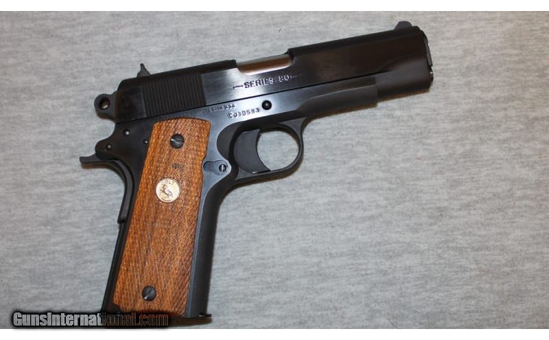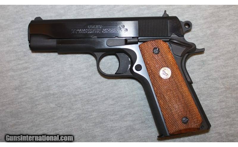 Description: Appears as new with one mag and original box. Colt Series 80 Commander semi auto pistol, 4 1/4" barrel, blued finish, iron sights, single action trigger, Commander hammer, rear slide serrations and Colt checkered wood grip panels. An excellent choice for Colt collectors. .45 Auto SOLD Chambers: Semi auto Metal Condition: As new Bore Condition: Bright Barrels: 4 1/4 Triggers: Single action Butt Pad: Wood grips Sights: 3 Dot iron sights Item Location: La Vista, NE |