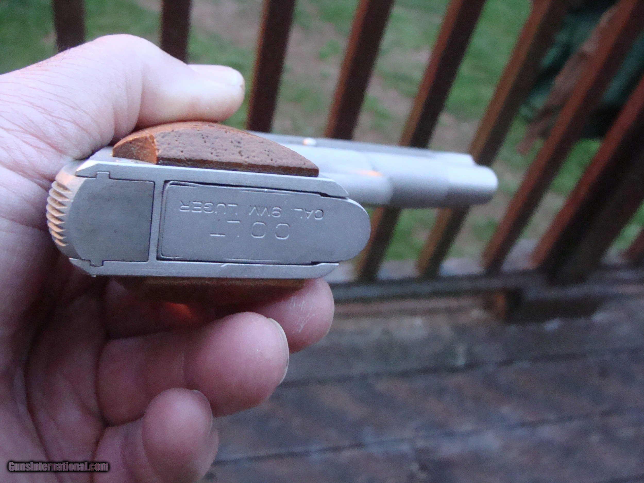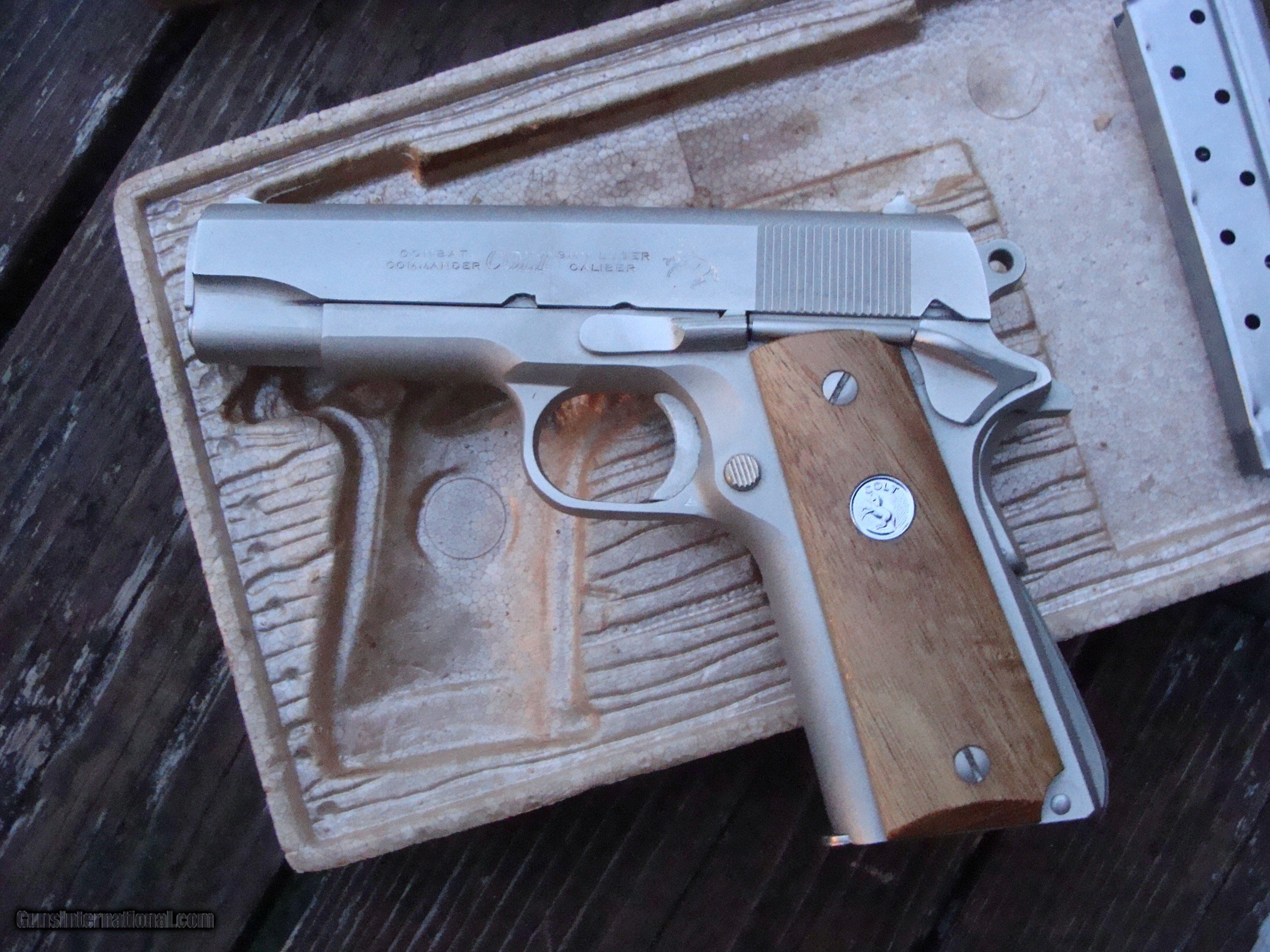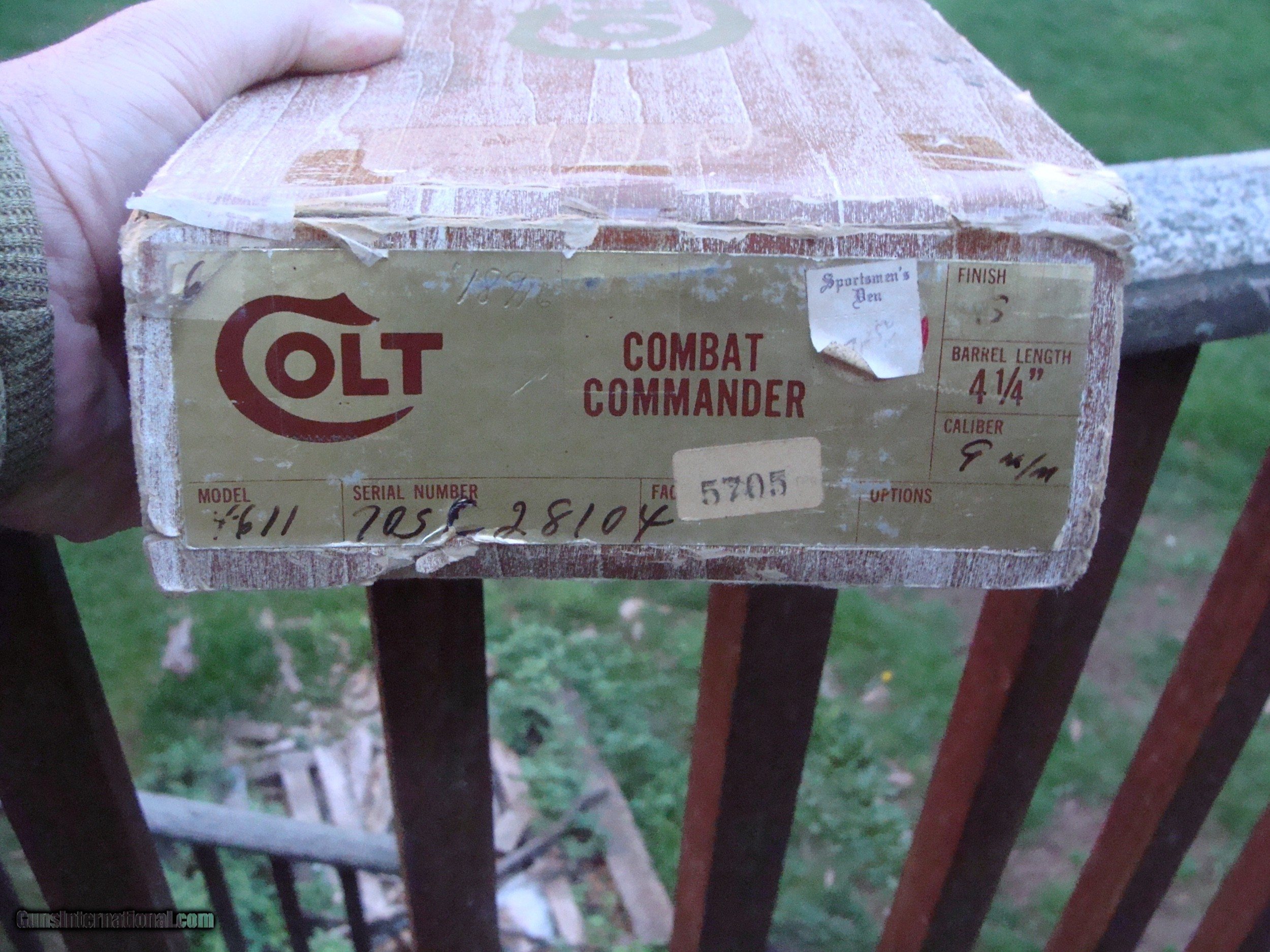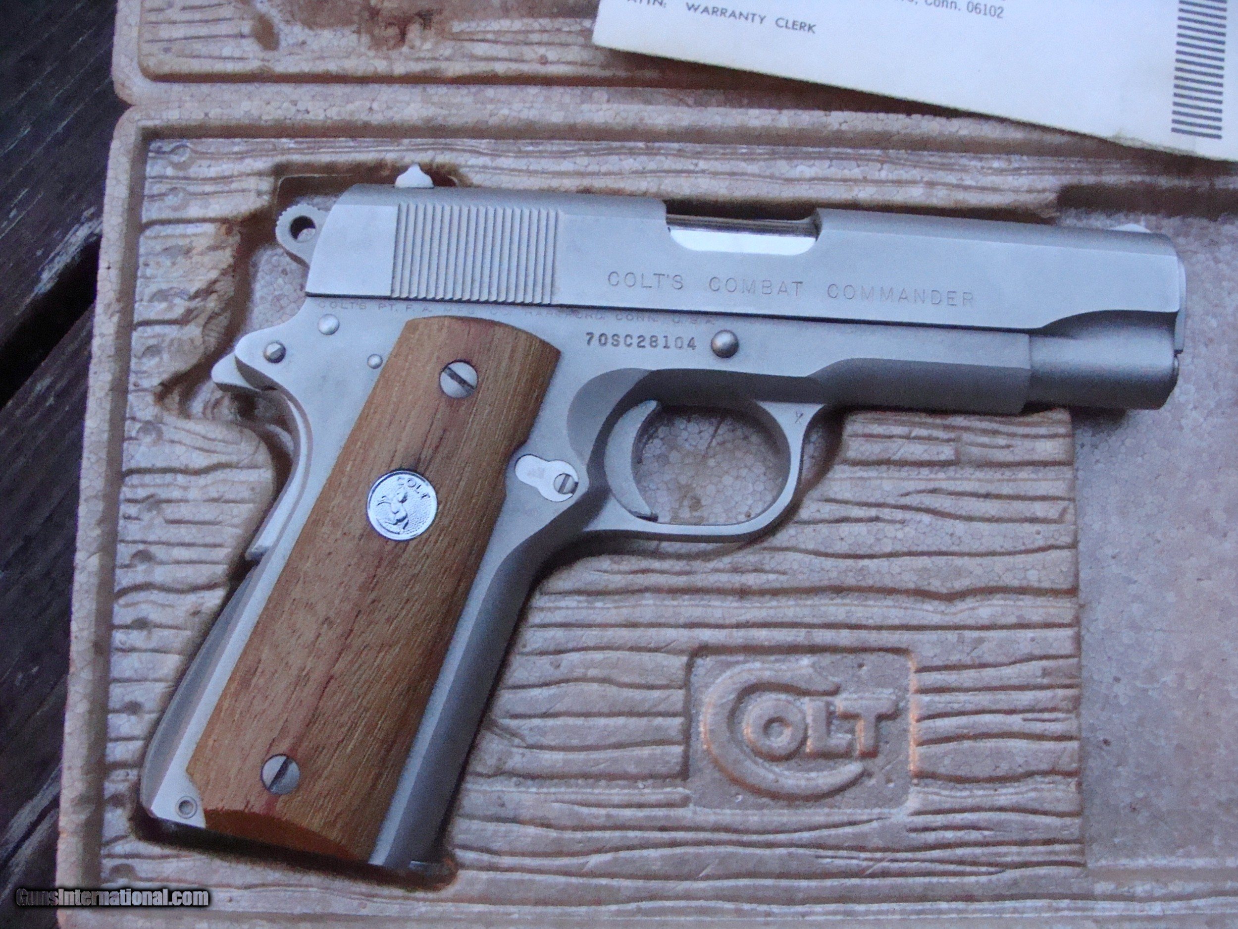 Description: Just in, and in not far from new condition a beautiful E Nickel original series 70 9mm Combat Commander (We also have a nearly identical one in 45 to be listed her on GI shortly) Rare in this condition and in this cal. Box is a little rough but has the correct box with both flaps, orig warranty card and one extra mag. Only a few light rub marks (not scratches) keep this from being called 99% or new cond. This fine original not reintroduced 70 Series was made in 1974 is in incredible condition for its approx 45 yrs on the planet. This is a consignment gun that has come with a number of other good Colts as well as others WE ARE AN FFL 1 IN THE NORTHEAST WHERE MANY FINE US MADE GUNS WERE PRODUCED AND WE OFTEN GET SOME FARILY HARD TO FIND AND HARDLY USED GUNS. (WE ALSO KEEP AN INVENTORY OF OLDER PERIOD CORRECT SCOPES; CALL WITH NEEDS) WE MOSTLY PICK VERY CLEAN GUNS, PRICE THEM FAIRLY AND WORK WITH MODEST MARGINS WE ARE HAPPY TO TAKE CONSIGNMENT GUNS AND COLLECTIONS OR WILL BUY YOURS OUTRIGHT. WE SOMETIMES ARE EMPLOYED FOR ESTATE PURPOSES AND VALUATIONS. CT RESIDENTS MUST CONTACT US TO UNDERSTAND OUR IN STATE TRANSFER POLICIES. WE CAN TAKE A CREDIT CARD HOWEVER THERE IS A 3% ADD ON BASED ON THE TOTAL FOR USE OF A CARD. IT IS ALWAYS THE BUYERS RESPONSIBILITY TO GET US A COPY OF YOUR RECEIVING FFL'S LIC PRIOR TO THE GUN BEING SHIPPED....WE DO NOT CALL FOR YOU. SHIPPING IS $ 30.00 TO MOST LOCATIONS IN THE LOWER 48 STATES. MOST OFTEN BUT NOT ALWAYS WE SHIP IN SPECIALTY SHIPPING CARTONS AND RATES AS QUOTED ARE USUALLY SLIGHLTY HIGHER THAN ACTUAL; THE DIFFERENCE GOES INTO A RESERVE FOR OUR (SELF) INSURANCE AS WE FIND THE CARRIERS NEVER PAY FIREARMS CLAIMS. WE DO OFFER A LAYAWY 1/3 DOWN BAL W/IN 30 DAYS TIME BEING OF THE ESSENCE ON MANY OF OUR GUNS. SOLD |