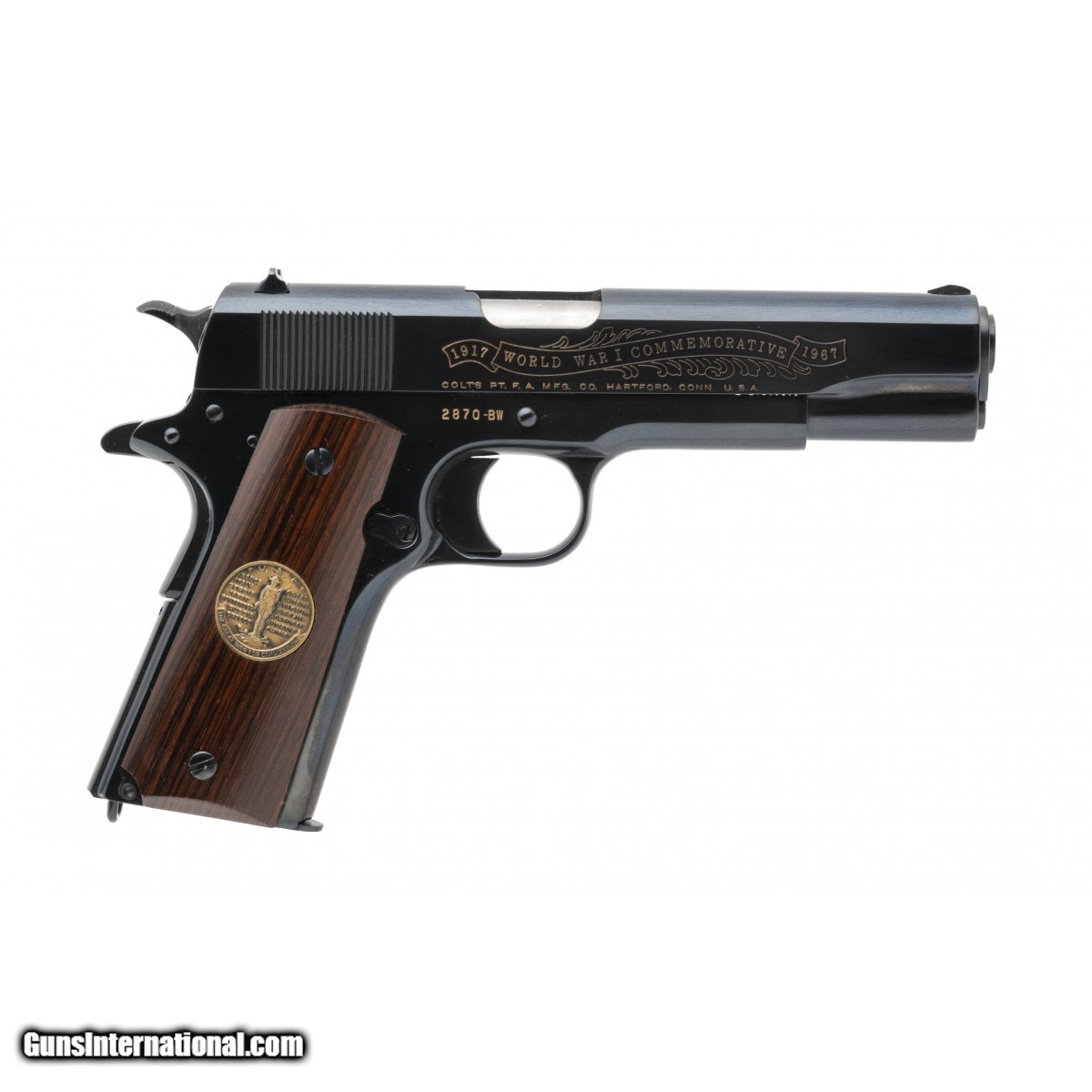 Description: " SN: 2870-BW. Made in 1968. .45 ACP with 5"" barrel. WWI Series Battle of Belleau Wood commemorative 1911 pistol with display case. Excellent condition. SOLD |