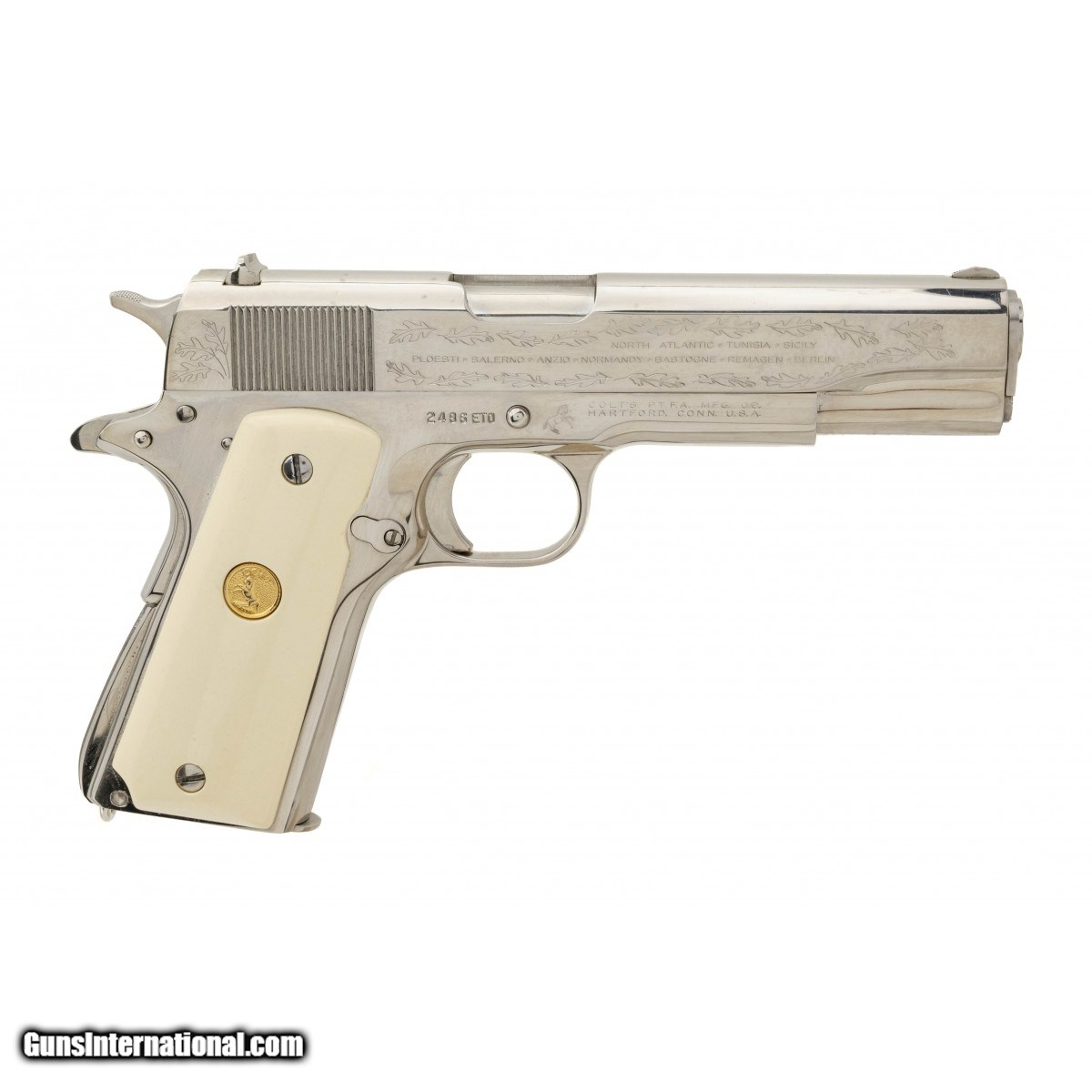 SN:2486ET0. Made in 1970, .45 ACP, 5"" barrel. WWII commemorative pistol with fancy grips. Very good condition with light wear.