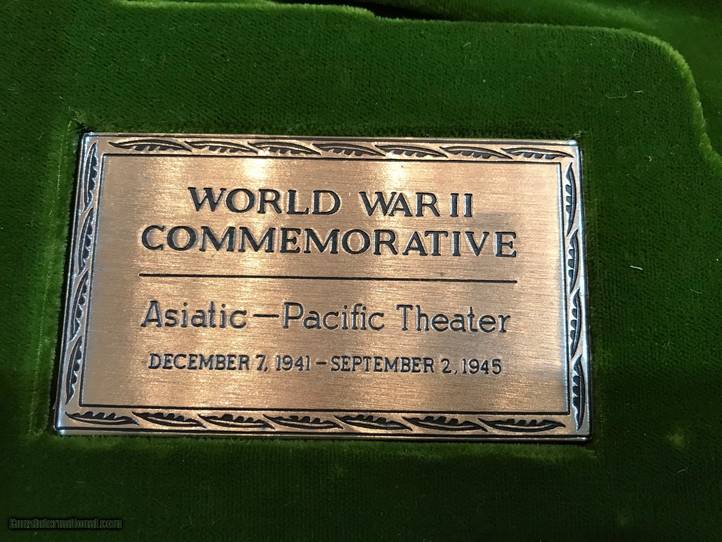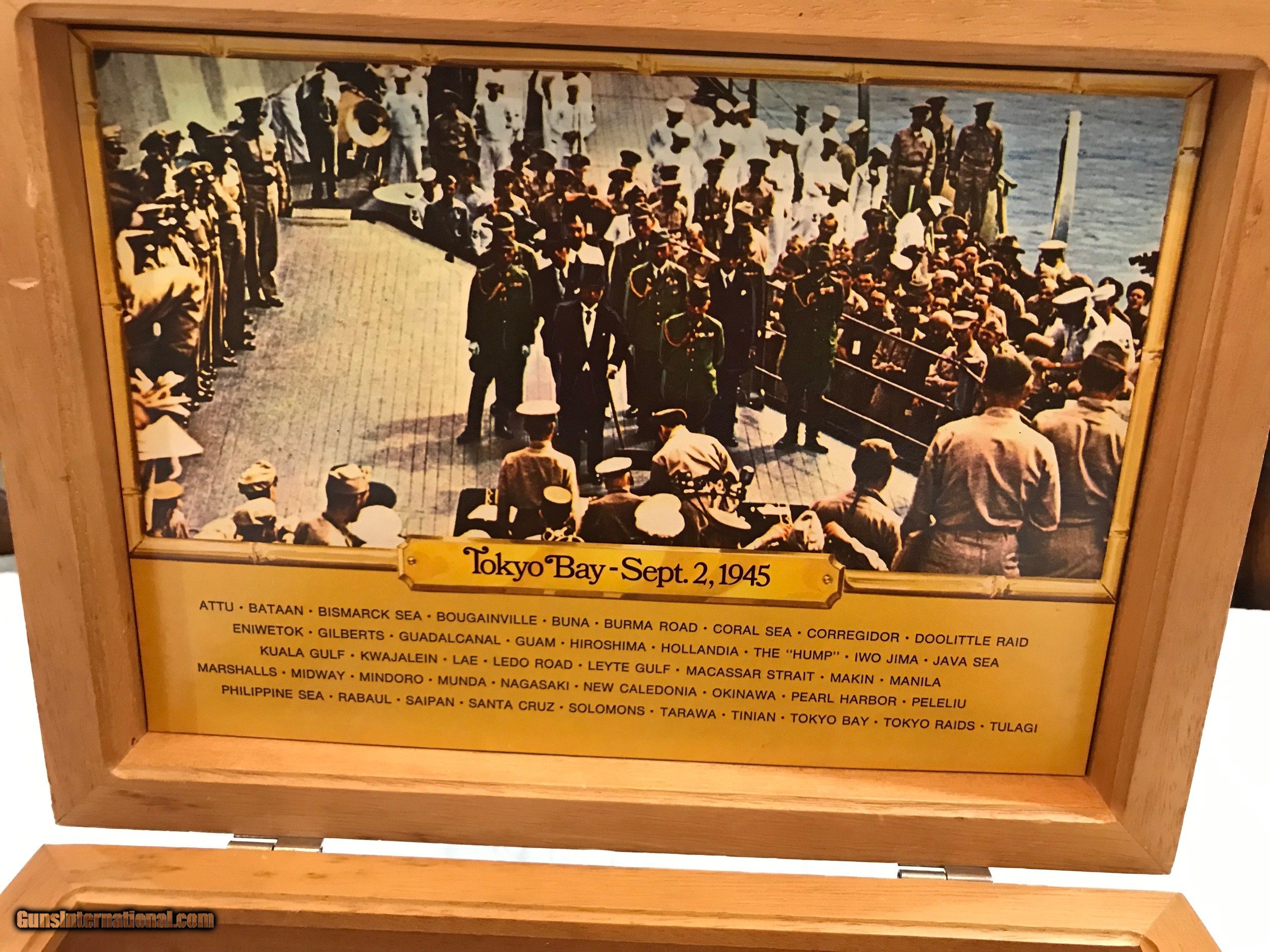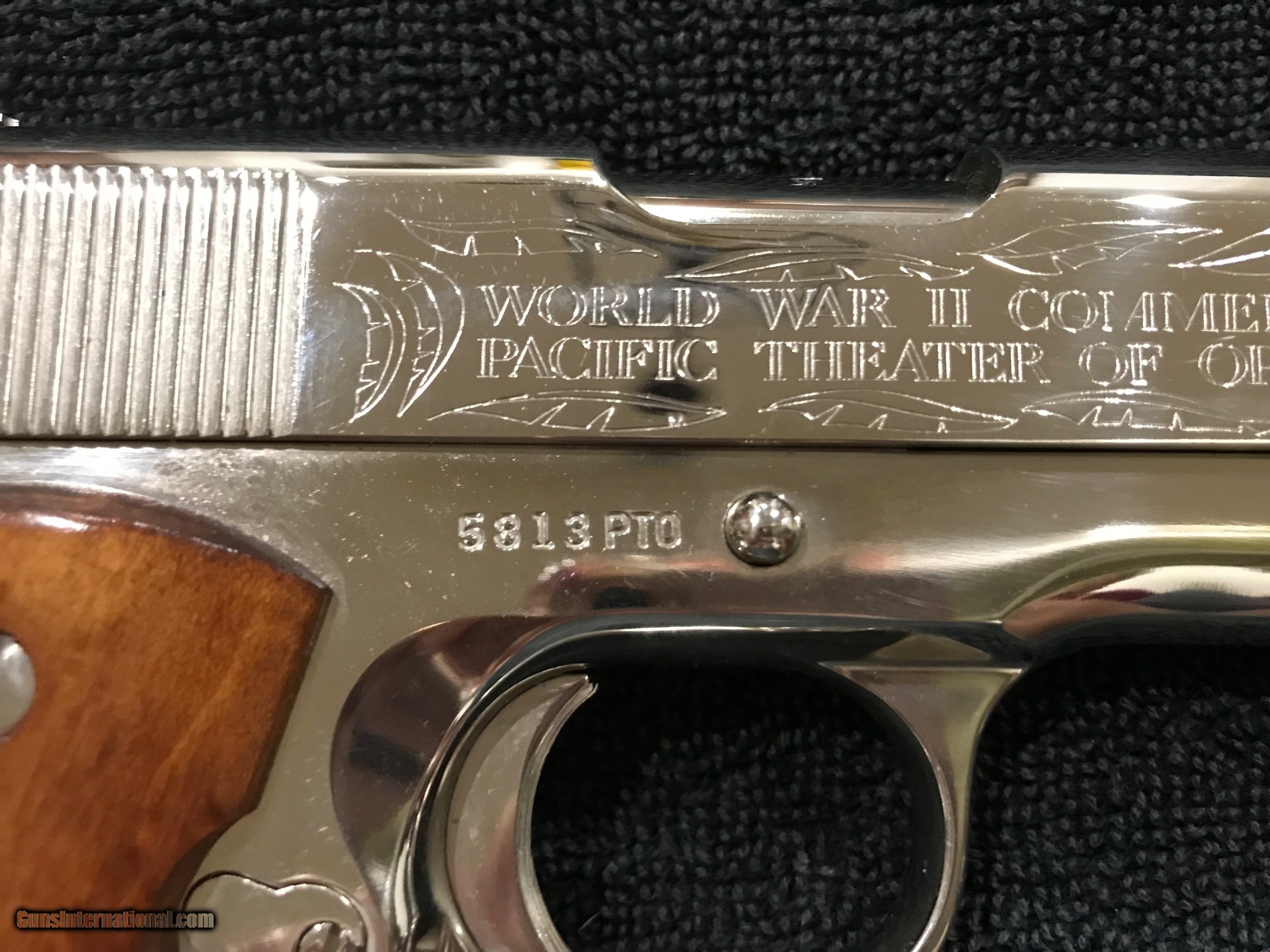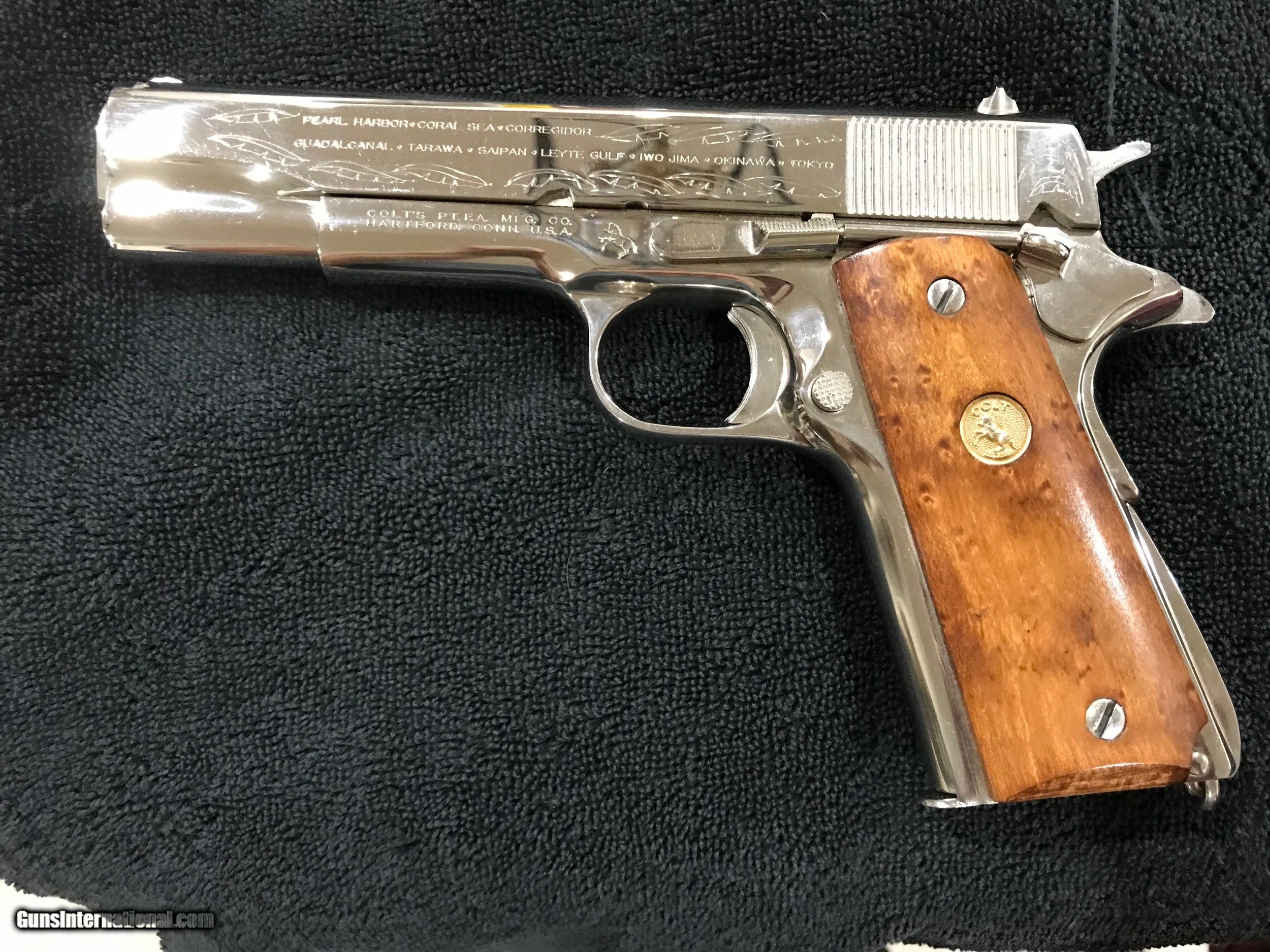 Description: Colt 1911 WWII Pacific Campaign Limited Edition in Presentation Box as shown 45 ACP Price does not include shipping and insurance costs SOLD Handgun Caliber: .45 ACP (.45 Auto) Manufacturer: Colt Model: 1911 Serial Number: 5813PTO Condition: Excellent Metal Condition: Excellent Wood Condition: Excellent Bore Condition: Excellent Case: Wood Item Location: Texas |