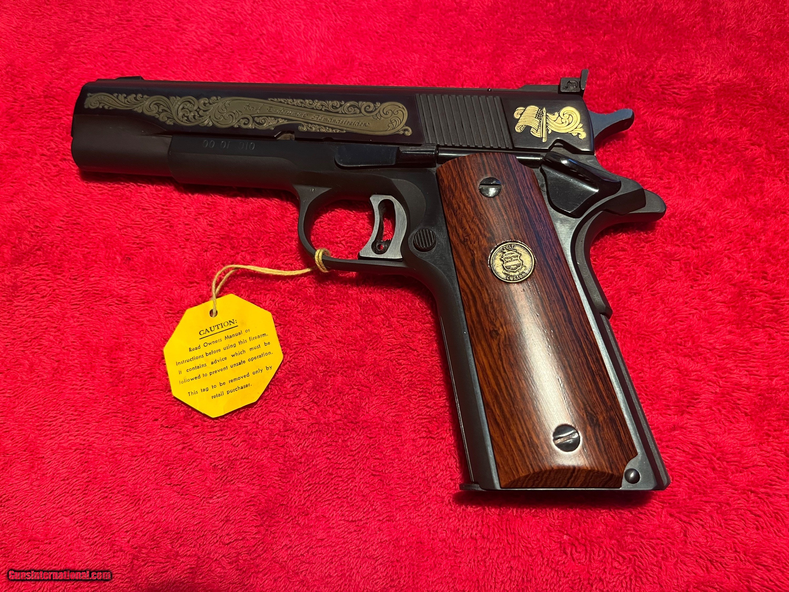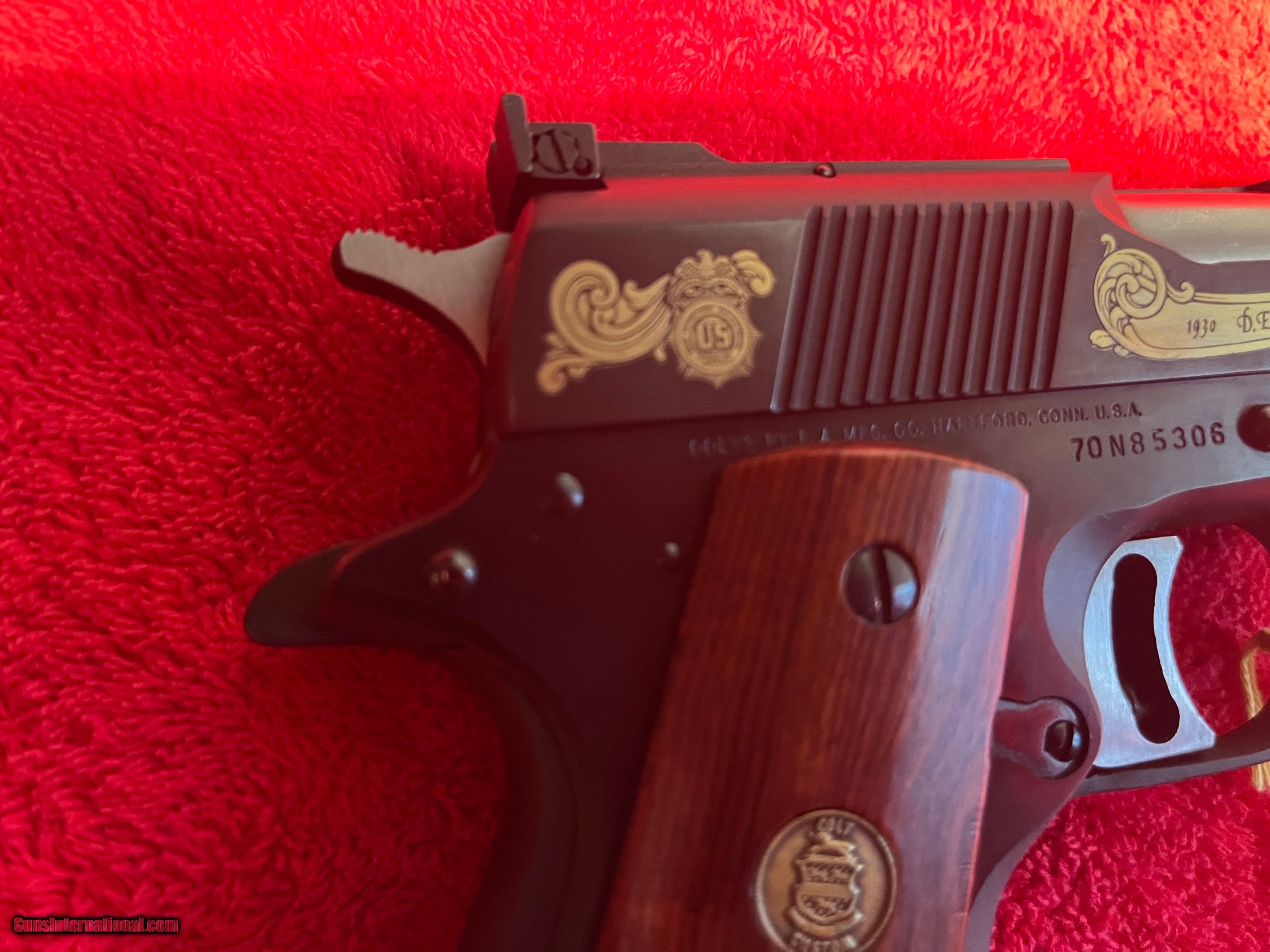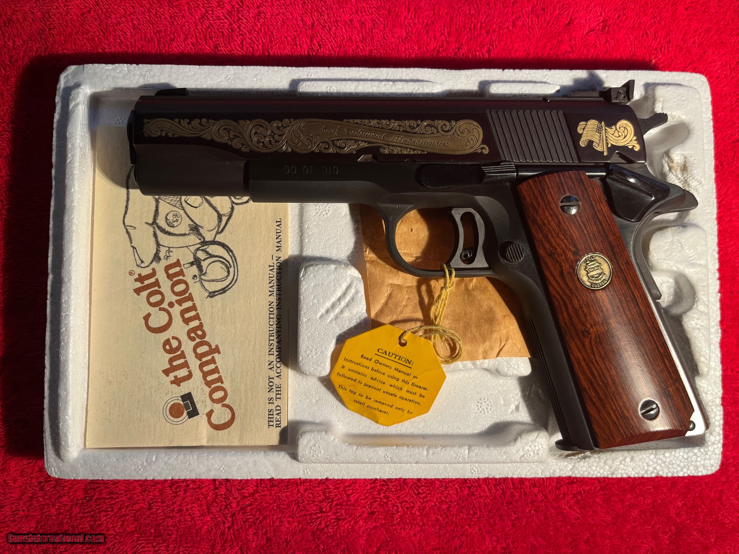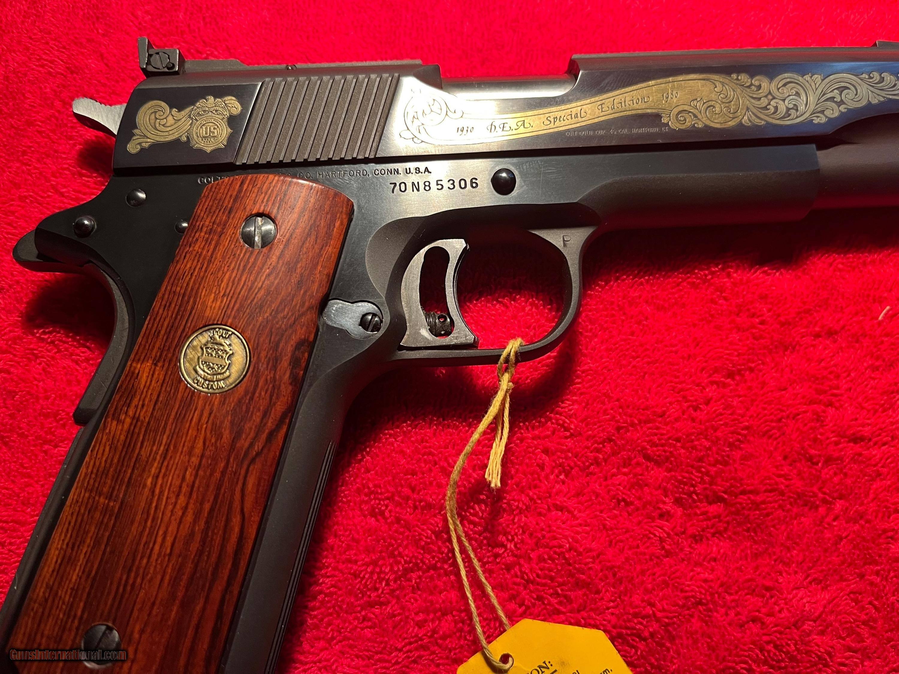 Description: Colt 1911 Series 70 Gold Cup Drug Enforcement Agency special edition from Colt Archives. Number 00 of 910. 45 ACP. Smooth rosewood grips, custom shop medallion inlays. from 5/22/81. Unfired, in shipping box with all documentation. Serial # 70N85306 SOLD Handgun Caliber: .45 ACP (.45 Auto) |