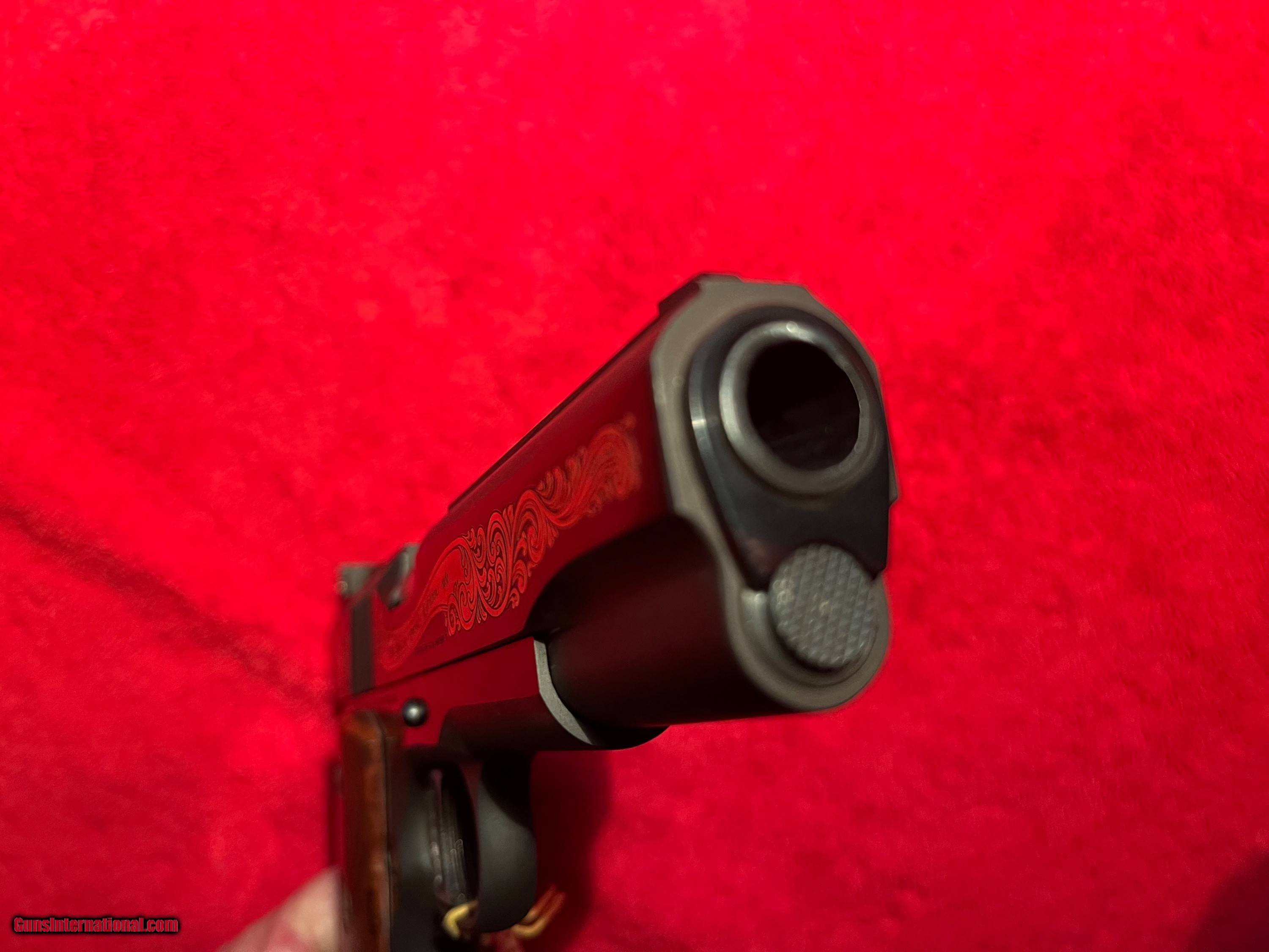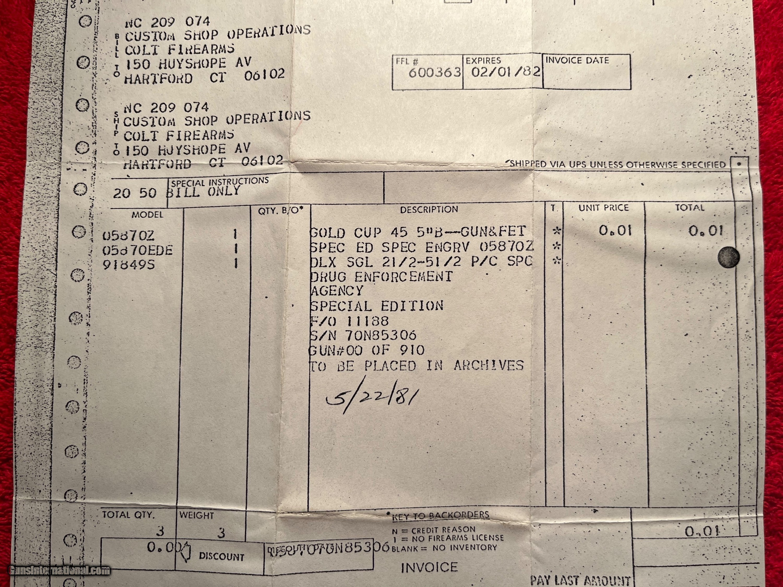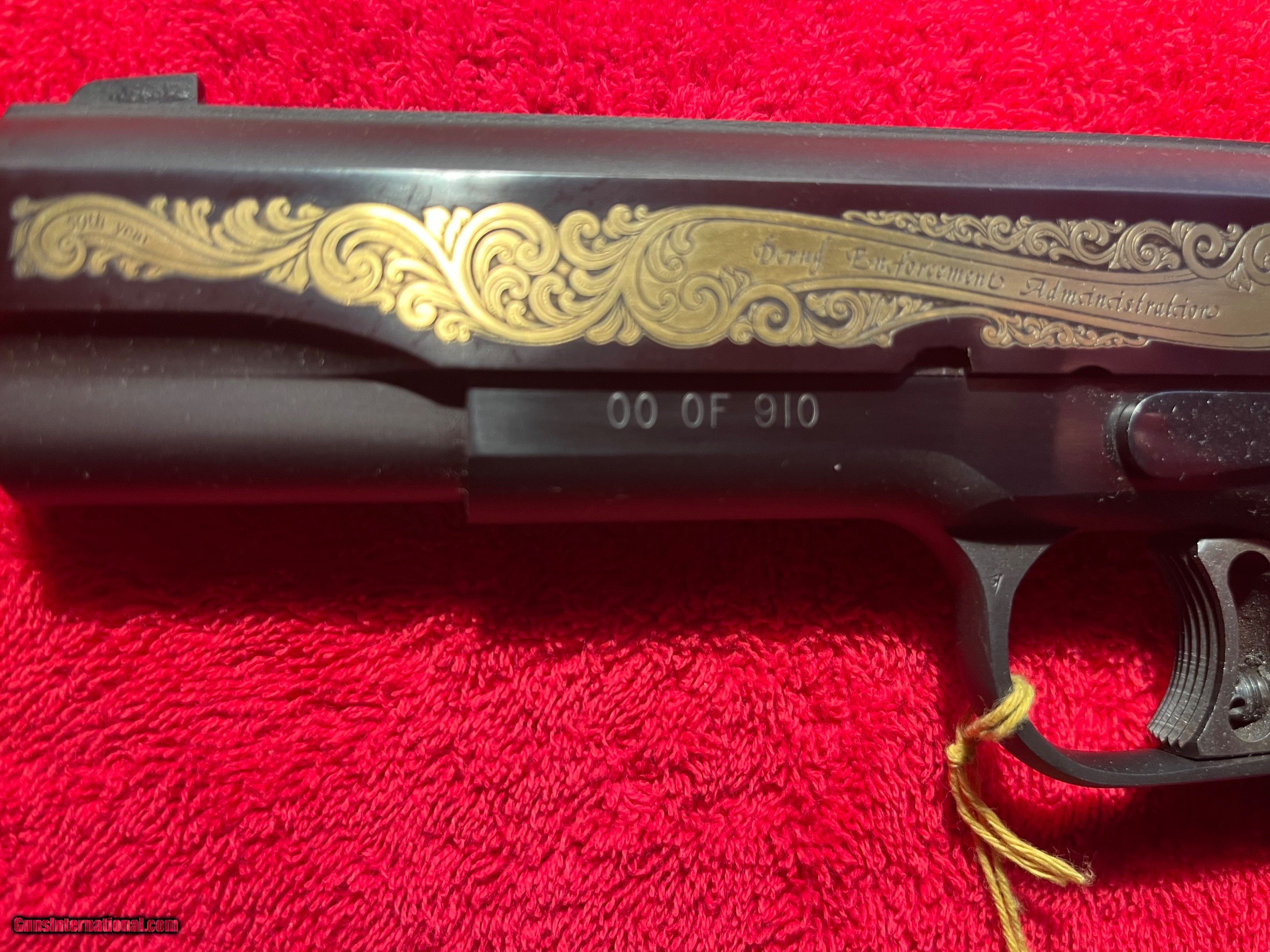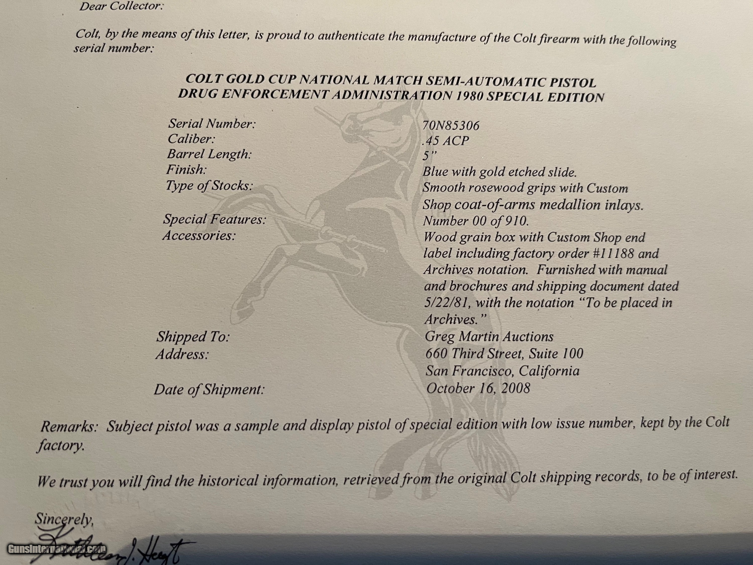 Description: Colt 1911 Series 70 Gold Cup Drug Enforcement Agency special edition from Colt Archives. Number 00 of 910. 45 ACP. Smooth rosewood grips, custom shop medallion inlays. from 5/22/81. Unfired, in shipping box with all documentation. Serial # 70N85306 SOLD Handgun Caliber: .45 ACP (.45 Auto) |