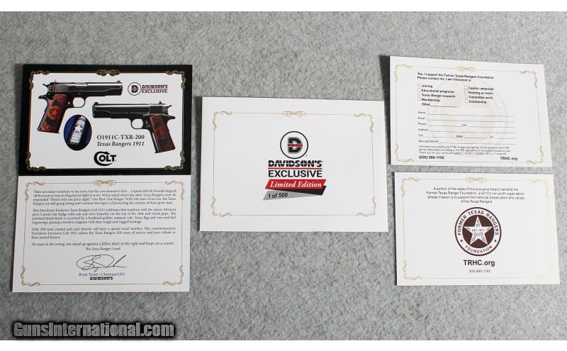 Description: 3-GUN SET FACTORY NEW IN BOX. To commemorate the 200th anniversary of the founding of the Texas Rangers law enforcement agency, this Davidson's exclusive features a three-gun set with a one of 500 produced Colt Series 70 MK IV, one of 200 produced Custom Grade Winchester Model 1895 lever-action rifle, and one of 500 produced High Grade Winchester Model 1895 lever-action rifle. For the Colt Mk IV, features include National Match barrel and a reproduction of the classic Mexican Peso 5-point star badge with oak and olive branches on the top of the slide and wood grips. The Custom-Grade Winchester 1895 features include a Grade V/VI Walnut stock, scroll engraving on the coin-finished receiver, and a reproduction of the Mexican Peso five-pointed star Texas Ranger badge on the stock. The High-Grade Winchester 1895 features a Grade I Walnut stock, scroll engraving on the blued receiver, and a reproduction of the Mexican Peso five-pointed star Texas Ranger badge on the stock. All three come with their original factory boxes with accessories. .45 Auto SOLD Metal Condition: Factory New Wood Condition: Factory New Bore Condition: Factory New Barrels: 5 inch Weight: 2 Lbs 6 Oz Item Location: Fort Worth, TX |