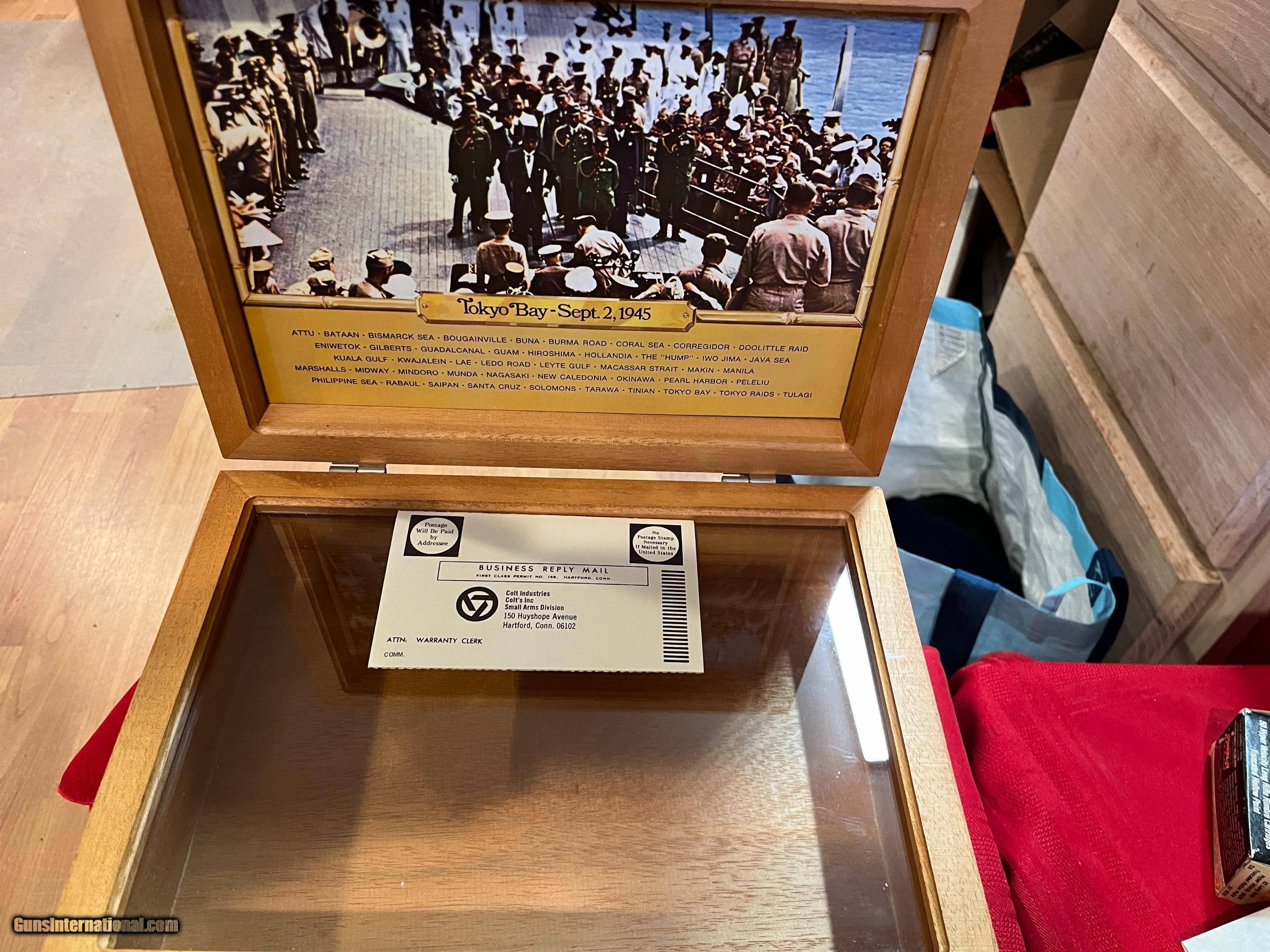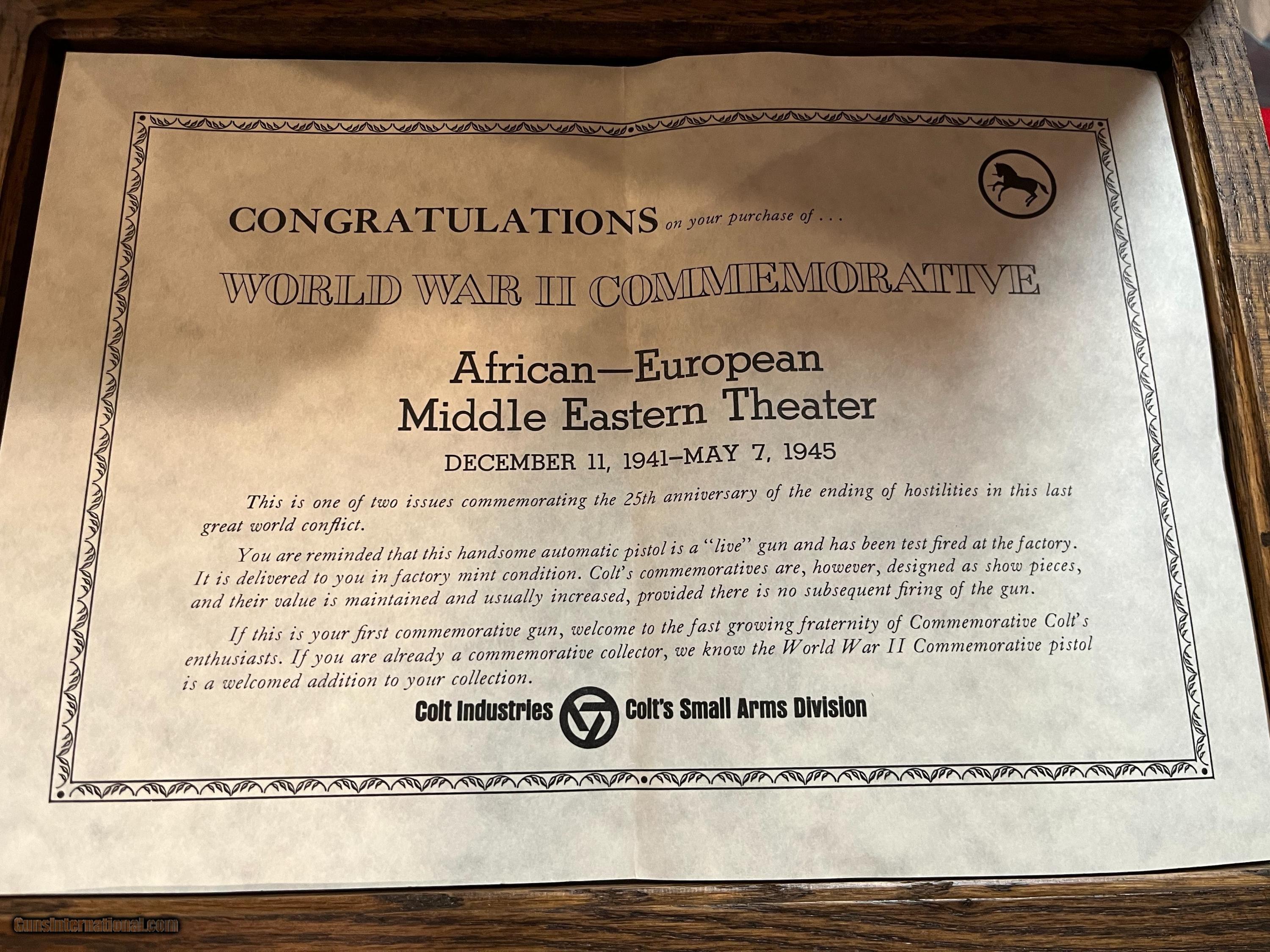 Description: Two 1911 Colt 45 ACP pistols commemorating the Pacific and European Theatres of WW II. Both in presentation cases with paperwork and dummy cartridges. Cases are lockable. $1675 EACH SOLD Handgun Caliber: .45 ACP (.45 Auto) |