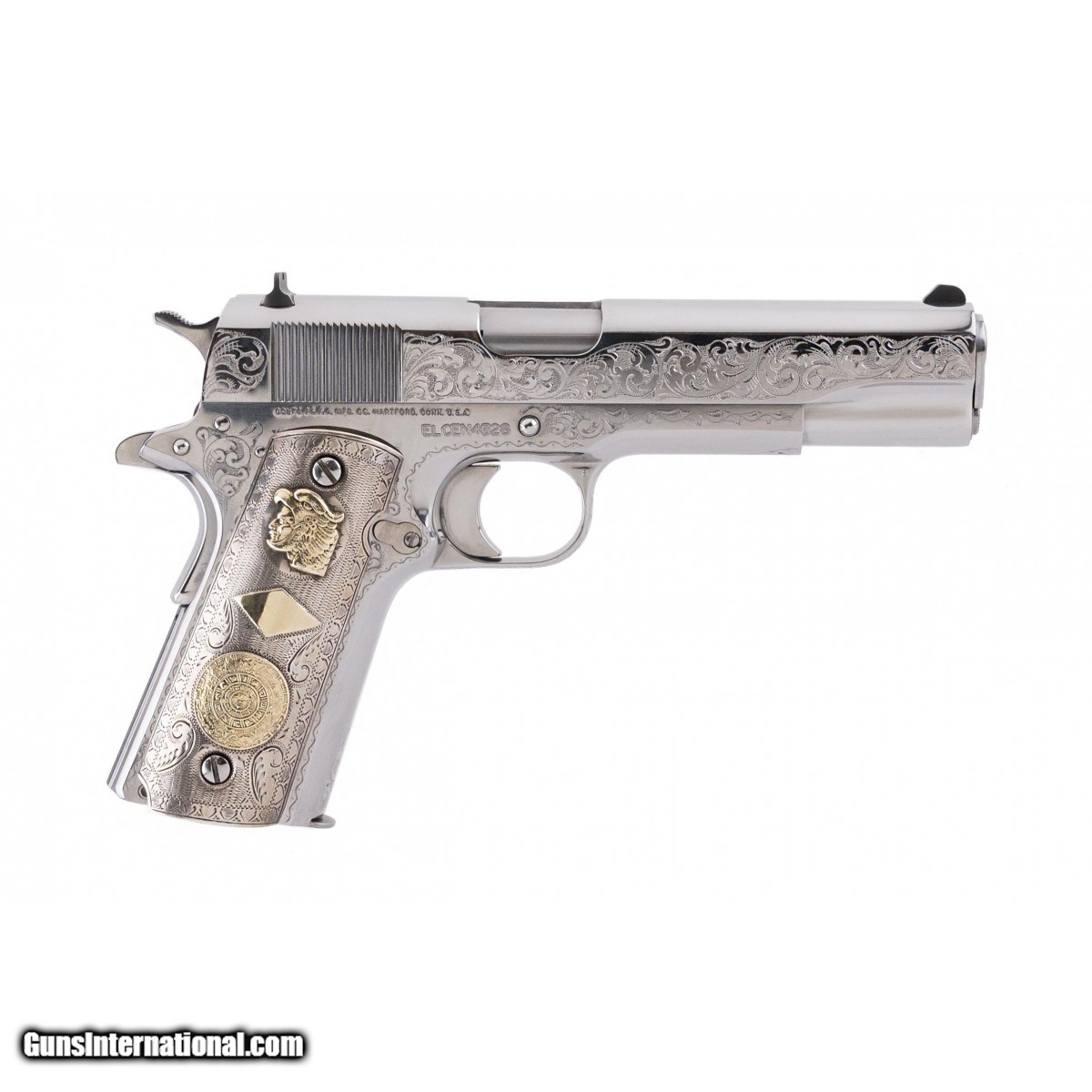 Beautiful factory engraved bright stainless custom shop model with ""Colt Custom"" marked on slide. Has a great set of vintage Mexican silver and gold grips with a very attractive aged look. An outstanding Barbecue gun, in excellent condition with box.