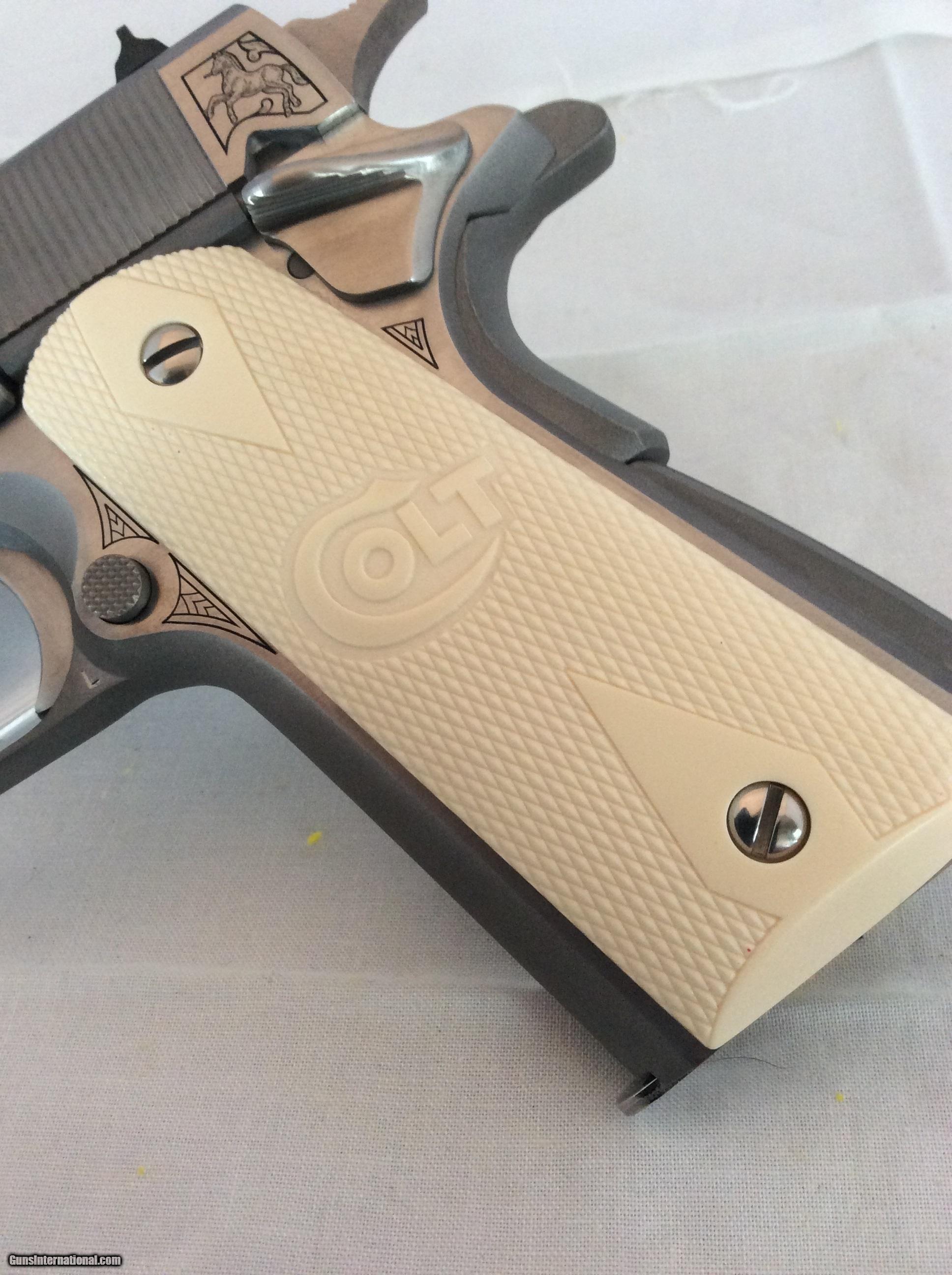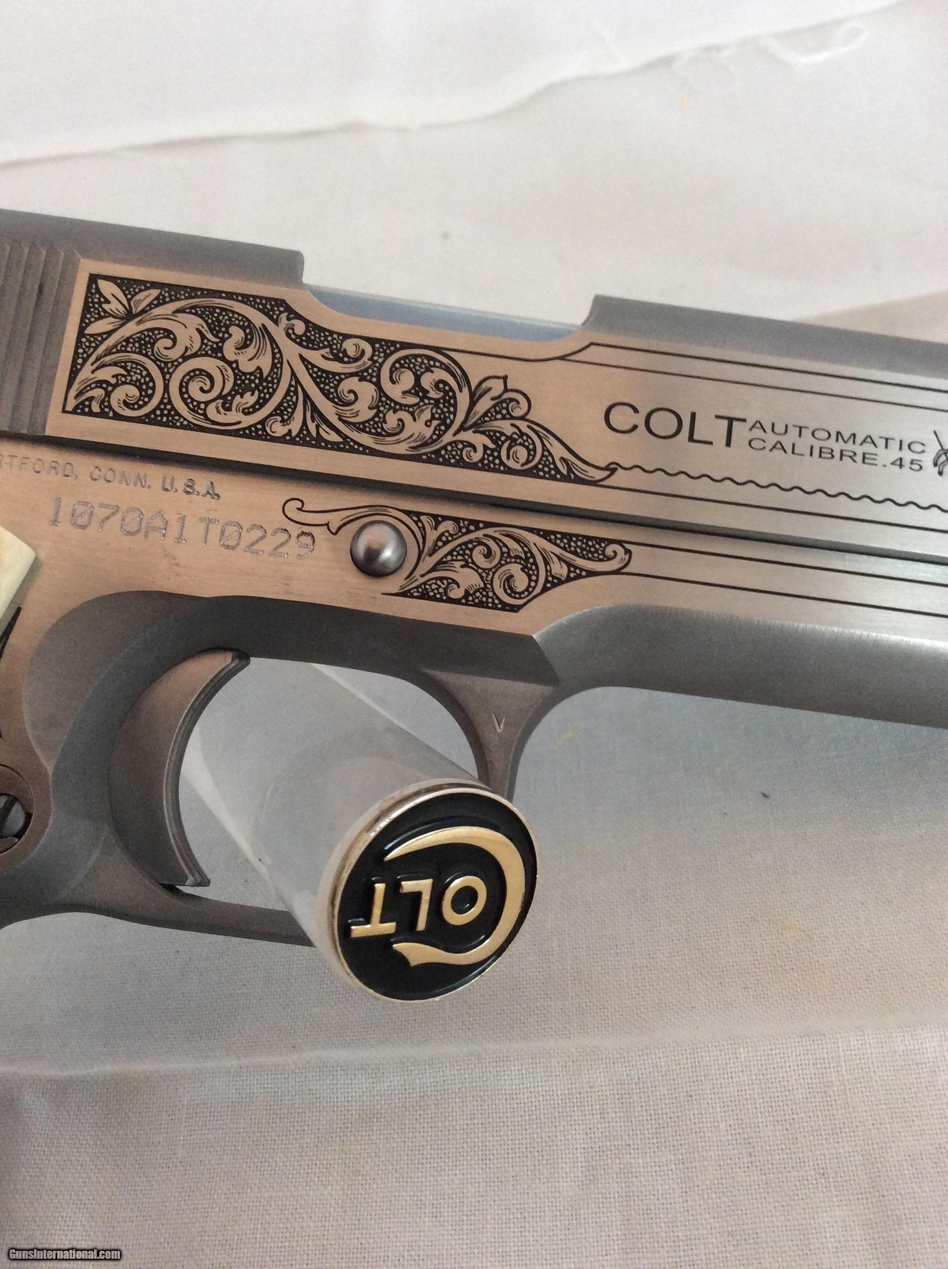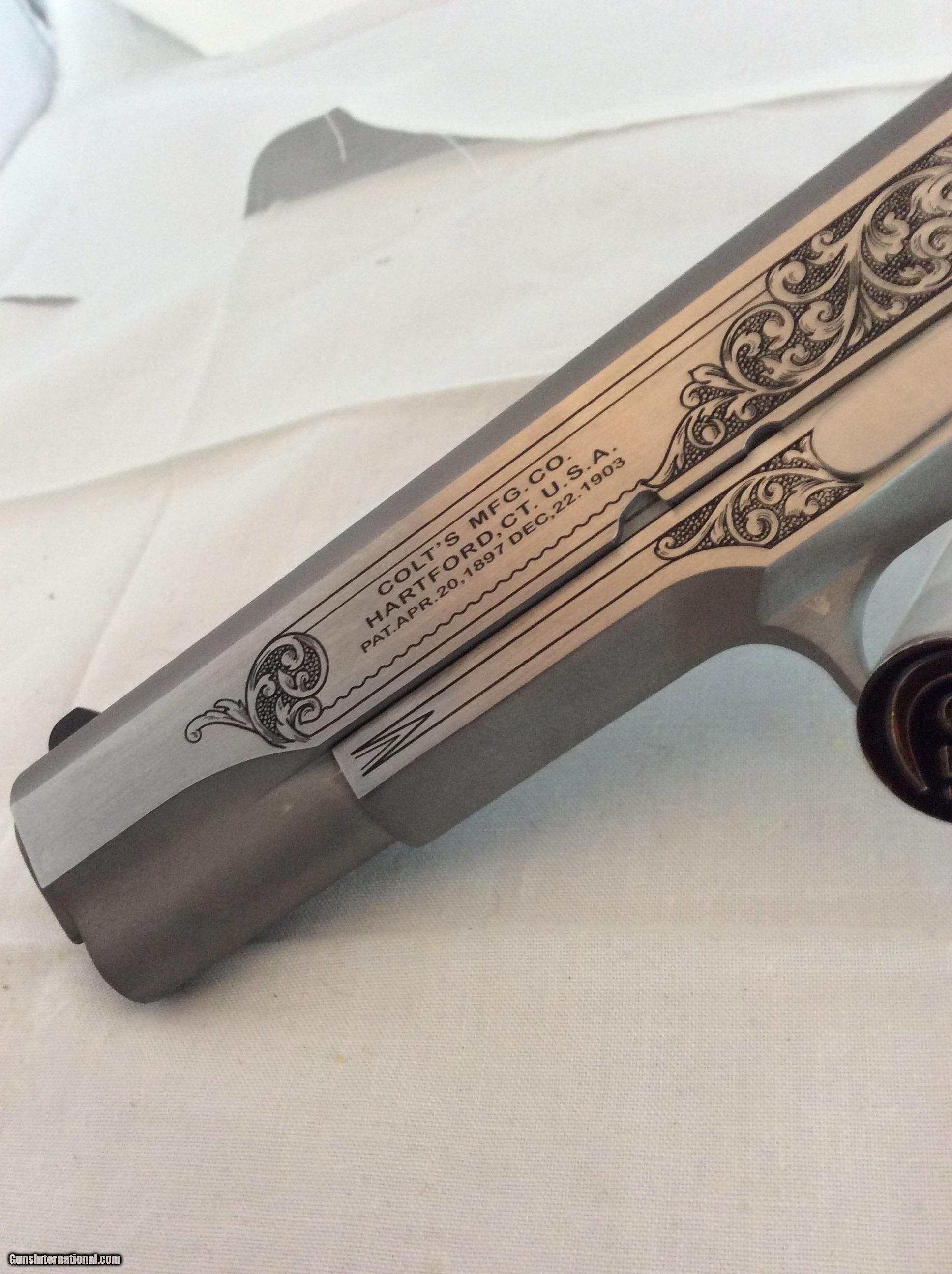 Description: Colt 1911 Custom Shop Glahn series 70. 1 of 300 produced. This is a brushed stainless piece in the style of Colt Master Engraver Wilbur Glahn. Bead blasted etched and antiqued in this Glahn inspired piece. The grips are “Ivory Lite” checkered. Only 300 were made. FFL to FFL transfer, Ships free. Any kind of checks work. SOLD Manufacturer: Colt Model: Glahn Style engraved 1911 Caliber Info: .45 ACP Condition: NIB Metal Condition: NIB Wood Condition: NIB Bore Condition: NIB |