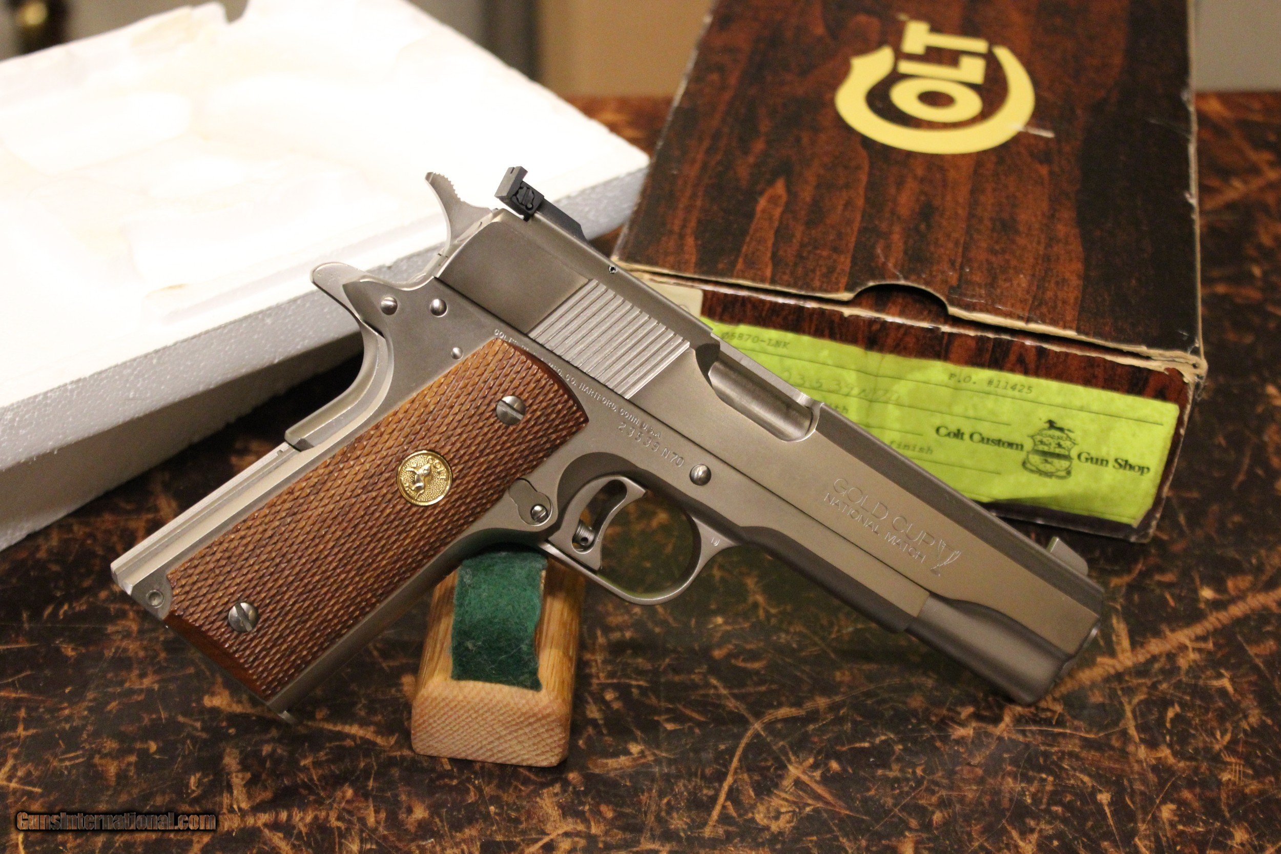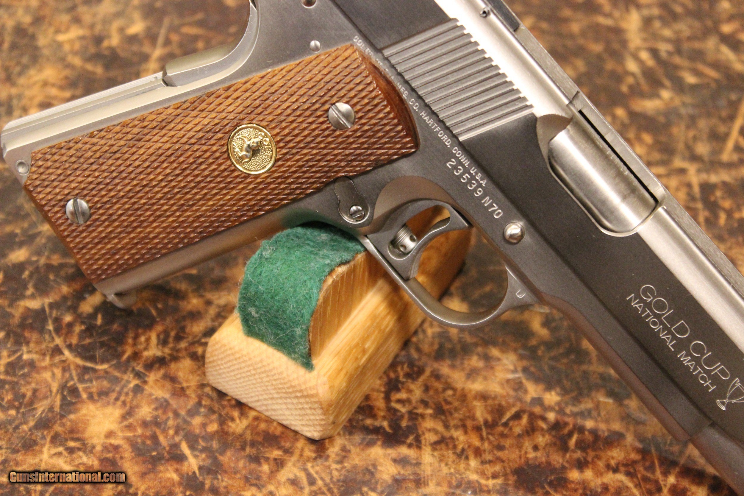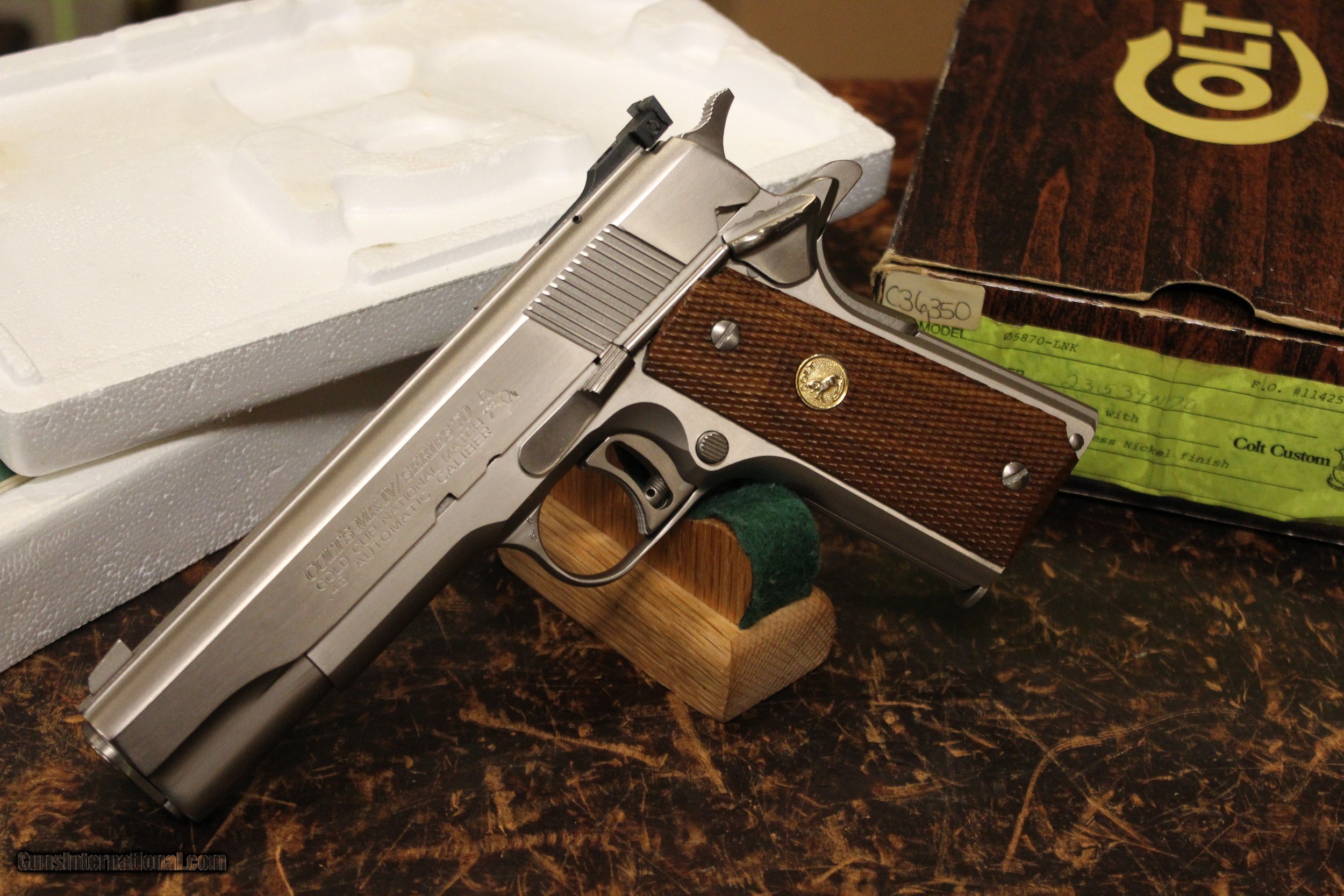 Description: COLT GOLD CUP NATIONAL MATCH IN .45 ACP MATCH AND HARD TO FIND ELECTROLESS NICKEL FROM THE CUSTOM SHOP IN 1982 GUN IS 98% WITH BOX AND PAPERWORK. SOLD |