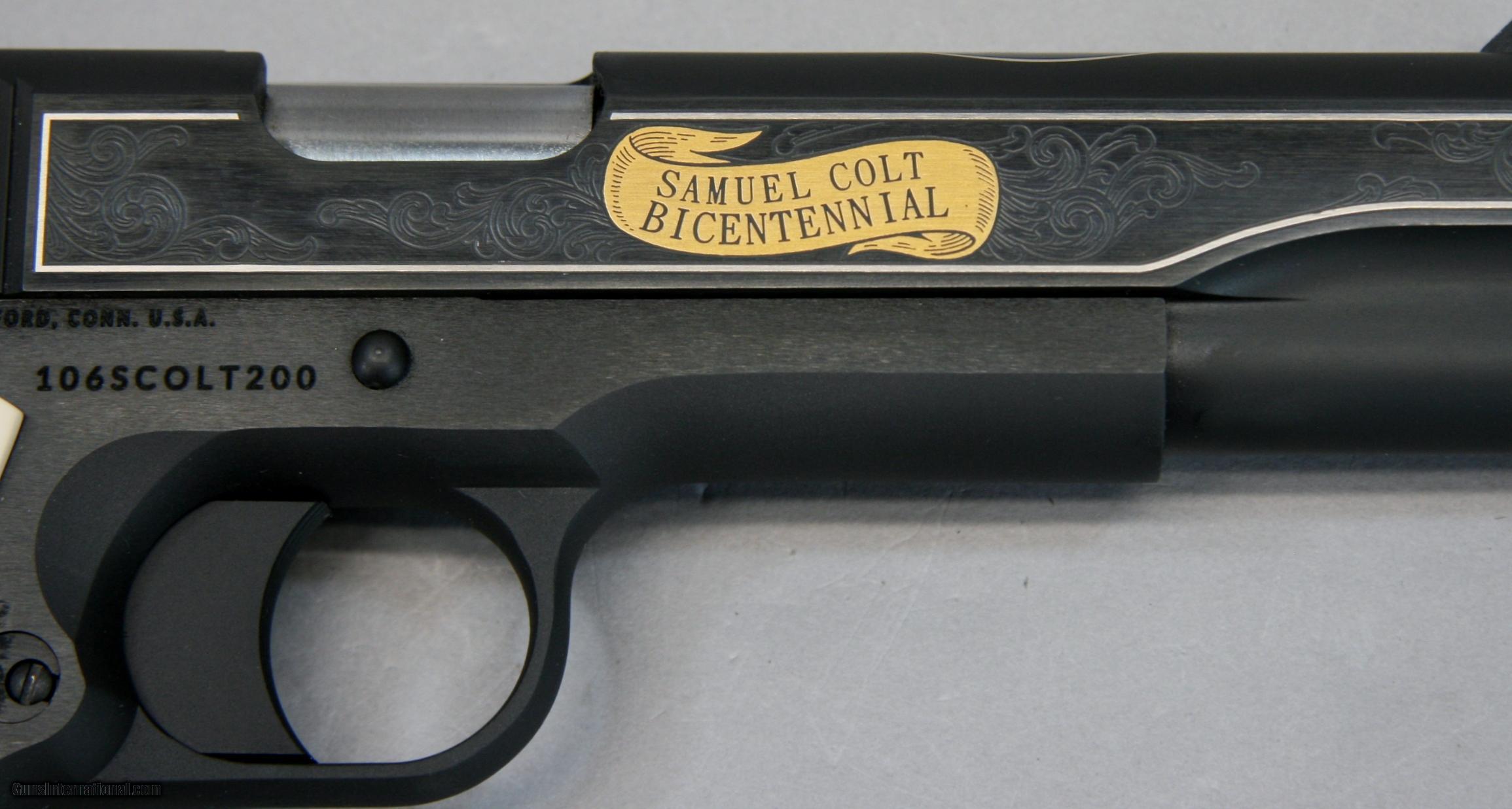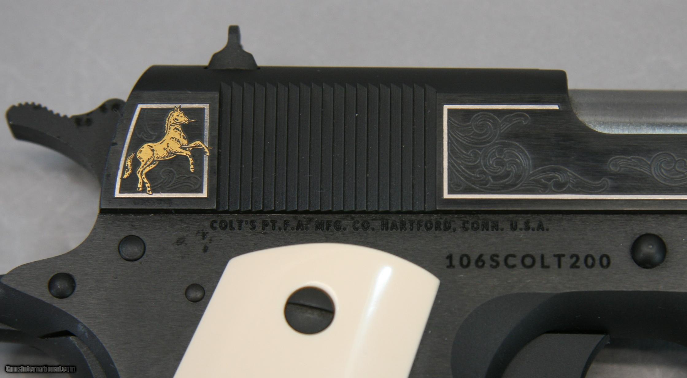 Description: The Colt Custom Shop made 200 Government Model pistols to commemorate Sam Colts 200th birthday in 2014. They are Silver and Gold embellished, engraved and provided with simulated Ivory grips. This is a Consecutive pair in factory new condition, I have not even racked the slide since I received them from Colts. Beautiful examples of the current custom shop efforts. They are in the original Blue boxes with second Mag, Lock and all paperwork. The labeled and numbered outer boxes are in Exc. Original condition. These are a very limited production commemorative guns sure to grow in value .45 ACP Cal. with a 5 ½” Barrel. Serial Numbers: 105SCOLT200 & 106SCOLT200 FFL Required. Beaver Creek Arms TERMS & CONDITIONS Objective: As a collector of 35 years and Licensed Firearms Dealer since 1989 I have a clear definition of a satisfactory transaction. I will be paid as we agreed to, and you will be satisfied with your purchase. My goal is to establish a client list of satisfied repeat customers who will recommend me to other collectors. It’s just that simple. Exiled Saudi princes with secret funds needing change from an over paid purchase need not apply. Notice: ALL Federal, State, & Local firearms laws will be followed. I will take NO shortcuts in the process of a legal sale or transfer, so please don’t ask. SHIPPING: Normally shipments are made via U.S.P.S. Priority Mail, Insured, with a return receipt. Typical Packing, Shipping and Insurance cost for a handgun is $30.00, and for a Long Gun is $45.00. Availability: All items are in stock and available for immediate shipment. Please call or email and an Item will be held up to a week with your Name, Address, & Phone Number. Items marked Reserved are being held for awaiting payment or on layaway. If you are interested in a reserved item, please call or E-Mail to be placed on a backup list. FIREARMS: Modern firearms, post 1898, can only be shipped to a Type 01 Federal Firearms License address. Curio-Relic firearms, as defined by the BATF list, can usually be shipped to a Type 03 Collectors License address. Some states have additional restrictions such as CA, CT, DC, IL, MD, NJ and NY. A signed valid FFL license copy either mailed or emailed will be required for shipment to only the license address. Antique firearms, pre 1898 do not require a Federal License. For purchase, a copy of a Government Issued Identification (Driver’s License, Etc.), showing date of birth and current address will be required. GUARANTEE: Your complete satisfaction is assured, see objective above. If you are not satisfied, please contact me within 3 days of receipt. Please don’t fire the weapon, safety, function and accuracy are NOT Guaranteed. Any weapon offered by Beaver Creek Arms is never test fired nor is there any representation the gun is functional and safe to fire. These guns are sold for collectors and only represented as used firearms that must be checked by a competent person, observe all the necessary safety precautions prior to attempting to load and fire one of these weapons RETURNS: Returns must be made within 3 days of receipt. They must be received in exactly the same condition with no parts exchanged. If it has been altered, damaged, or fired, a refund will not be made. Packing, shipping and insurance cost will not be refunded. All layaway purchases are returnable for merchandise credit only. Sales: All sales are made with the buyer’s full acceptance of the stated terms of sale. All sales are made in strict compliance with all Federal Firearms Laws. No items contained in thissite are offered for sale where prohibited by any Federal, State or Local laws. By ordering, the buyer certifies that their purchase will be in full compliance with all Federal, State and Local laws. All transactions shall be deemed to occur in Pennsylvania regardless whether by telephone, mail, internet or the physical location of the buyer. All transactions will be subject only to Federal and Pennsylvania State law. Any disputes will be resolved in a Pennsylvania Court. PAYMENT: Bank check, Personal check, and Money Orders are preferred. Visa and MasterCard are accepted with a 3% processing fee. For Visa and MasterCard orders please provide the account number, code number, expiration date, name on card, phone number and card billing address. This information can be phoned in, or E-Mailed. All orders must be paid in advance, C.O.D. orders are not accepted. Checks, both Bank and Personal must clear before the order will be shipped, usually a 2 week delay. LAYAWAYS: A 20% deposit is required. Balance is due in 60 days. Deposits are non-refundable and are forfeited after 60 days. Layaway sales are returnable for merchandise credit only. SALES TAX: Pennsylvania state sales tax is 6% for in state purchases. The payment of other states sales tax, if applicable, for shipped items is the buyer’s responsibility. DISCREET: Client information will remain Confidential. Your privacy is protected. SOLD |