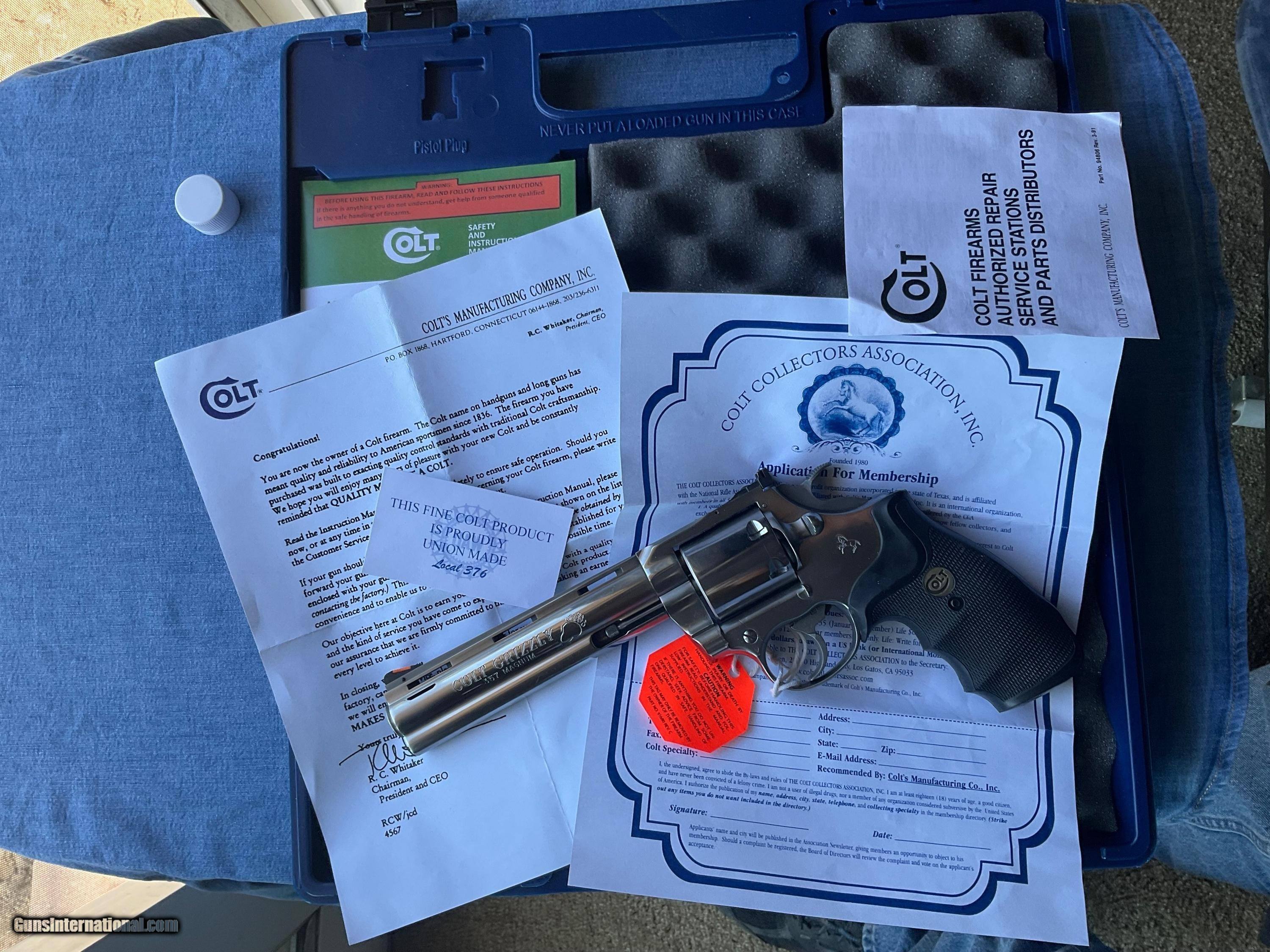 Description: GRIZZLY This is a UNFIRED Colt Grizzly 357 mag Stainless "LIMITED EDITION CUSTOM SHOP MODEL" HOLY GRAIL COLT SNAKE In excellent condition. Colt Grizzly's have sold for between 11K and 15K over the last six months with two selling last week for 11K+. On GB. PRICED TO SELL !!! Payment - Moneyorder /. Price includes overnight shipping SOLD Handgun Caliber: .357 Magnum Manufacturer: Collt Model: Grizzly Serial Number: CGZ381 Condition: Unfired |