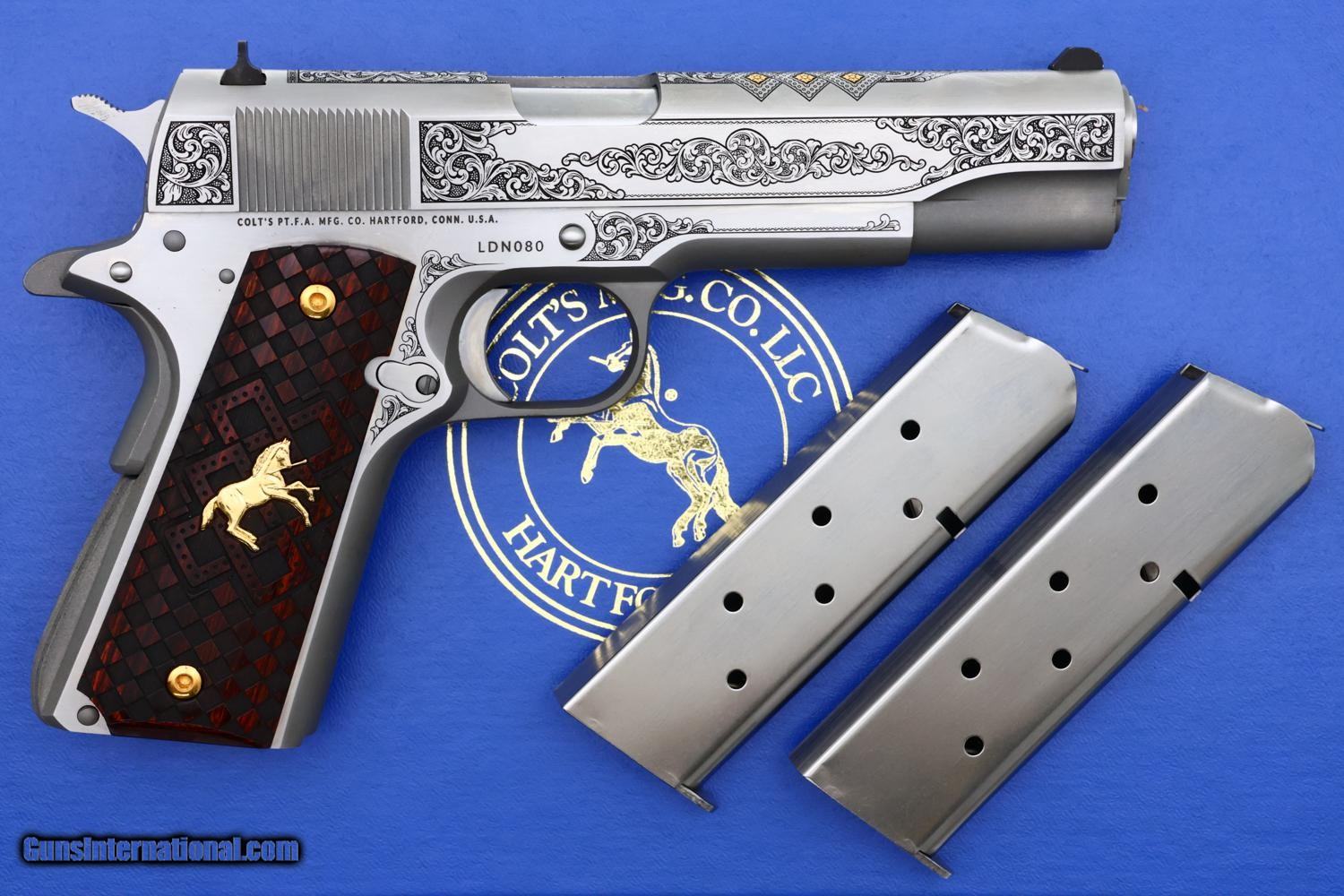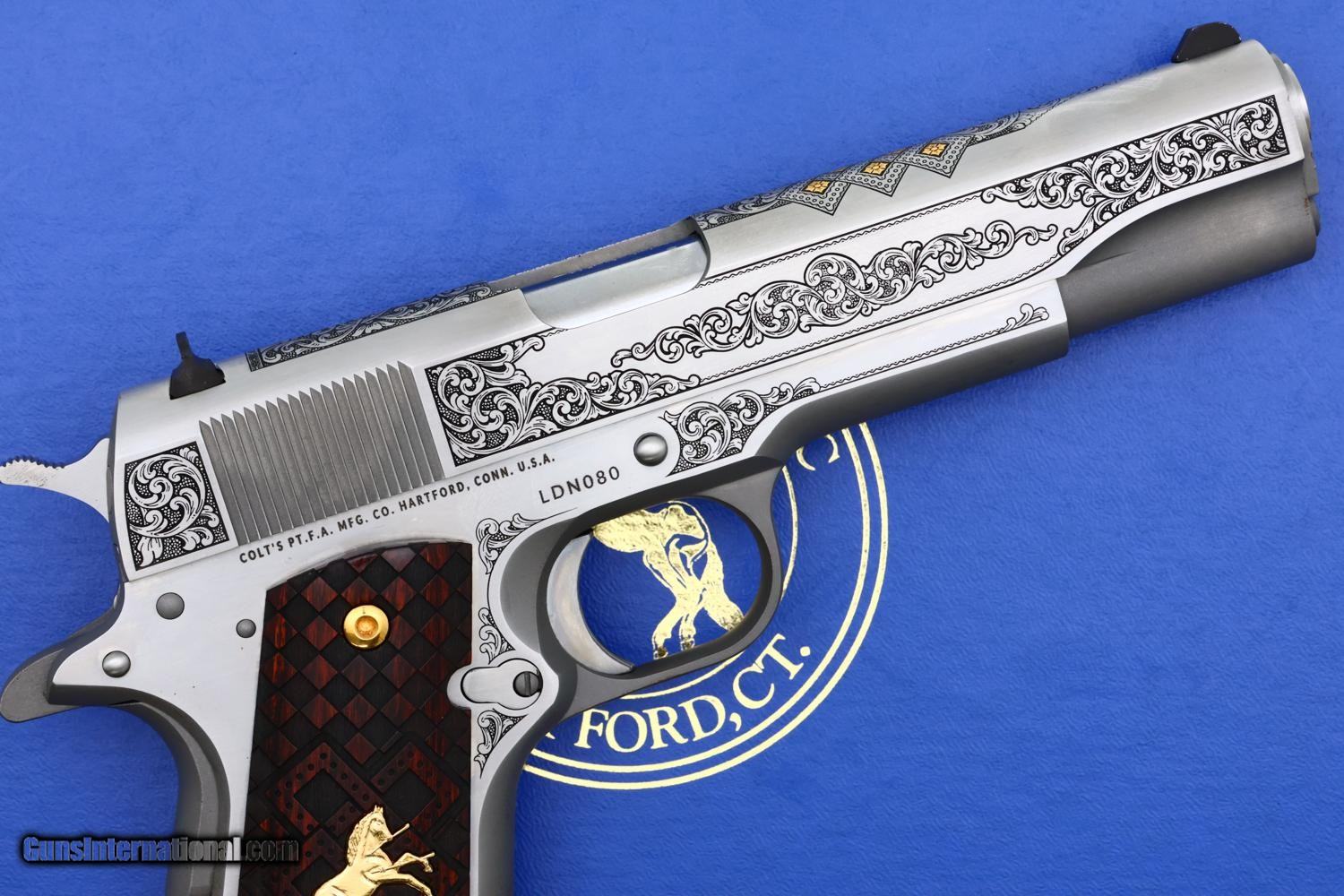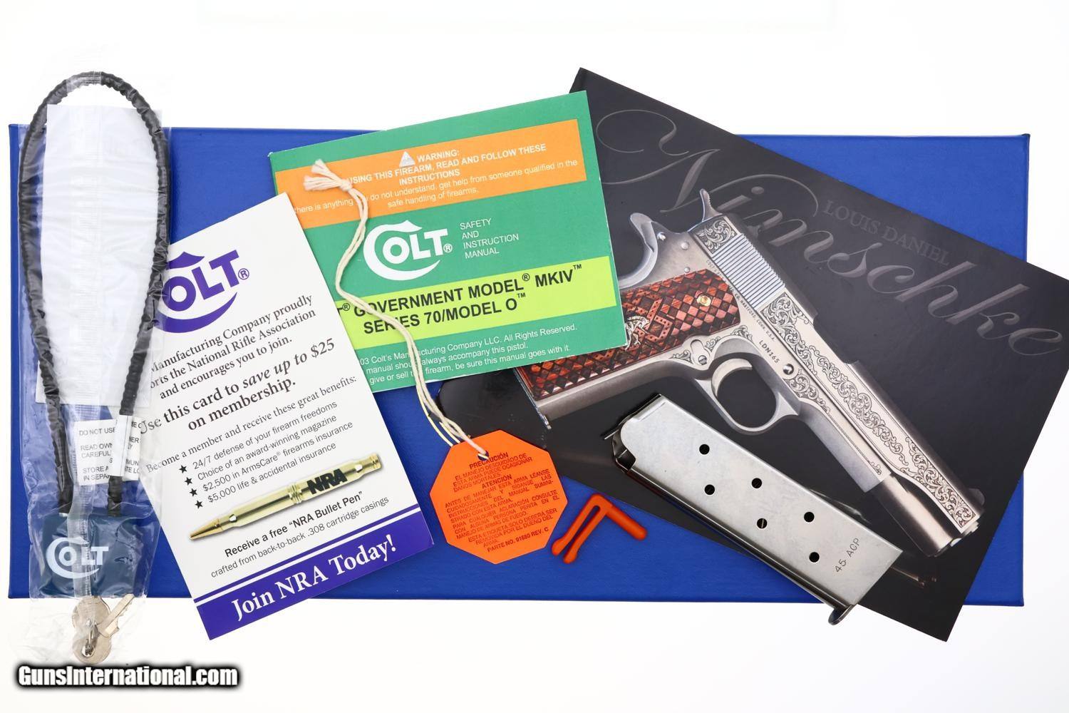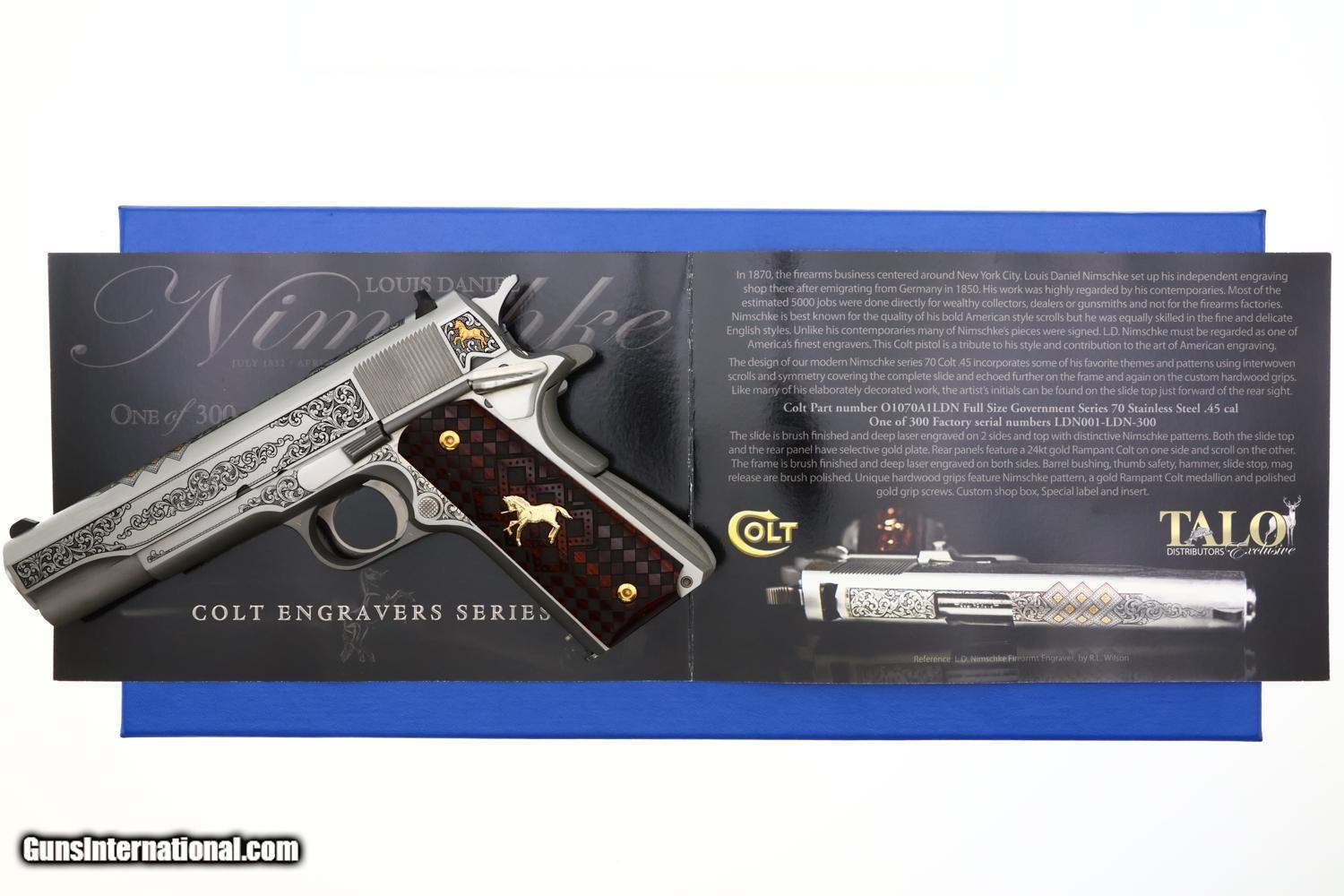 Phenomenal, Limited Edition, Colt-Louis Daniel Nimschke (LDN) Engraver's Series Government Model as commissioned by TALO Distributors, in .45 ACP, SN: LDN080, one of 300 pistols in serial range LDN001-LDN300, a brush finished pistol with extensive custom scroll engraving throughout the slide and frame. The slide is especially ornate, with geometric diamond patterns supplemented by gold accents on top, "LDN" artist's initials forward of the rear sight, and a gold rampant colt on the left side behind the serrations. Blued front and drift adjustable rear sights. Top of exposed barrel marked "COLT 45 AUTO". Right side of frame marked "COLT'S PT.F.A. MFG. CO. HARTFORD, CONN. U.S.A." followed by serial number "LDN080". Dark wood grips with unique Nimschke pattern, gold rampant colt medallions on each panel, and gold allen-head grip screws. Includes two brush finished magazines with 6 indicator holes, left side having ".45 ACP" marking and "COLT 45 AUTO 8-RD" marking on floorplates. Blue Colt box with Colt Logo in gold, "One of 300" Talo Distributors flyer, owners manual, lock, hang tag, and chamber safety flag. Complete in original white shipping sleeve with "Nimschke" and "COLT ENGRAVERS SERIES" on top, end label referencing make, model, caliber, finish, barrel length, and serial number. This commemorative piece honors Louis Daniel Nimschke, a master firearms engraver, who worked from 1850 to 1904 and engraved over 5,000 firearms for major manufacturers including Colt, and created what became known as the "Nimschke School" or "New York Style" of engraving.?