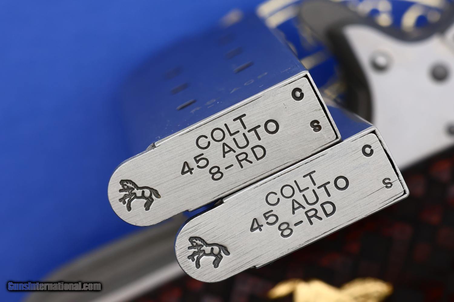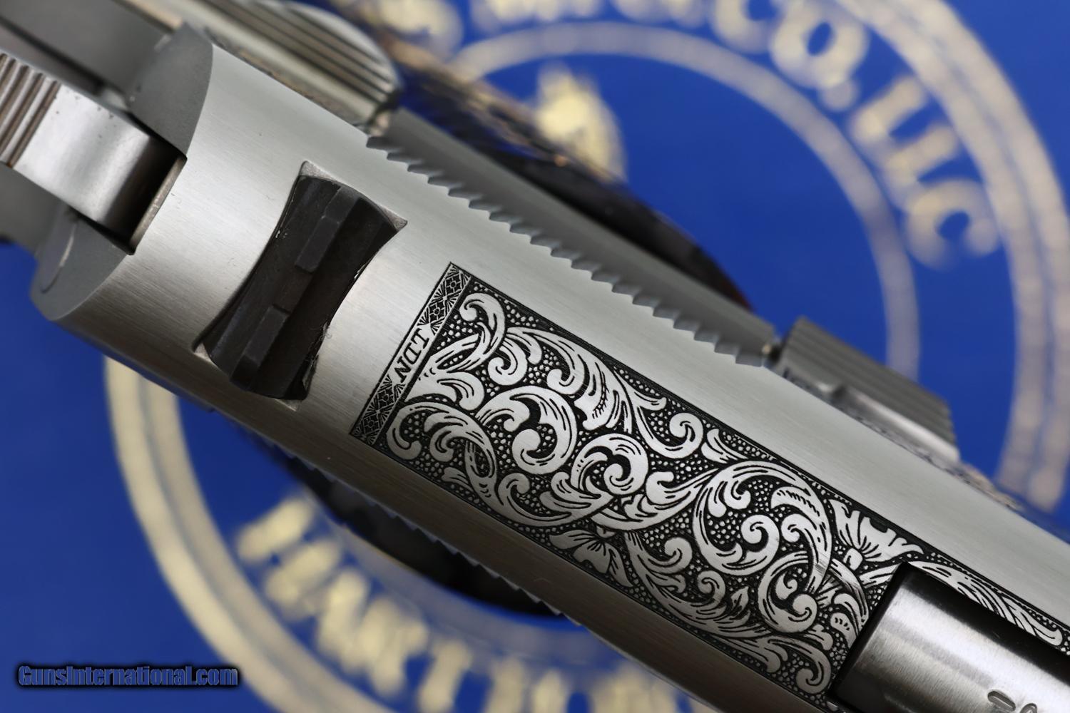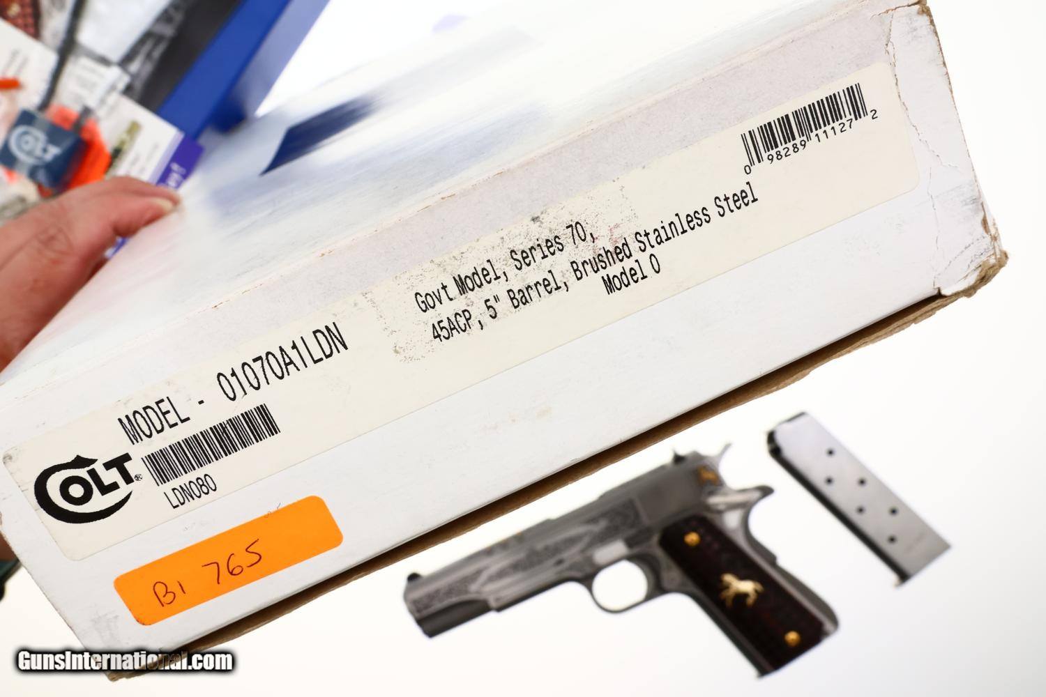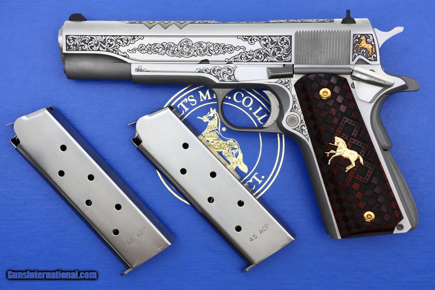 Phenomenal, Limited Edition, Colt-Louis Daniel Nimschke (LDN) Engraver's Series Government Model as commissioned by TALO Distributors, in .45 ACP, SN: LDN080, one of 300 pistols in serial range LDN001-LDN300, a brush finished pistol with extensive custom scroll engraving throughout the slide and frame. The slide is especially ornate, with geometric diamond patterns supplemented by gold accents on top, "LDN" artist's initials forward of the rear sight, and a gold rampant colt on the left side behind the serrations. Blued front and drift adjustable rear sights. Top of exposed barrel marked "COLT 45 AUTO". Right side of frame marked "COLT'S PT.F.A. MFG. CO. HARTFORD, CONN. U.S.A." followed by serial number "LDN080". Dark wood grips with unique Nimschke pattern, gold rampant colt medallions on each panel, and gold allen-head grip screws. Includes two brush finished magazines with 6 indicator holes, left side having ".45 ACP" marking and "COLT 45 AUTO 8-RD" marking on floorplates. Blue Colt box with Colt Logo in gold, "One of 300" Talo Distributors flyer, owners manual, lock, hang tag, and chamber safety flag. Complete in original white shipping sleeve with "Nimschke" and "COLT ENGRAVERS SERIES" on top, end label referencing make, model, caliber, finish, barrel length, and serial number. This commemorative piece honors Louis Daniel Nimschke, a master firearms engraver, who worked from 1850 to 1904 and engraved over 5,000 firearms for major manufacturers including Colt, and created what became known as the "Nimschke School" or "New York Style" of engraving.?