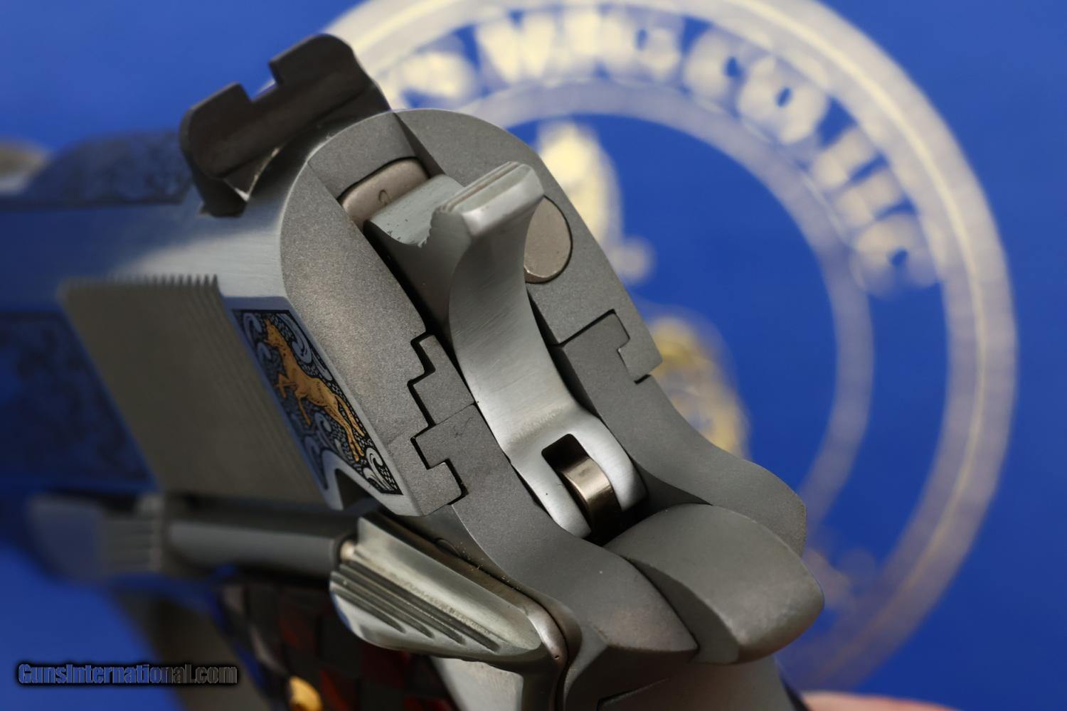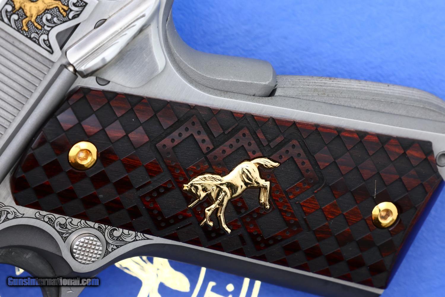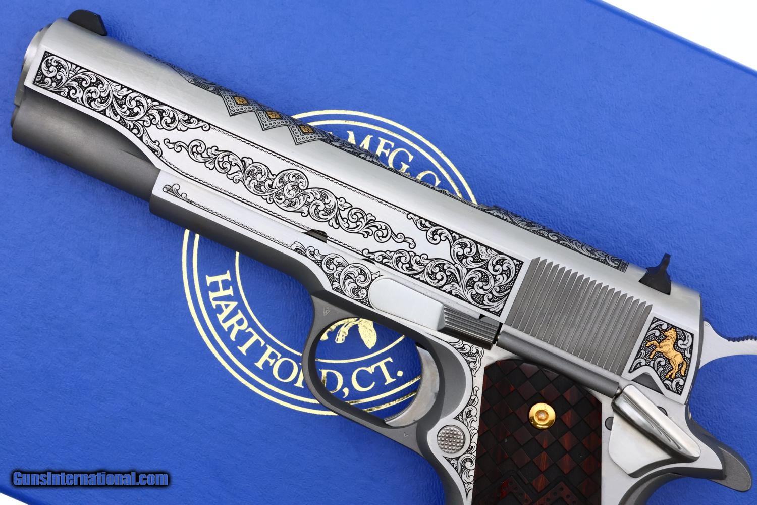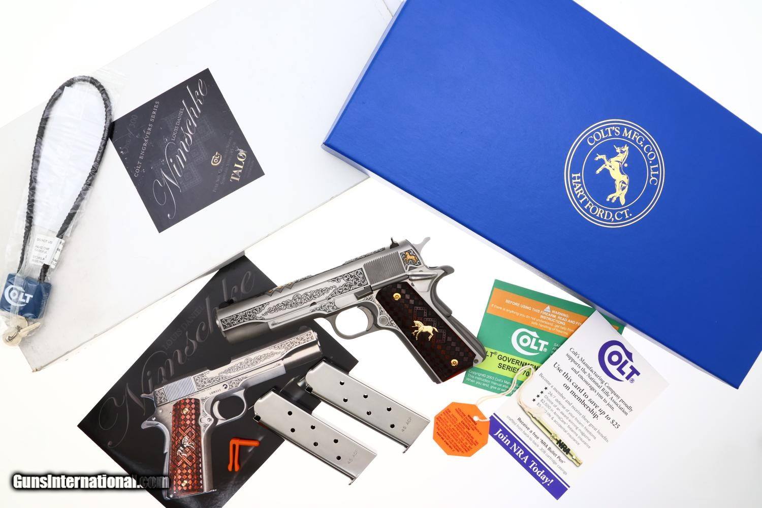The Colt Nimschke Engravers Series Government Model as commissioned by TALO Distributors is a limited edition .45 ACP pistol with extensive custom scroll engraving and gold accents, commemorating master engraver Louis Daniel Nimschke (LDN serial number prefix) with only 300 units produced, in pristine condition, complete with ALL accessories and shipping boxes.