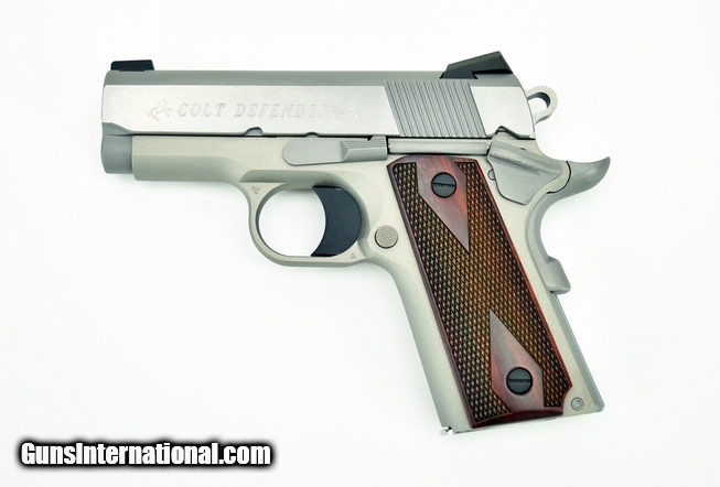 Description: Colt Defender Lightweight .45 ACP caliber pistol. 3” model with alloy frame and thin rosewood grips.