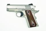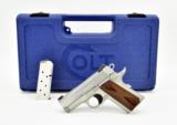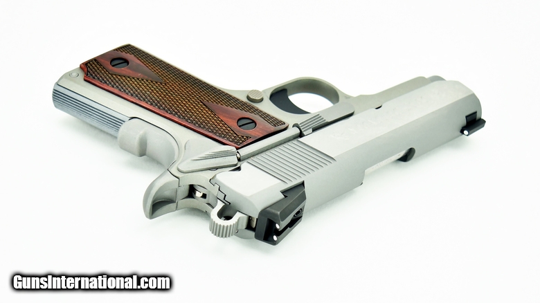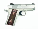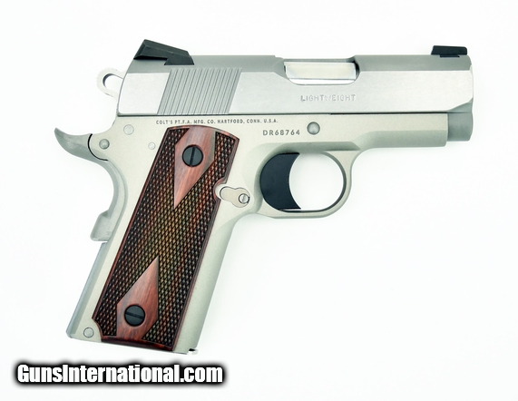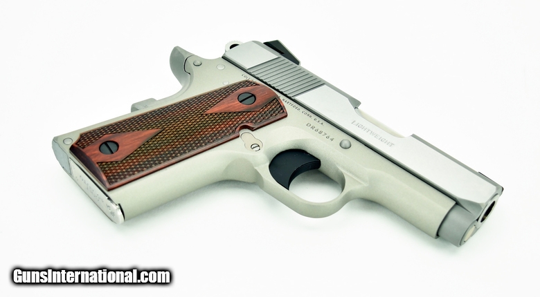 Colt Defender Lightweight .45 ACP caliber pistol. 3” model with alloy frame and thin rosewood grips.