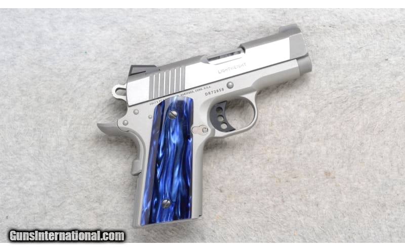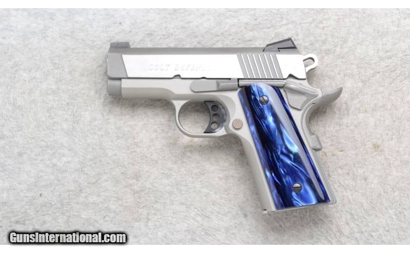 Description: This Colt Model Defender Lightweight is a stainless steel right hand semi-auto pistol in .45 ACP Cal. It has a 3.25 inch barrel with a rear serrated slide. A blade front sight and notch rear sight with white sight dots. The grip panels are a smooth two color blue plastic. It has a grooved 3 hole trigger. .45 ACP SOLD Chambers: 8 round magazine. Metal Condition: Excellent. Bore Condition: Excellent. Barrels: 3.25 inch barrel with a rear serrated stainless steel slide. Triggers: 3 hole. Grooved. Weight: 28 oz. Sights: Blade front. Notch rear. White sight dots. Item Location: Richfield, WI |